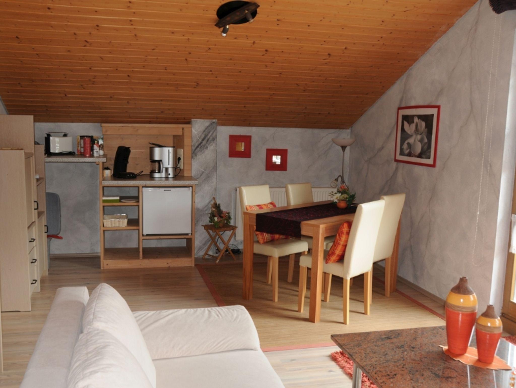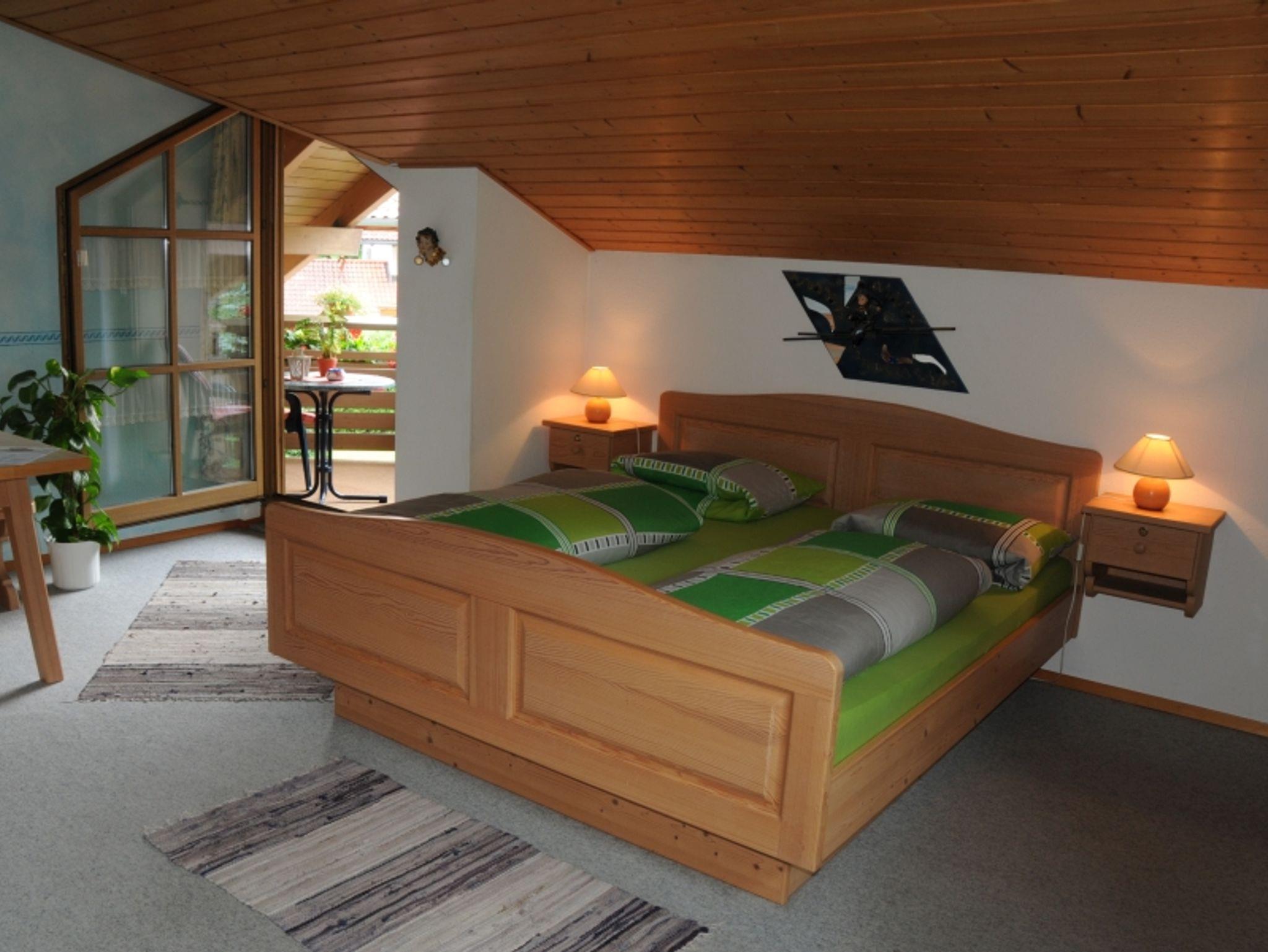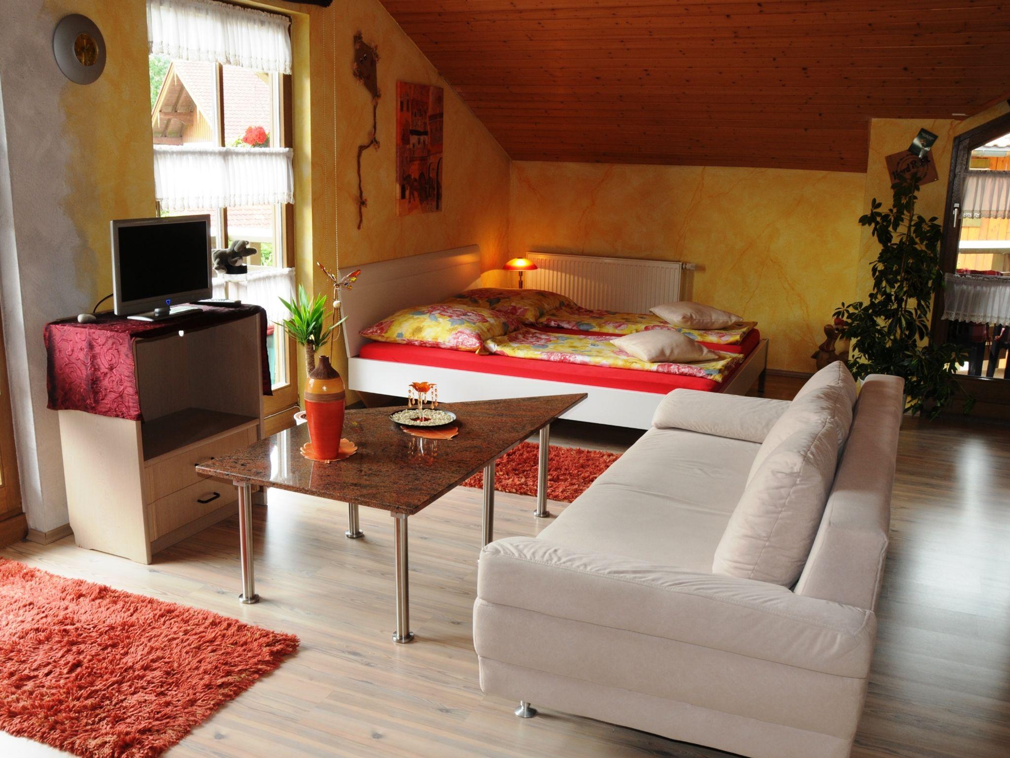 Gemütliche Ferienwohnung mit Wohn-Schlafraum, TV, Radio, Balkon und Liegewiese auf der Südseite. 5 Minuten bis zur Ortsmitte. Zusätzlicher Wohnbereich für 2 weitere Personen vorhanden.