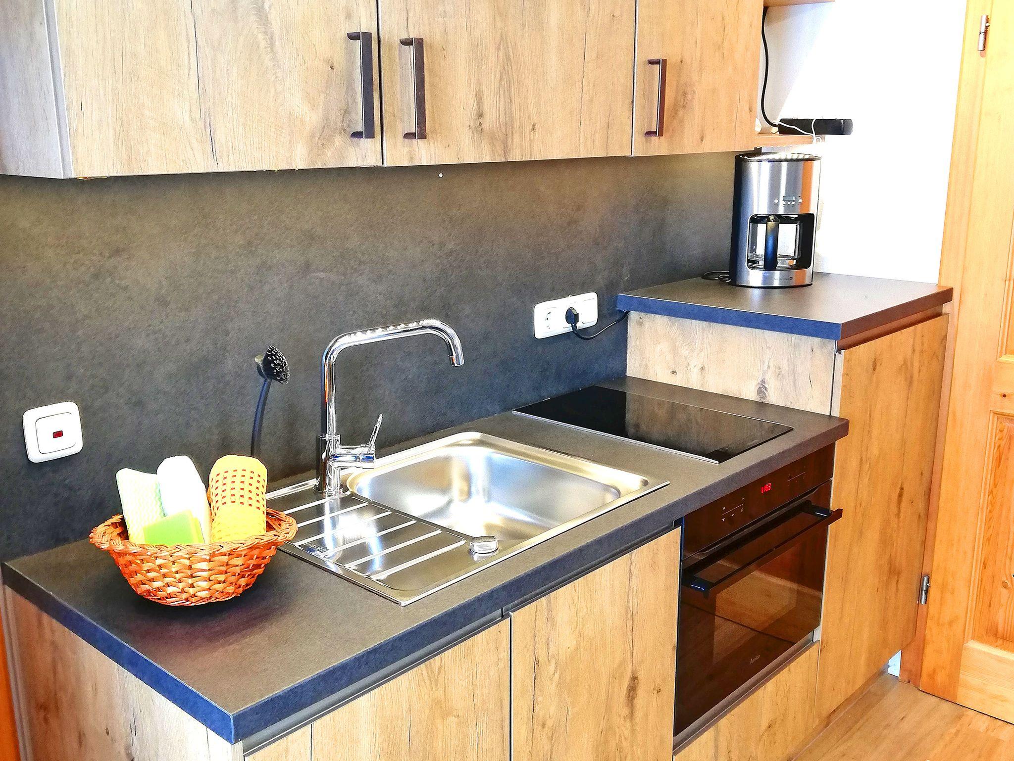 eine voll ausgestattete Küche (Induktionsherd, Mikrowelle/Heißluft, Geschirrspüler).