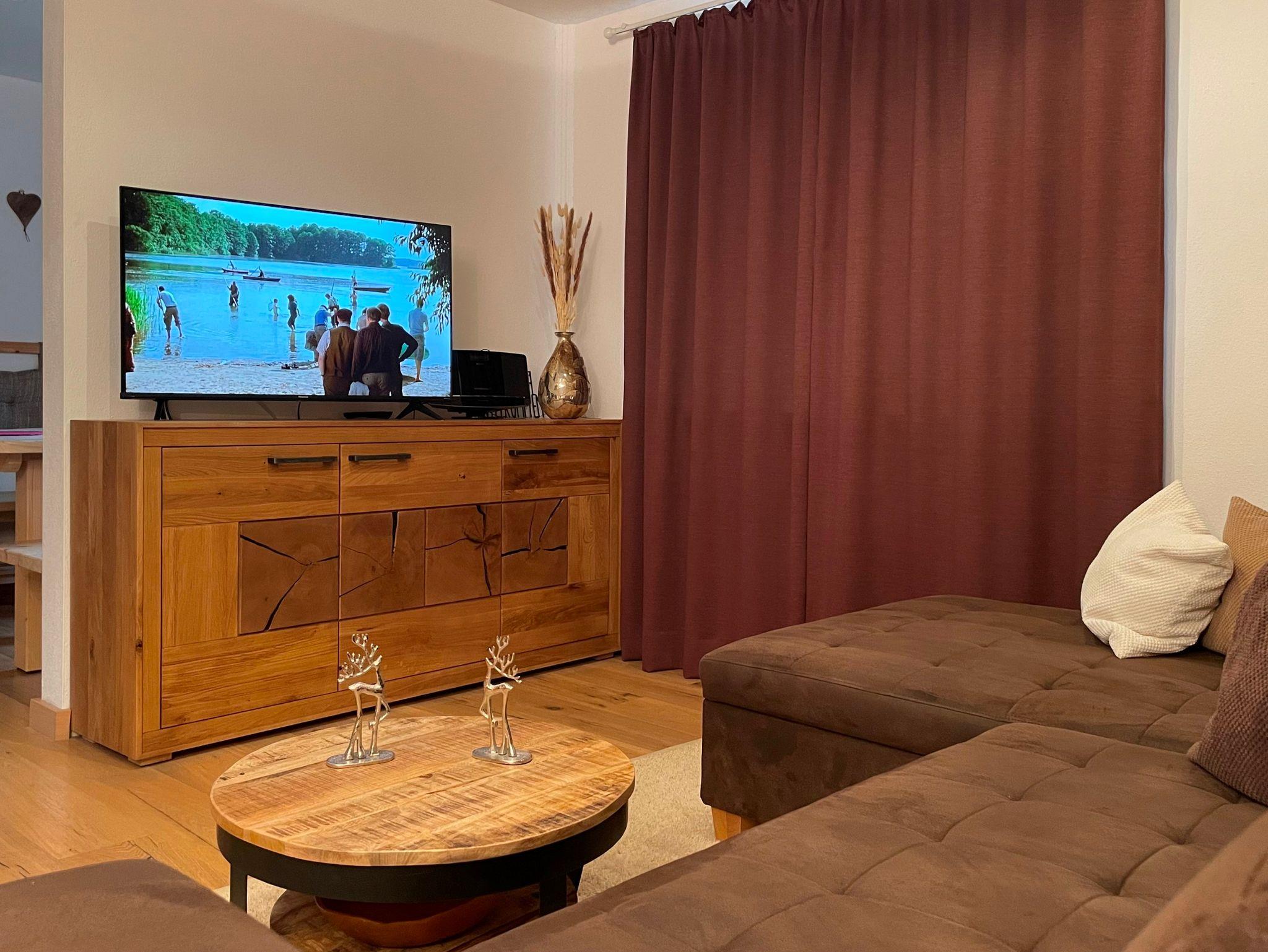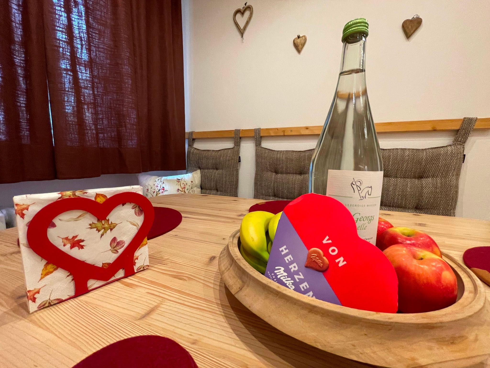 Hell und freundlich haben wir für unsere Gäste die Wohnung mit komfortabler Ausstattung geschaffen. Sie haben freien Blick auf unsere imposanten Hausberge und satte Wiesen. Beide Schlafzimmer sind großzügig gestaltet und für Allergiker geeignet. Sanitärbereich mit Fußbodenheizung, einem 2. Waschbecken und einem extra WC. Der geräumige Wohn-/Essbereich ist mit hochwertigem Inventar eingerichtet und die Küche komplett ausgestattet (Spülmaschine, Backofen, Microwelle, Kaffeevollautomat (Bohnen werden zur Verfügung gestellt), Wasserkocher, Toaster, Eierkocher) und die gemütliche Sitzecke mit einem extra großen Ohrensessel lädt zum Verweilen ein. Von beiden Schlafzimmern aus gelangen Sie auf den uneinsehbaren Balkon (Westseite). Auch für unsere kleinen Gäste ist gesorgt mit Hochstuhl, Kinderbett, Geschirr und Besteck. Geschirrtücher und Handtücher sind in ausreichender Anzahl vorhanden, bei einem längeren Aufenthalt stellen wir eine 2. Garnitur an Bettwäsche kostenlos zur Verfügung. Bügelbrett und Bügeleisen stehen in der Wohnung zur freien Verfügung.