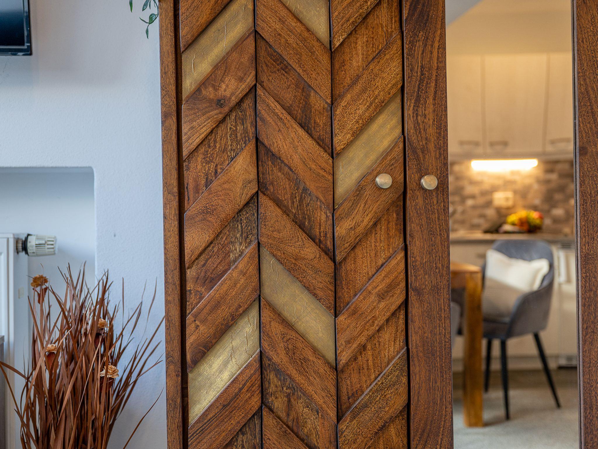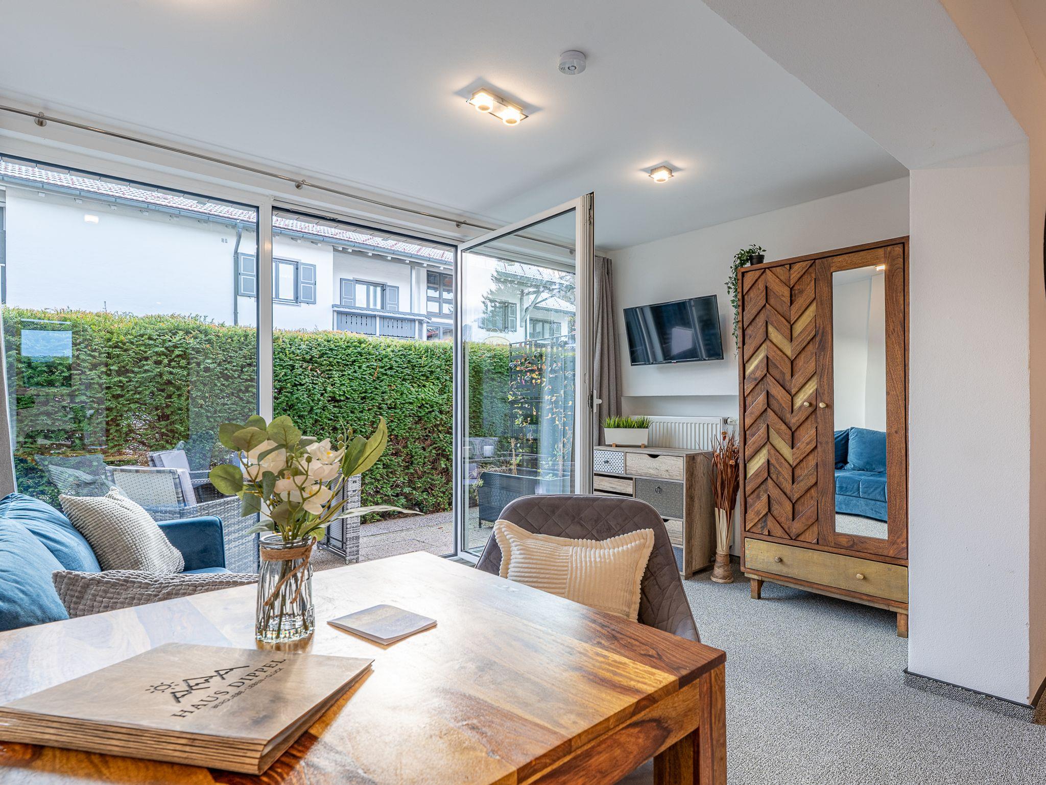 Der große Wohnraum im alpenländischen Stil ist mit hochwertigen Vollholzmöbeln ausgestattet und strahlt eine natürliche, behagliche Atmosphäre aus. Durch die große Glasfront fällt viel Licht in die Wohnung und führt direkt auf die sonnige Terrasse – perfekt, um mit einer Tasse Kaffee in den Tag zu starten oder einem Glas Wein ausklingen zu lassen.