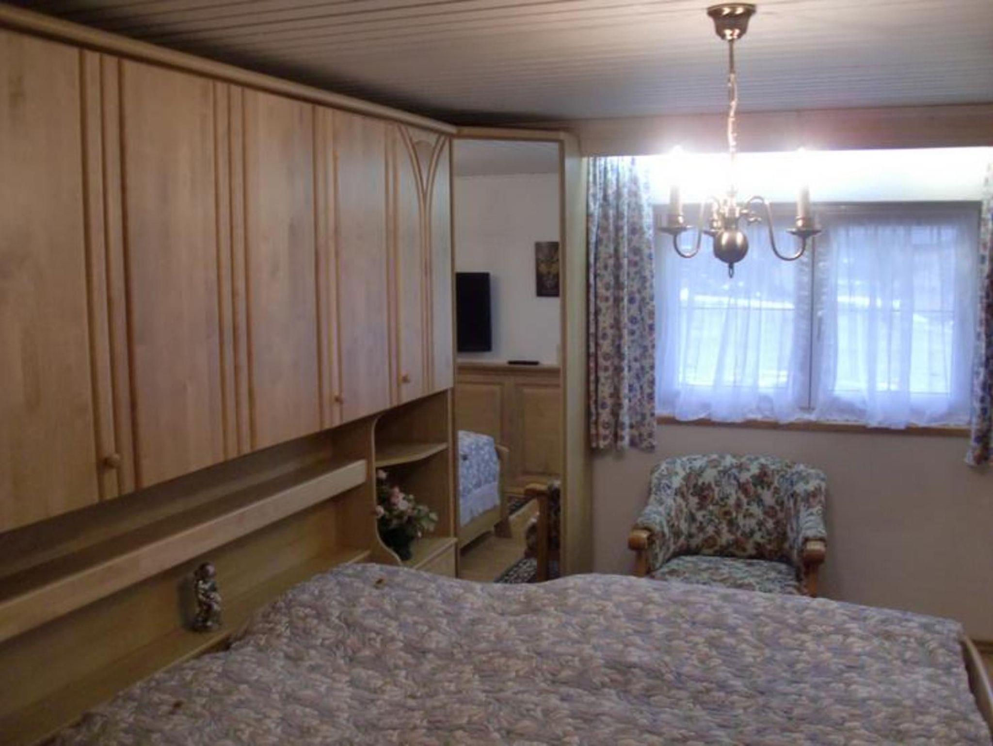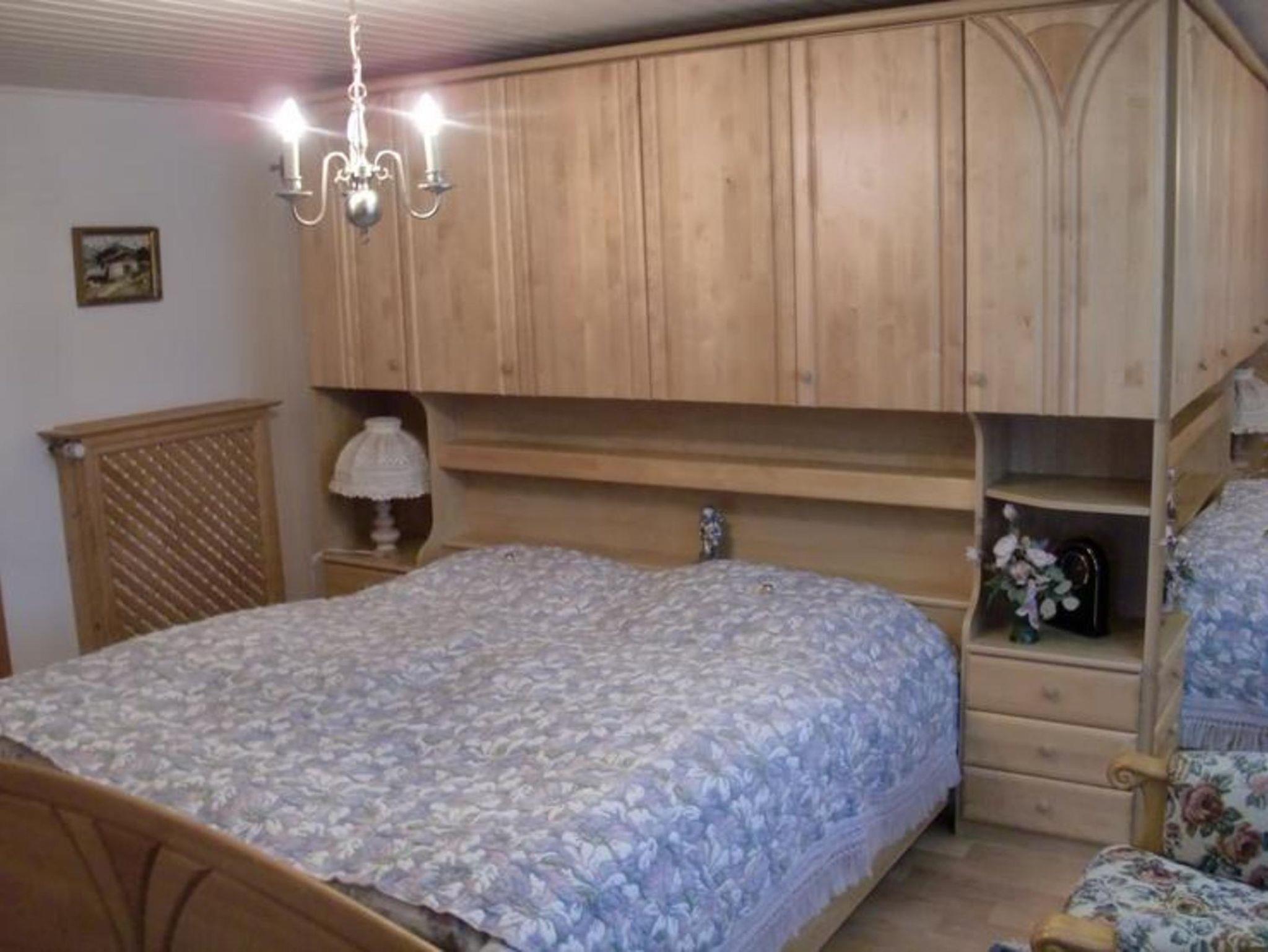 der Wand befindet. In dem zum Teil holzvertäfelten Schlafzimmer mit