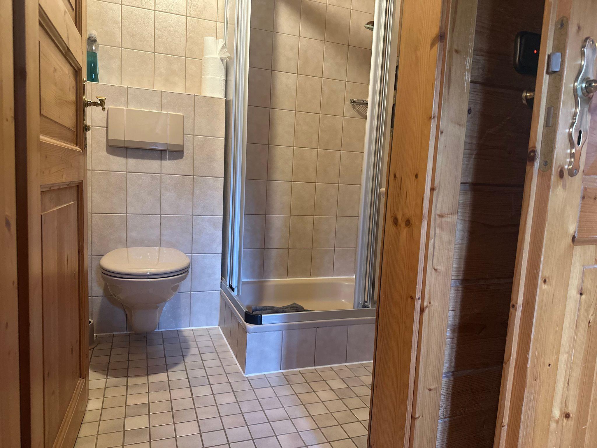 Bad mit Dusche, WC, Waschbecken und Haartrockner vorhanden.