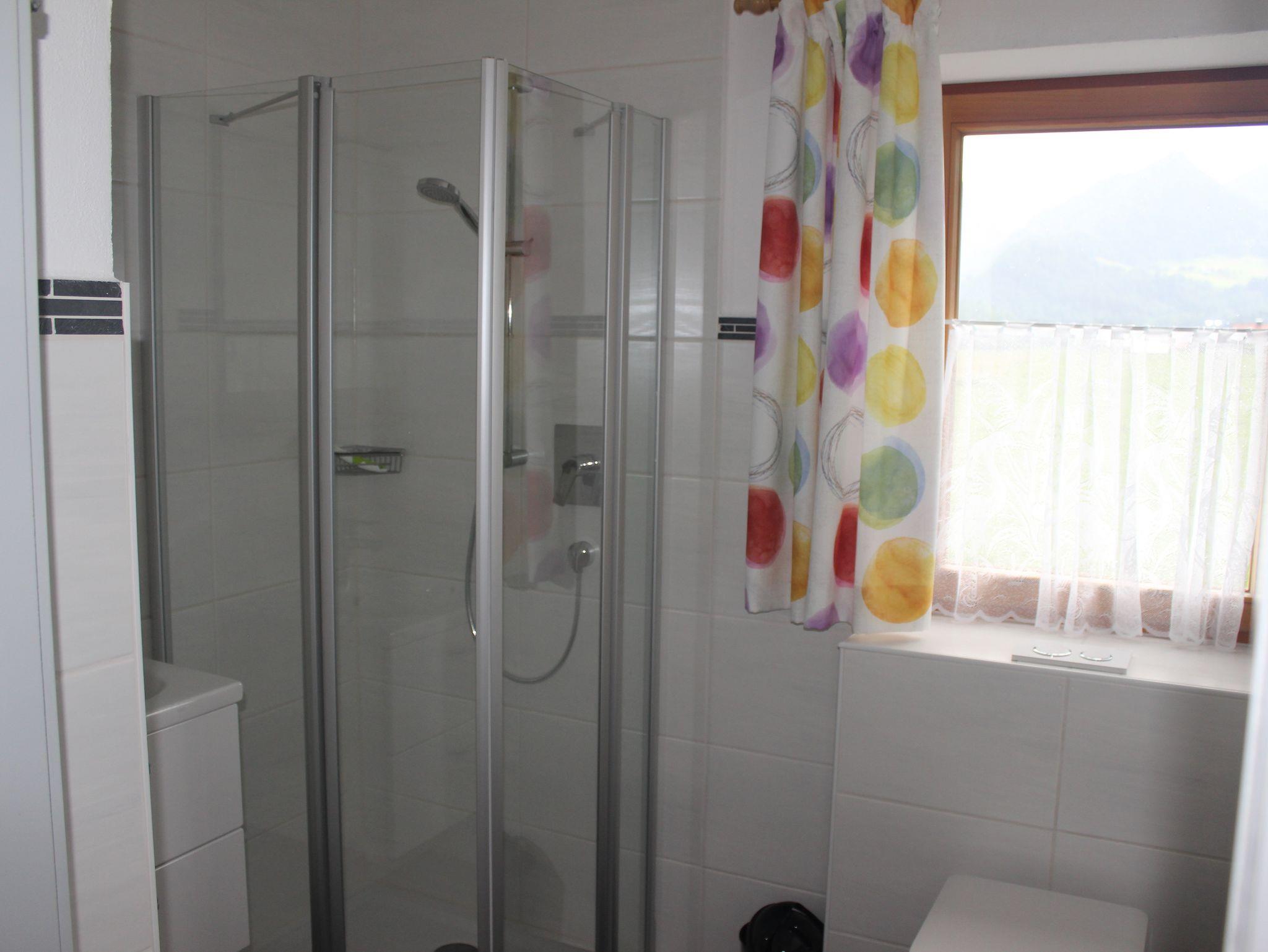 Die Wohnung liegt im 1. Stock mit Balkon und freiem Blick auf die umliegenden Wiesen, Weiden und Berge.