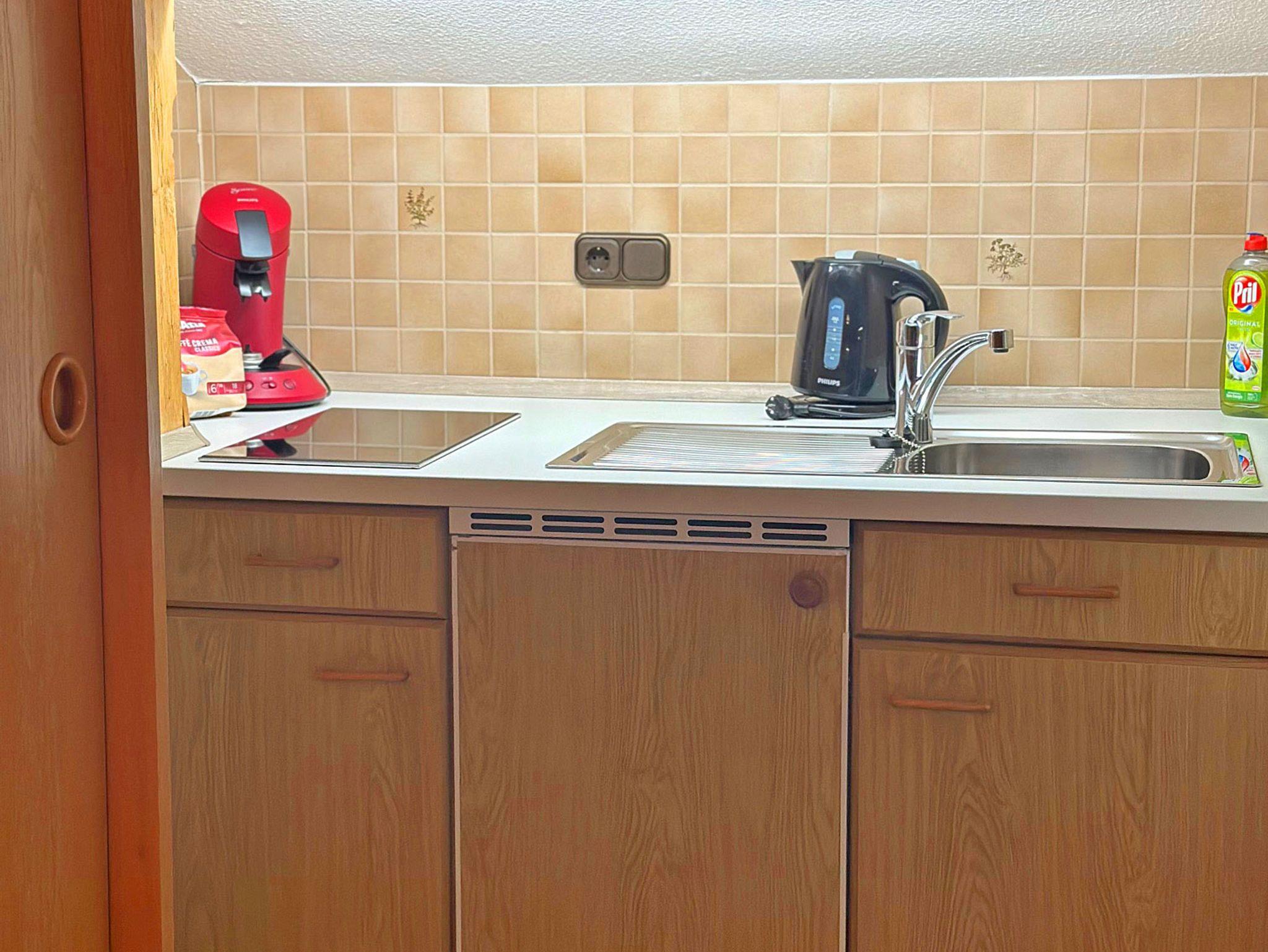 Küchenzeile ausgestattet mit 2 Platteninduktionsherd, Wasserkocher, Kühlschrank, Kaffepadsmaschine ect.