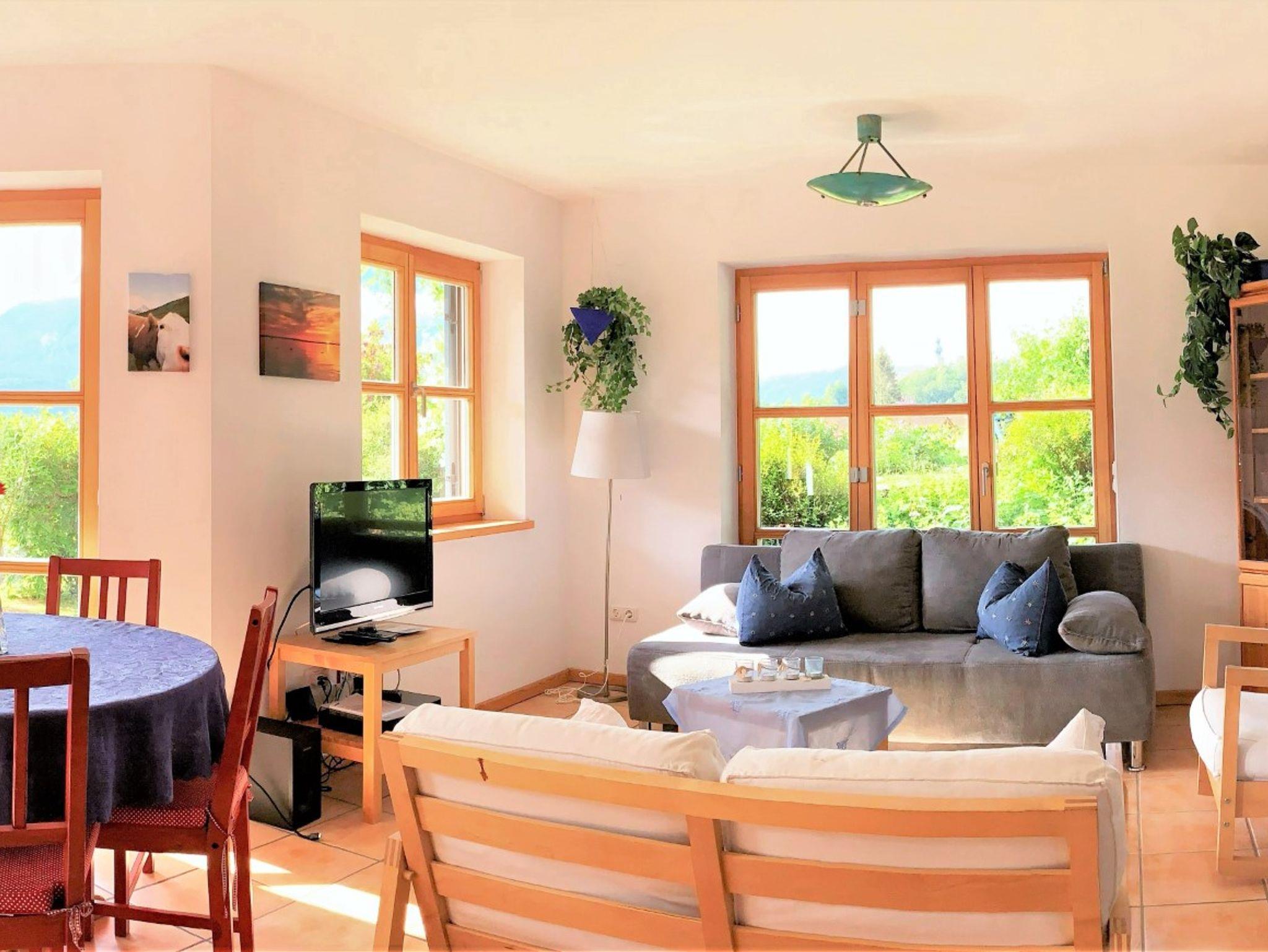 Familienfreundliche Ferienwohnung in besonders schöner Alleinlage inmitten einer großen Wiese. Herrliche Sonnenterrasse mit freiem Rundum-Bergblick. Moderne Ausstattung mit allen Annehmlichkeiten: Zwei Schlafzimmer, komplett ausgestattete Küche mit Spülmaschine, Mikrowelle, Kaffee- und Espressomaschine, Holz-Kaminofen im Wohnzimmer, großzügiges Bad mit Dusche, Badewanne und Bidet, eigene Waschmaschine, zusätzliches WC, Fußbodenheizung in der gesamten Wohnung, elektrische Rolläden, gratis WLAN, Handtücher und Bettwäsche inklusive.