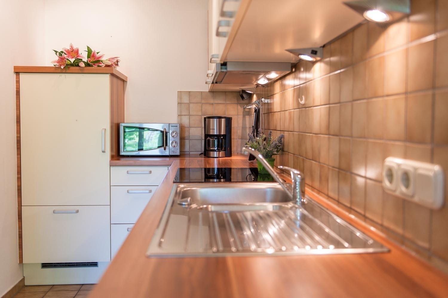 Die 80 m² große Ferienwohnung bietet einen modernen Wohnraum mit Ethanol-Kamin, eine voll ausgestattete Wohnküche sowie zwei separate Schlafzimmer (1× Doppelbett, 2× Einzelbetten). Vom Wohn- und Schlafzimmer gelangen Sie direkt auf die große Terrasse mit West- und Südblick. Die Wohnung verfügt über ein Badezimmer mit begehbarer Dusche, ein separates Gäste-WC sowie komfortable Gartenmöbel und Sonnenschirm. Perfekt für Paare und Familien, die entspannte Urlaubstage in ruhiger, sonniger Lage genießen möchten.