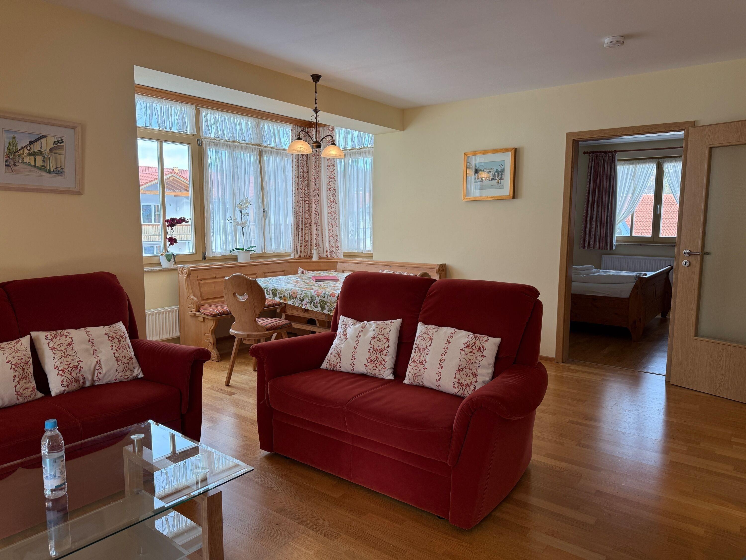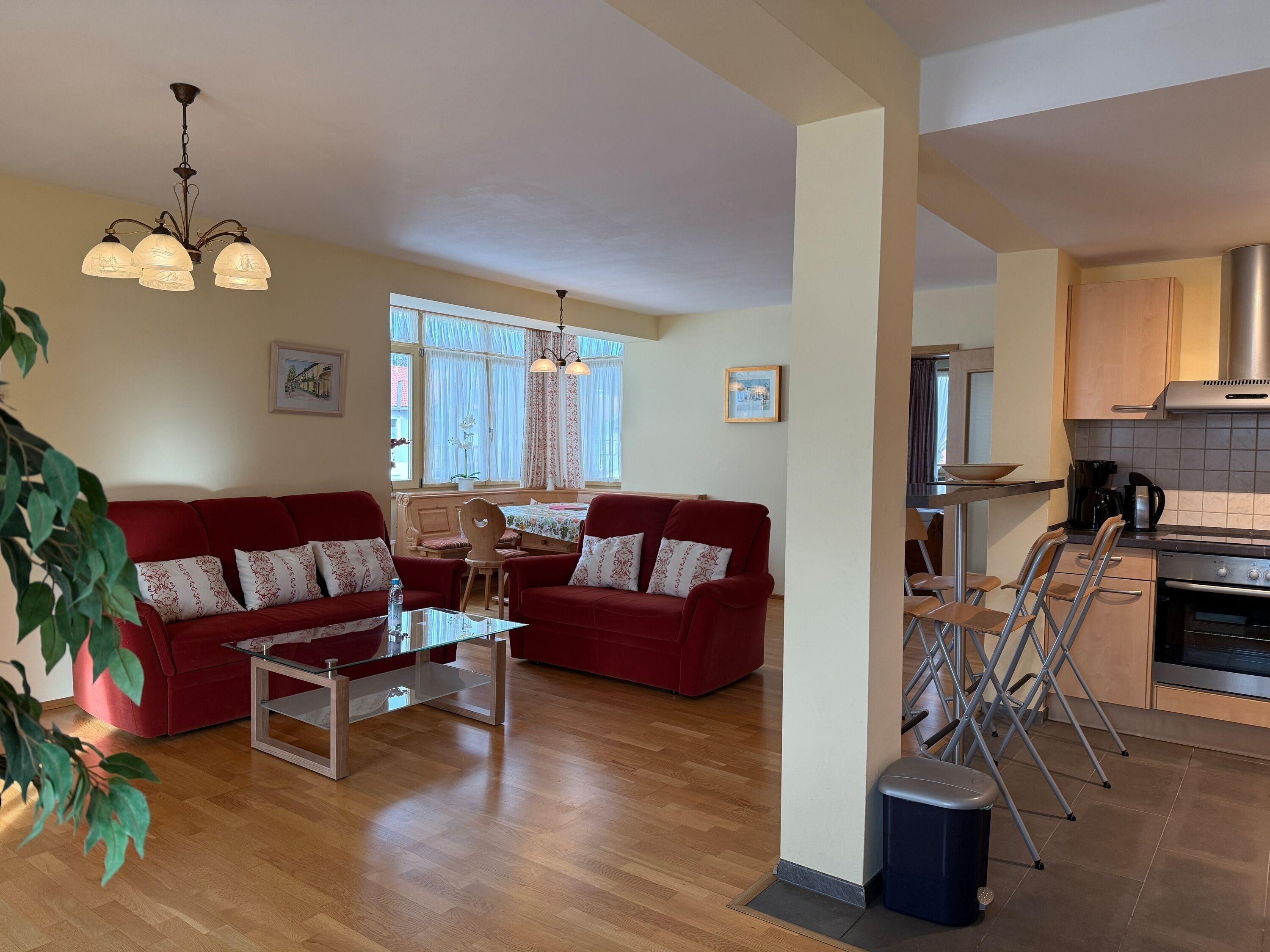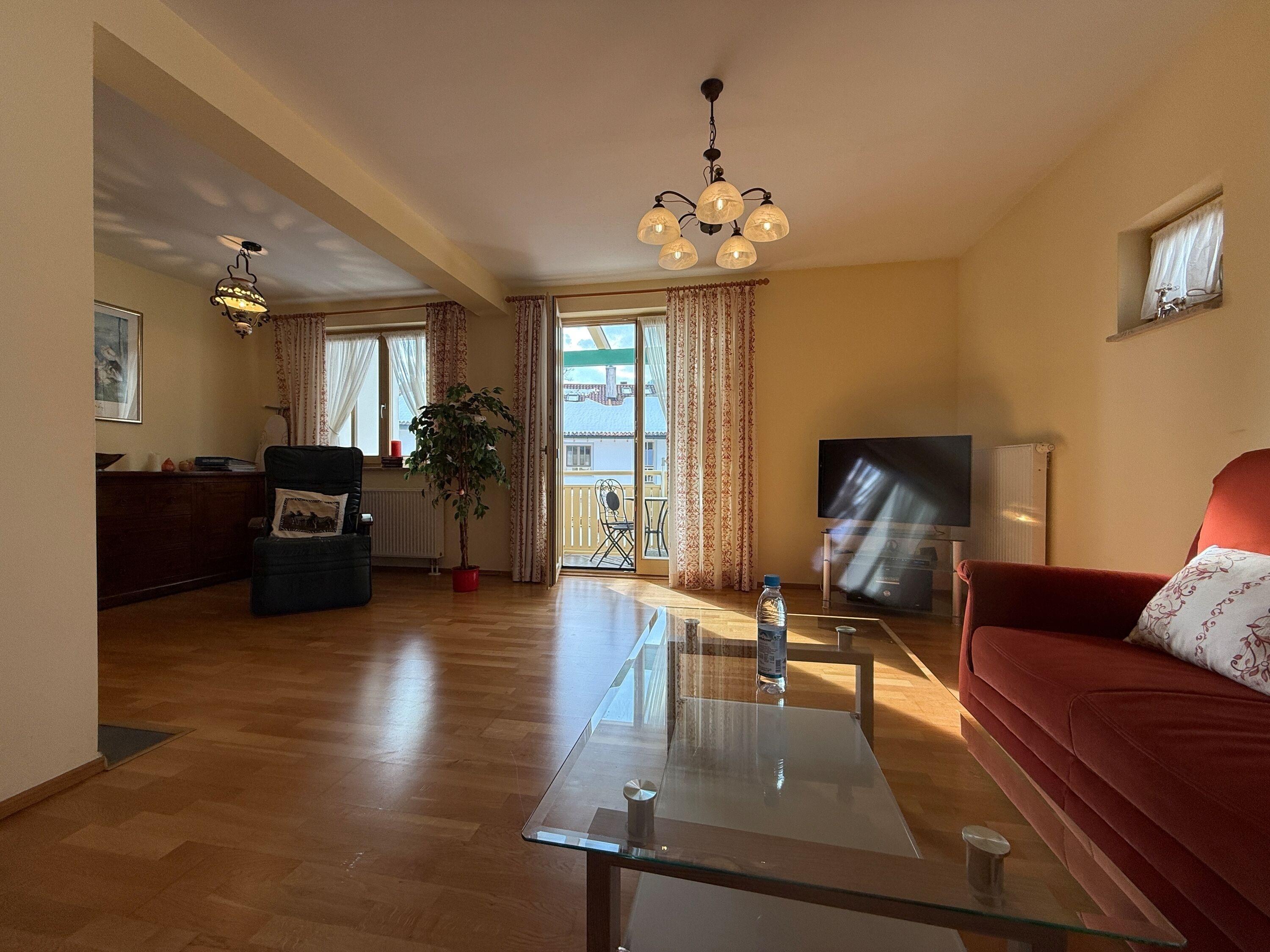 Genießen Sie Ihren Urlaub in unserer geräumige, im alpenländisch und Irischen Stil eingerichteten Ferienwohnung mit ca. 90 m² Wohnfläche. Hier finden Sie alles, was zu einer erholsamen Auszeit gehört: ein geschmackvoll eingerichtetes Wohnzimmer mit direktem Zugang zur sonnigen Balkon, eine moderne Küche und gemütliche Große Esstisch mit Rundsitz sowie zwei komfortable Schlafzimmer.