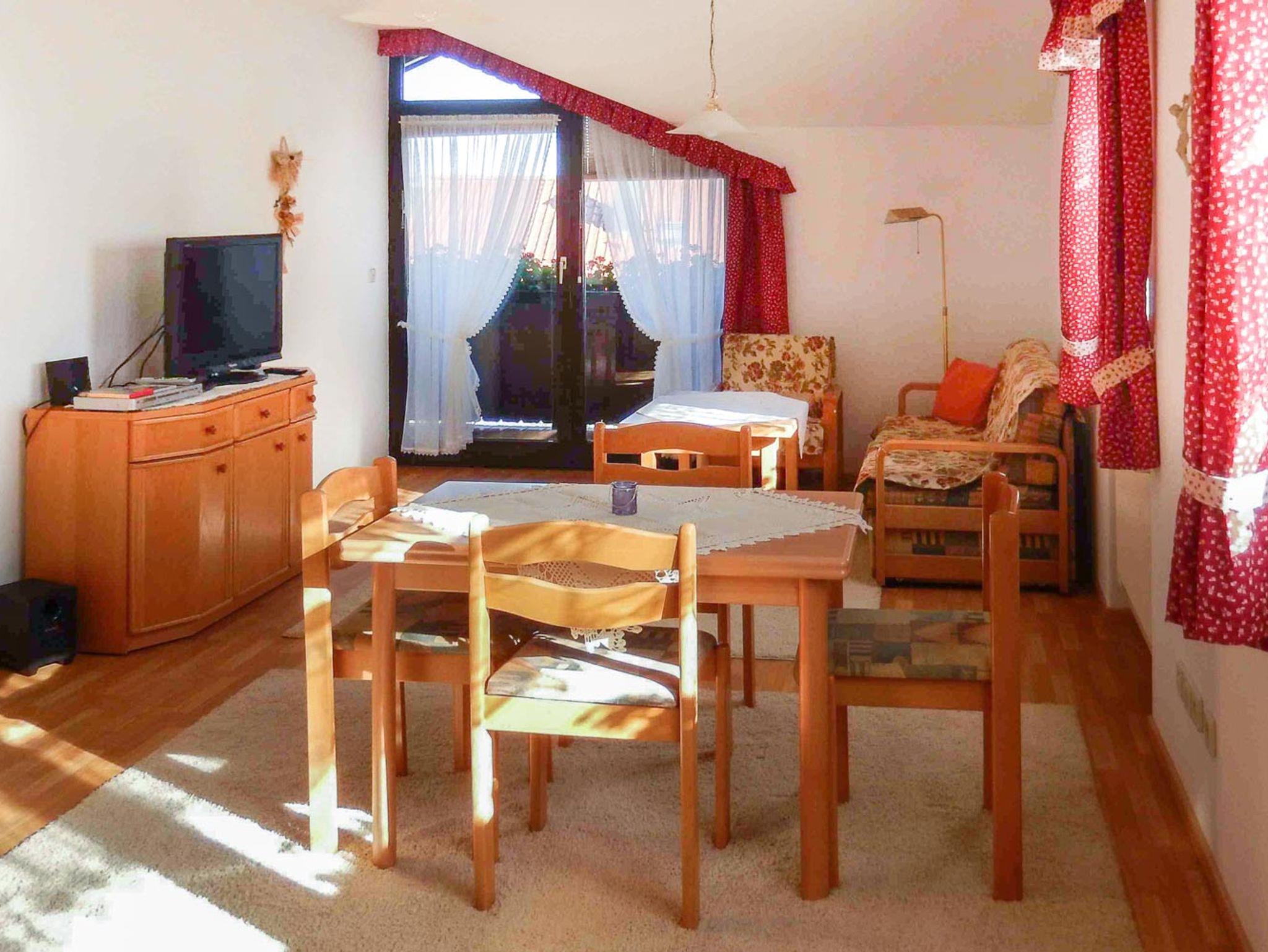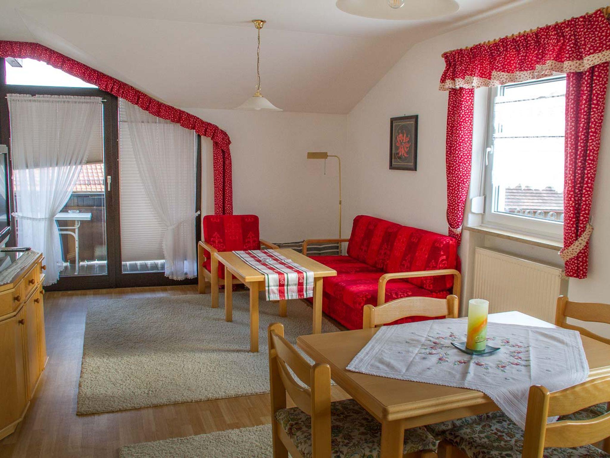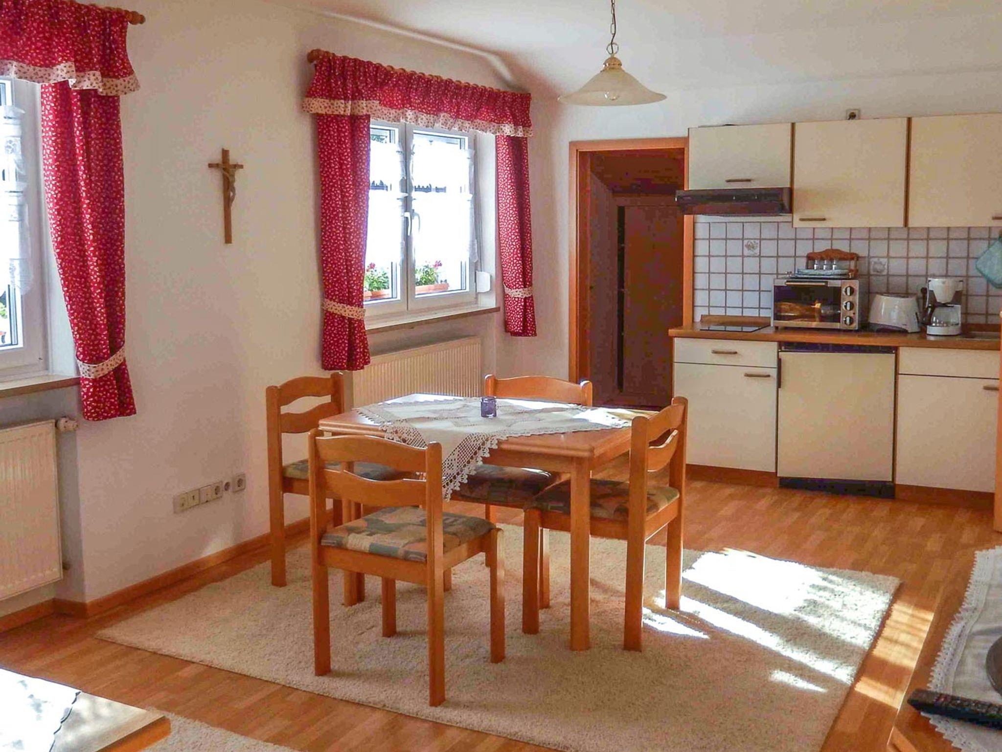 Die Ferienwohnung eignet sich für 5 Personen. Neben einem Schlafzimmer mit Doppelbett steht ein weiteres Zimmer mit einem Einzelbett zur Nutzung bereit. Wohn-Schlafraum mit Schlafcouch für 2 Personen. Der Essbereich/Küche bietet genügend Platz und Komfort zum Kochen, dafür stehen ein modernes Induktionskochfeld, als auch ein kleiner Pizza-Ofen zum Backen zur Verfügung. Aber auch für Unterhaltung ist gesorgt. Relaxen Sie vor dem Fernseher, sehen eine DVD oder lesen ein gutes Buch auf der gemütlichen Couch. Ebenso bietet Ihnen WLAN einen abwechslungsreichen Zeitvertreib. Vom Wohnbereich aus gelangen Sie auf den Balkon, bestückt mit Gartenmöbeln und haben bei klarer Sicht einen wunderbaren Ausblick bis nach Österreich. Das Badezimmer ist ausgestattet mit einer Duschkabine .