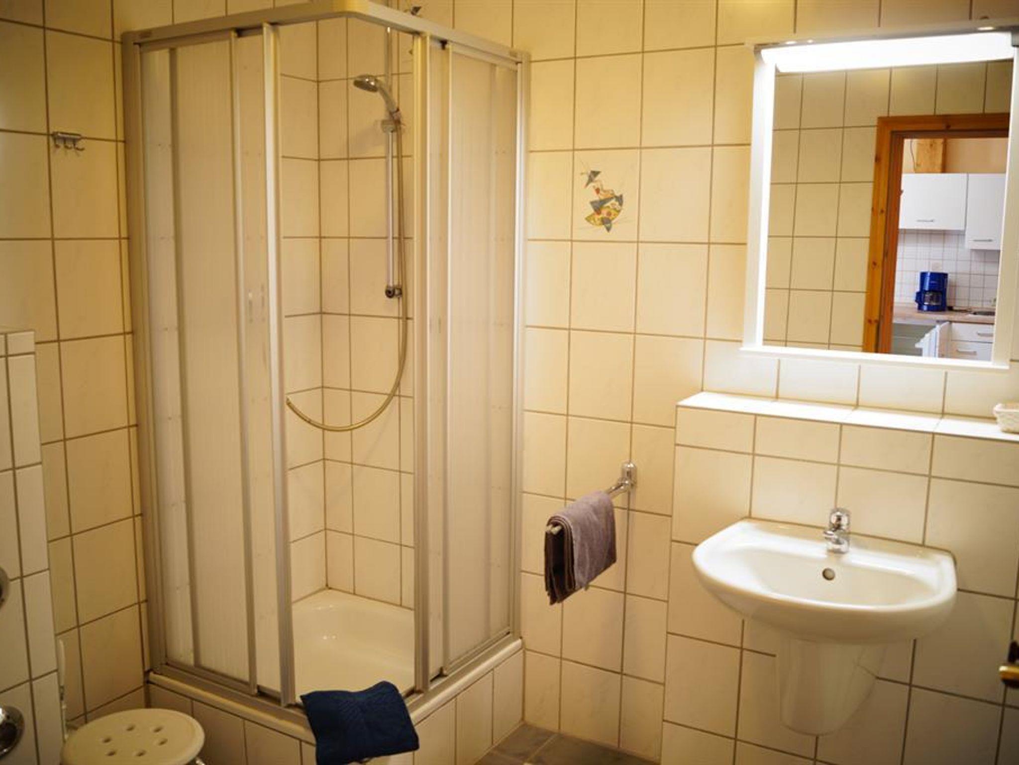 1 Schlafbereich, 1 Wohnbereich mit Küchenzeile, Bad, Flur, Dachterrasse.
