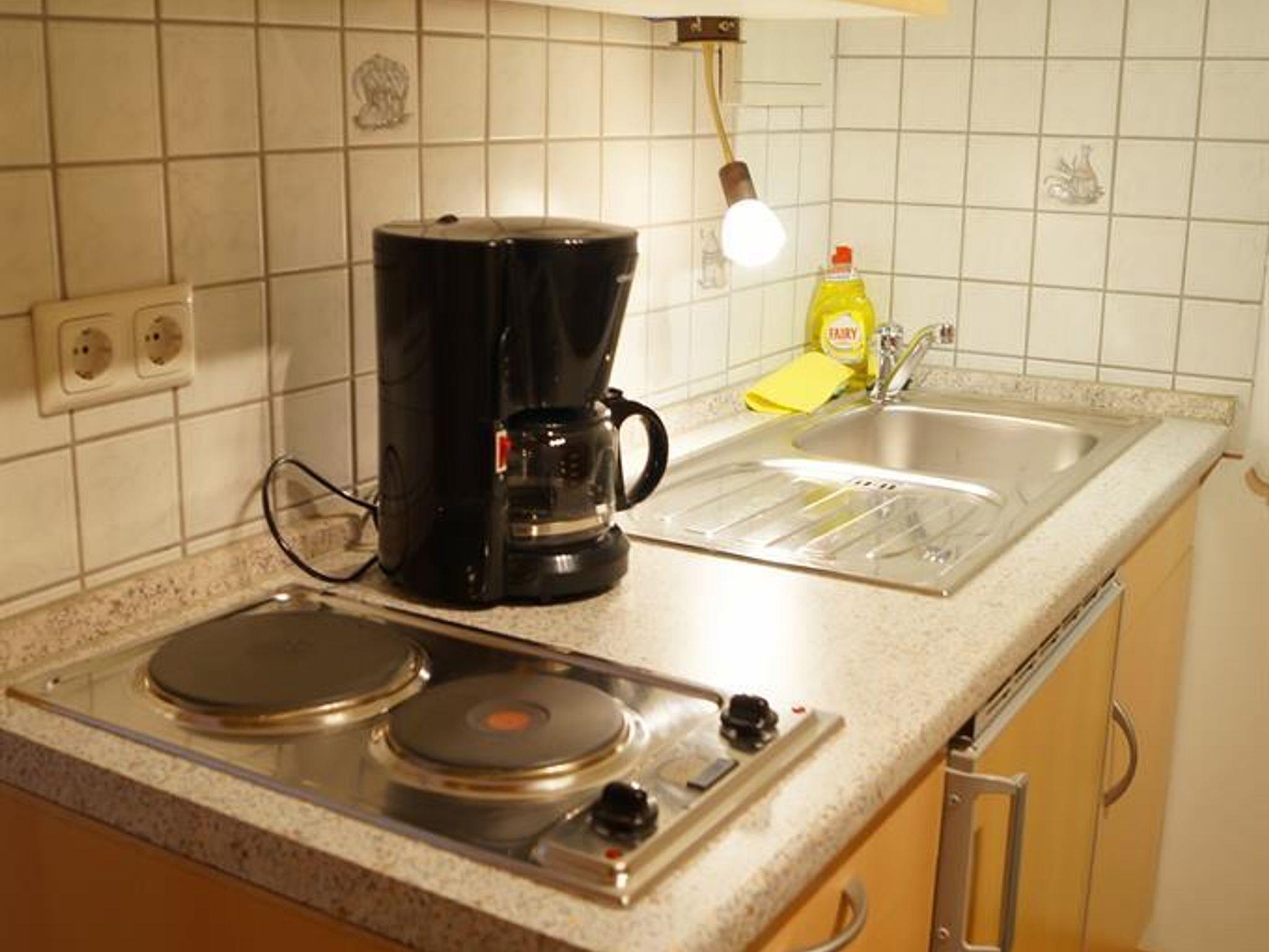 Apartement mit kleiner Kochnische, Sofa, Fernseher, Bad und Flur