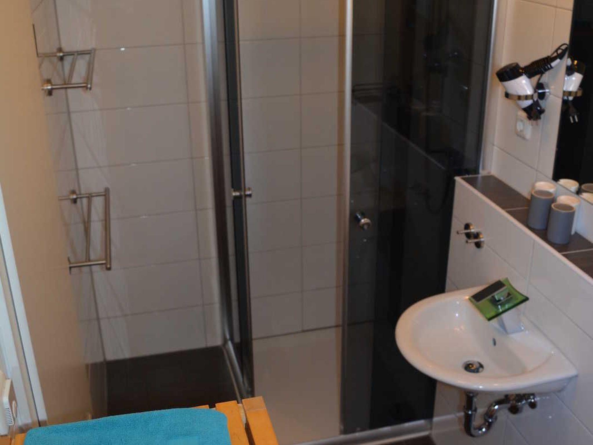 Jedes Zimmer ( keine Ferienwohnung) bietet ein eigenes Bad mit Handtüchern und Haartrockner.