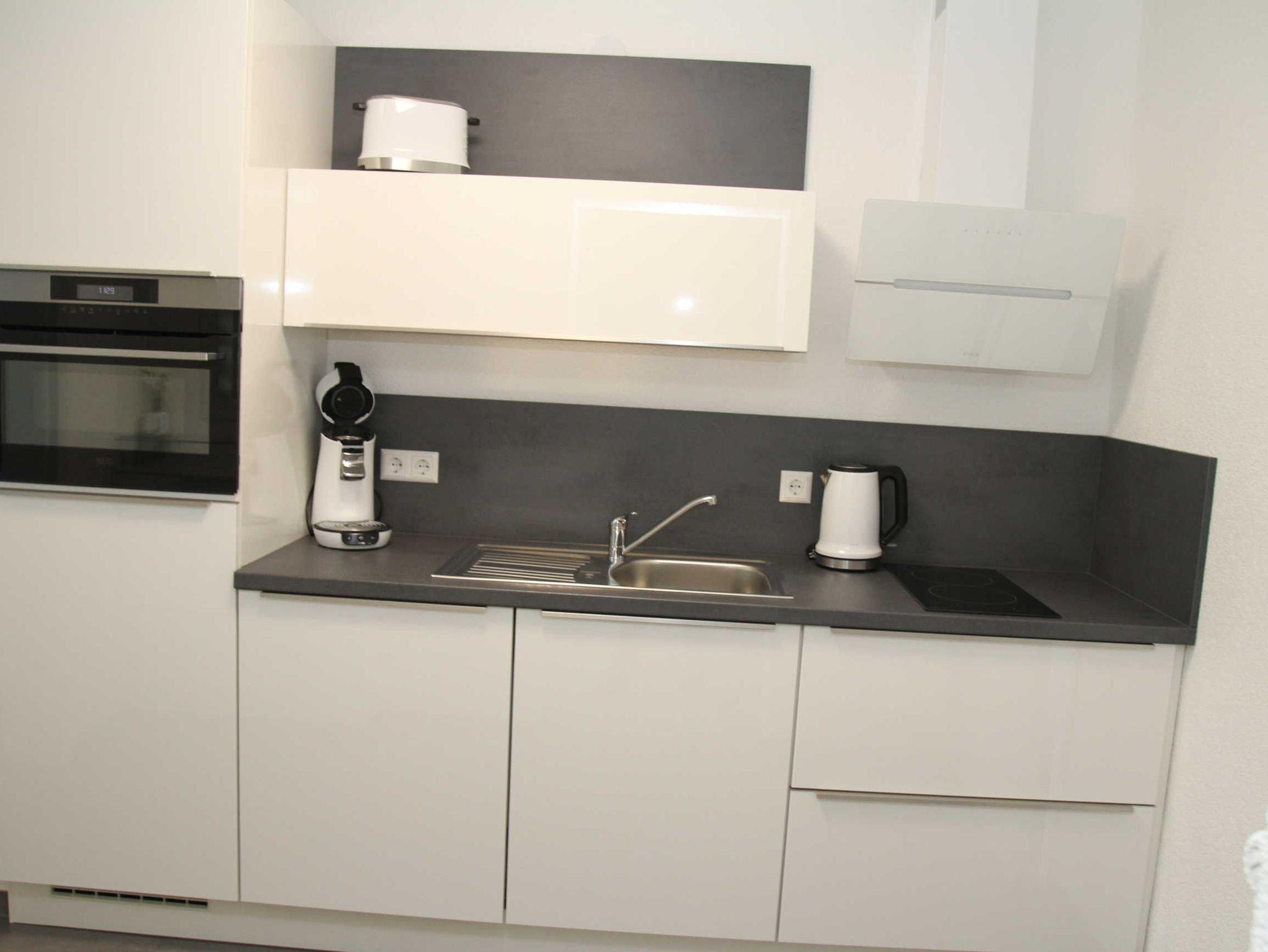 Eine komplett eingerichtete Wohnküche mit kombiniertem Backofen/Mikrowelle, Toaster, Wasserkocher, Kaffee-Pad-Maschine, Spülmaschine, Kühlschrank mit Gefrierfach.