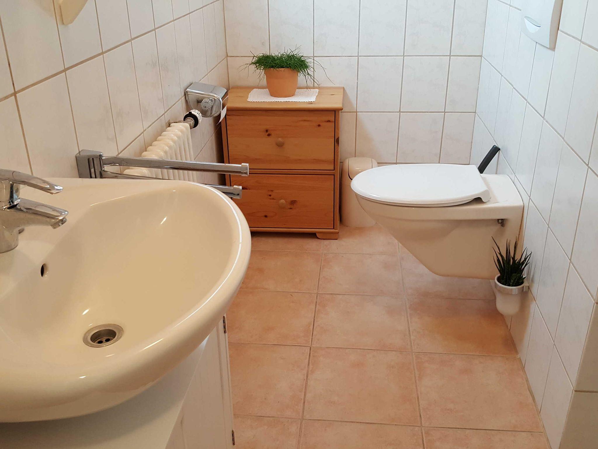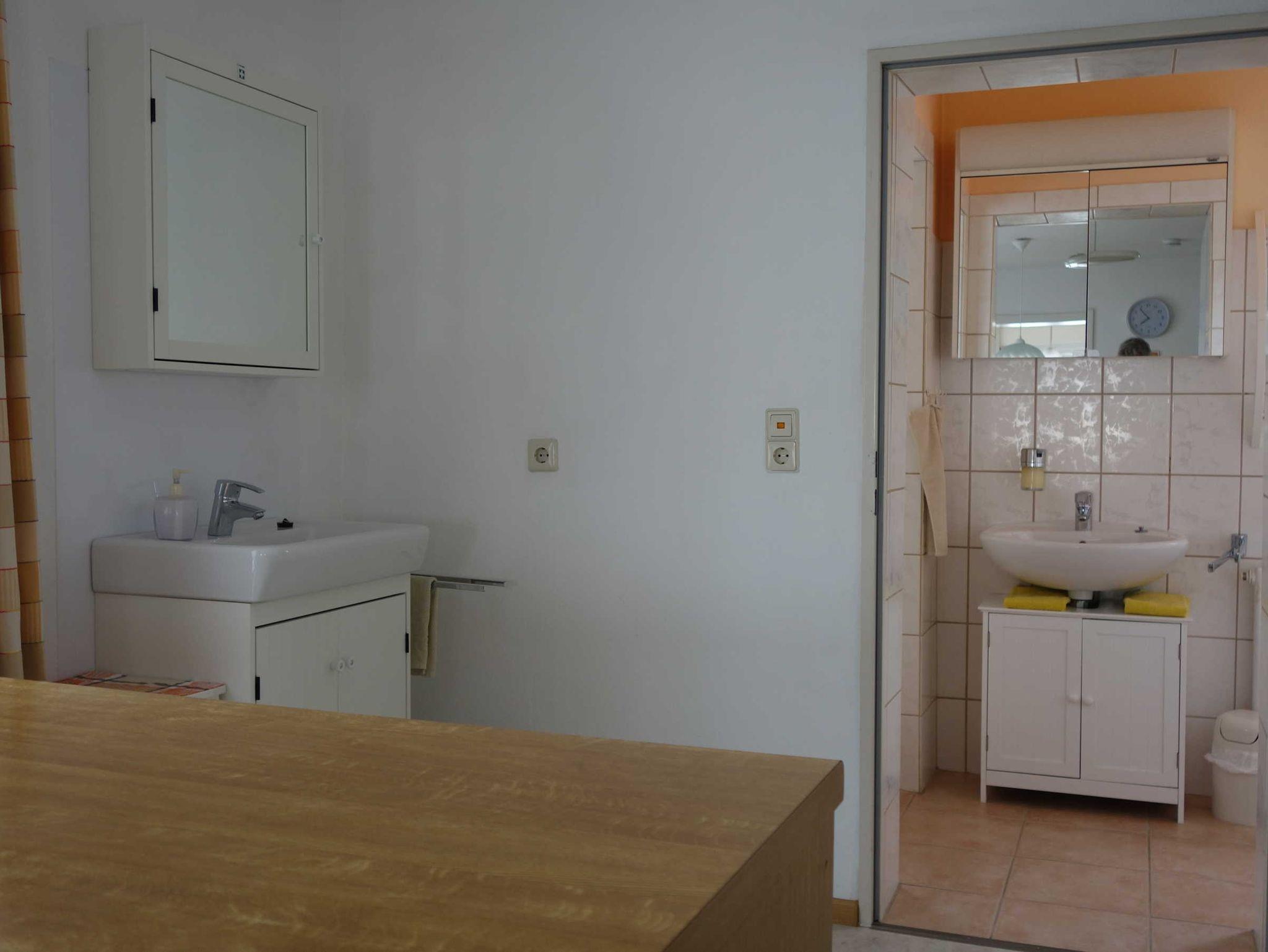 Unsere Ferienwohnung befindet sich im Erdgeschoss mit 2 Schlafzimmern, große Wohnküche, Esszimmer, Dusche, Waschbecken und WC + separates Waschbecken.