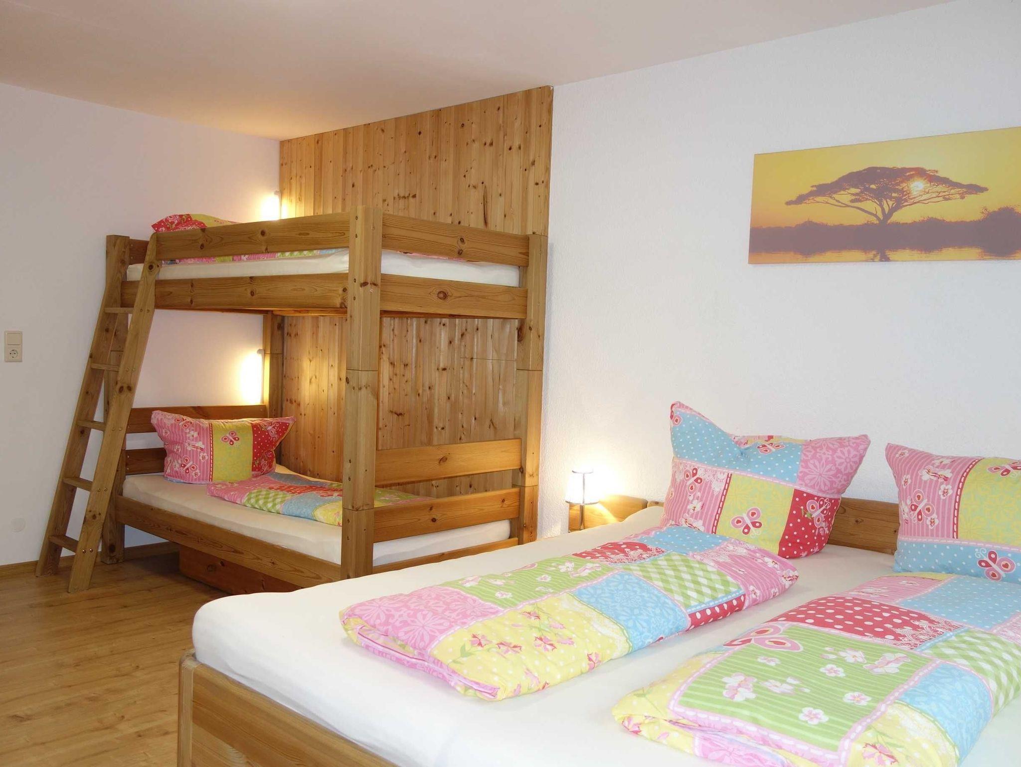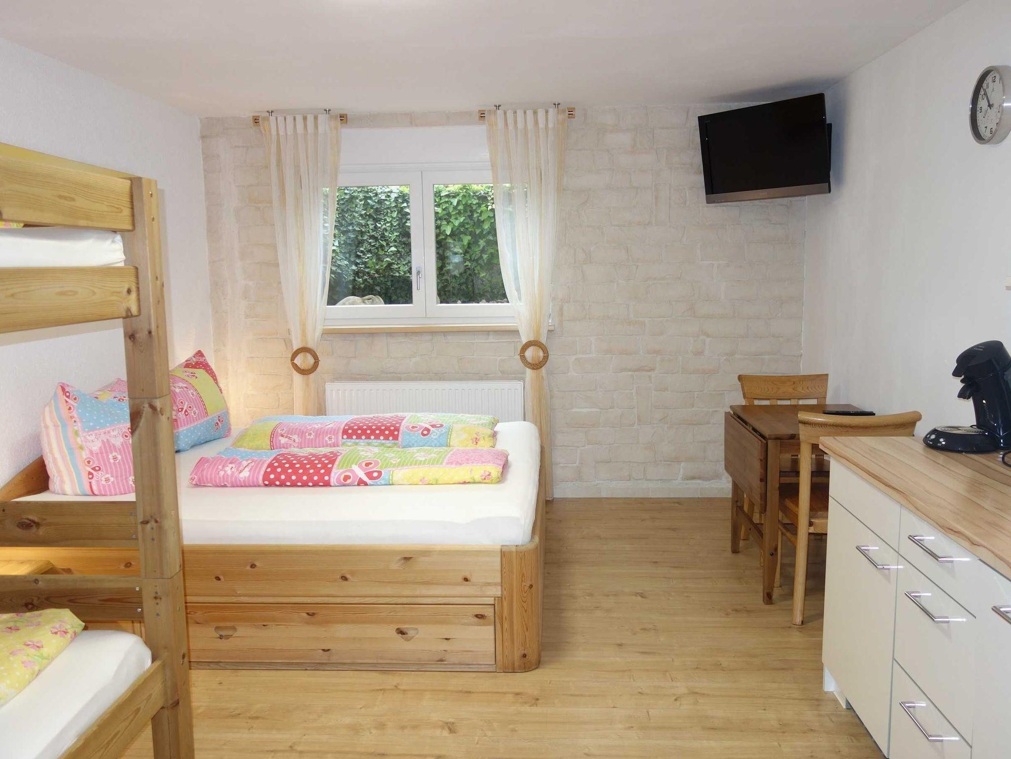 Ferienwohnung ca. 27qm für max. 4 Personen Die Ferienwohnung ist ca 27qm gross , hell und modern eingerichtet, mit integrierter Küchenzeile und allen notwendigen Küchengeräten, darunter Kühlschrank, Spühlmaschiene, kleiner Backoffen, Kochplatte, Senseo Kaffemaschiene, Wasserkocher, Toaster und das Geschirr. Der Wohnschlafraum verfügt über ein Doppel- und ein Etagenbett, Kabel TV. Separater Eingang zum Souterrain, kleiner Flur, großes Bad mit Dusche/WC in sehr ruhiger Wohnlage.Kostenloser Parkplatz. Das Früstück wird nicht angeboten, daher bitte für Selbstferpflegung sorgen.Die Treppe zu der Ferienwohnug ist für die Rollstuhlfahrer leider nicht geeignet.