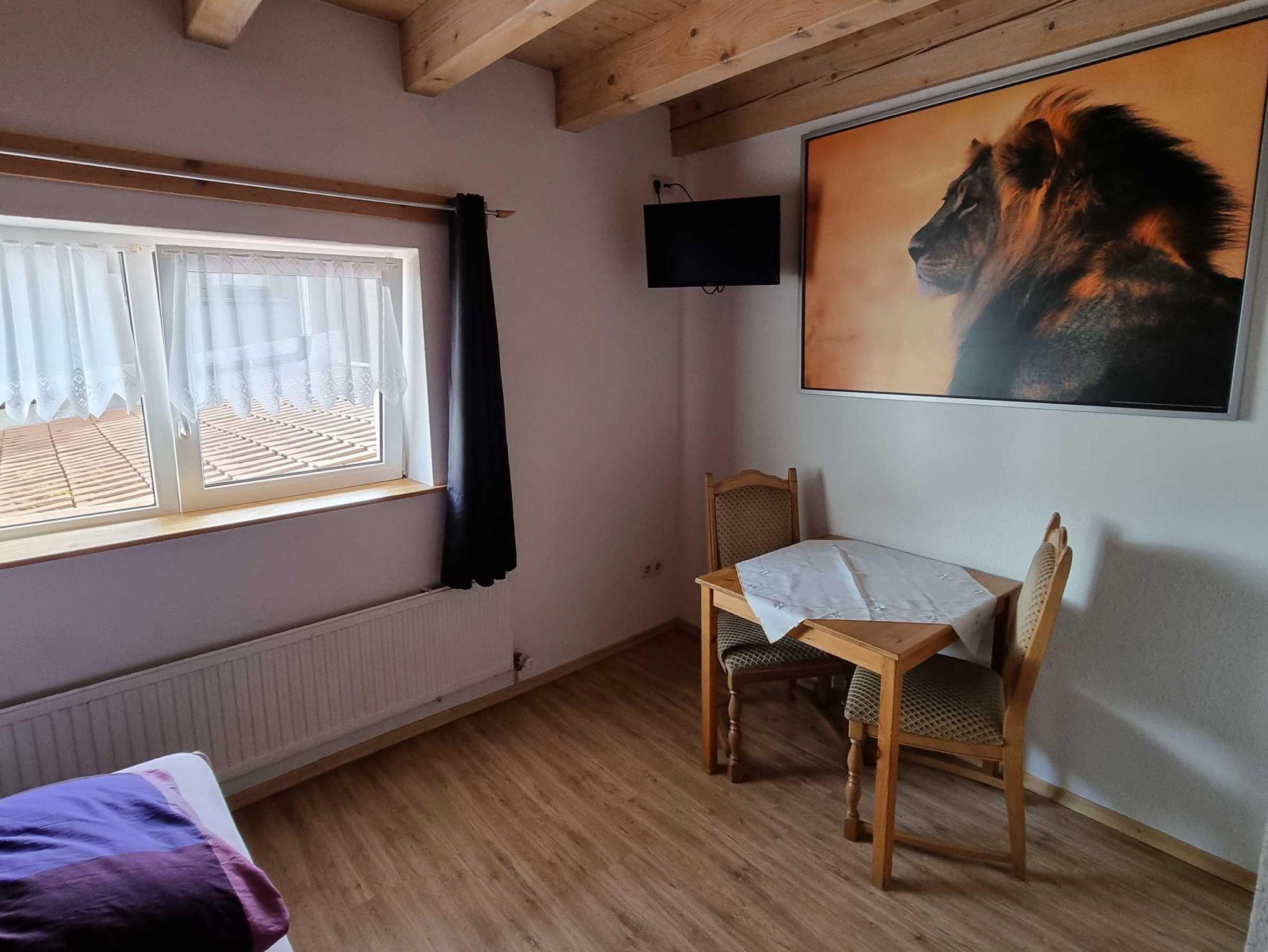 Nichtraucher-Doppelzimmer, 12 qm mit WC und Dusche, Waschbecken, Fön, Fernseher Kabel/Sat, Sitzgelegenheit und Weckeinrichtung. Kinder bis 3 Jahre übernachten im Bett der Eltern kostenfrei.