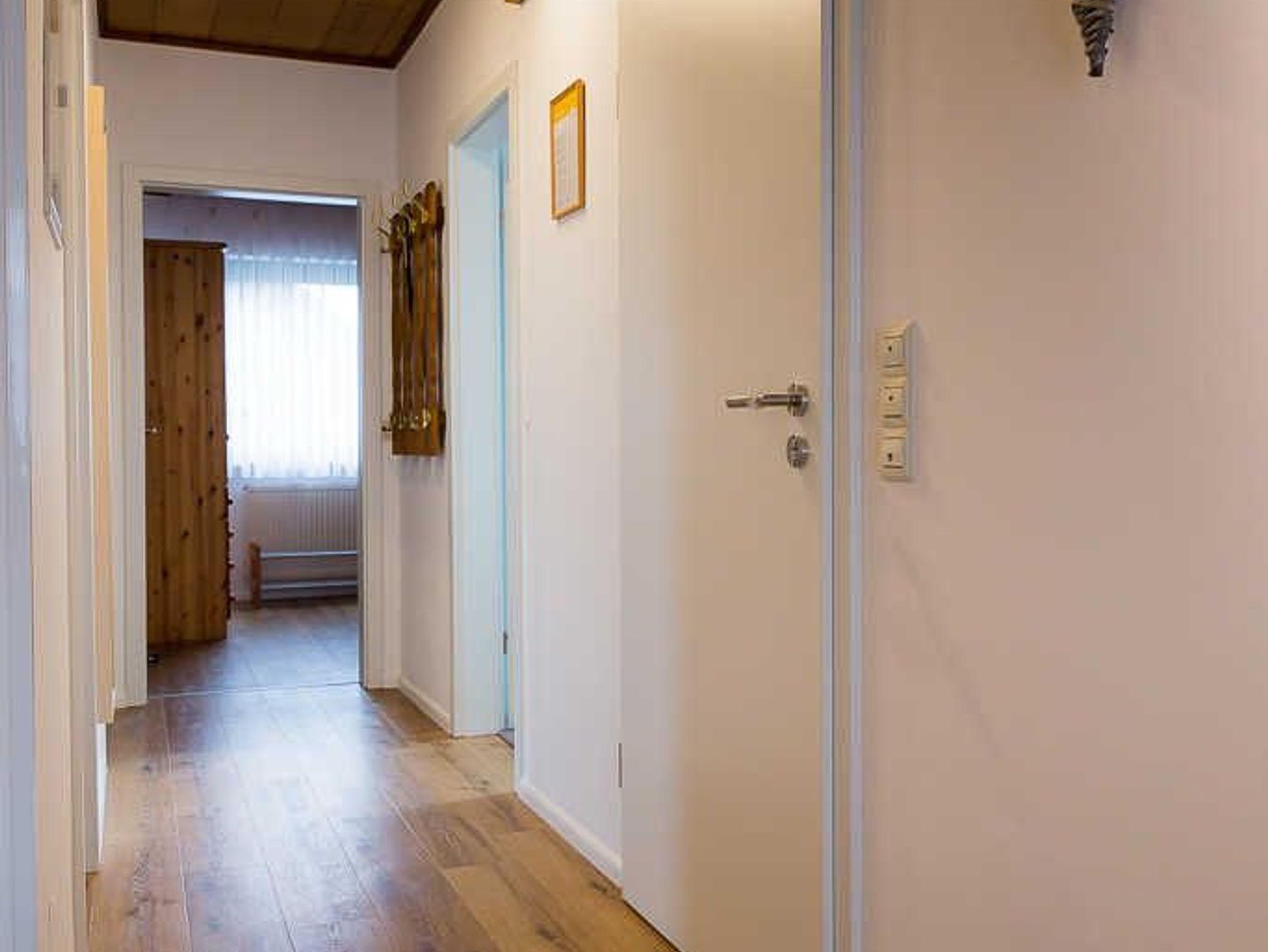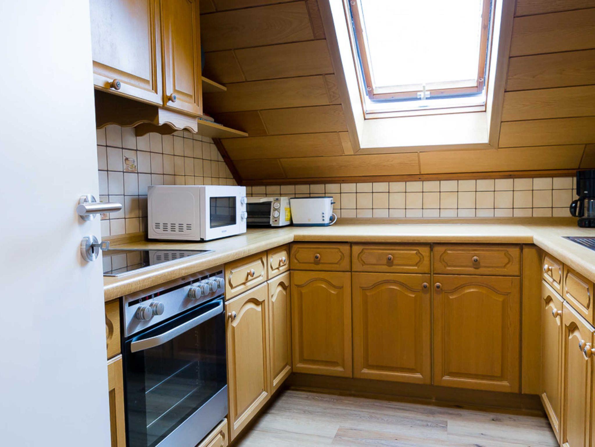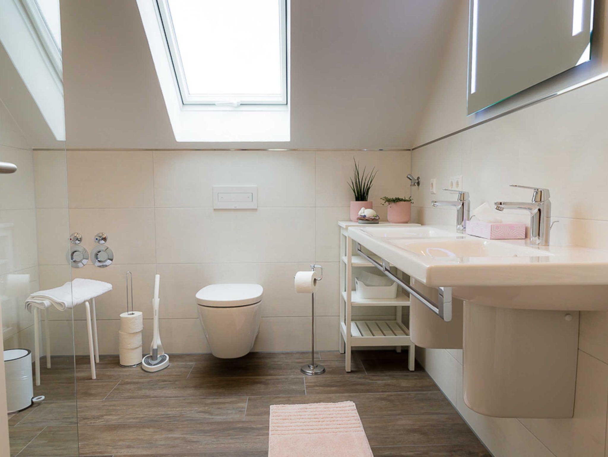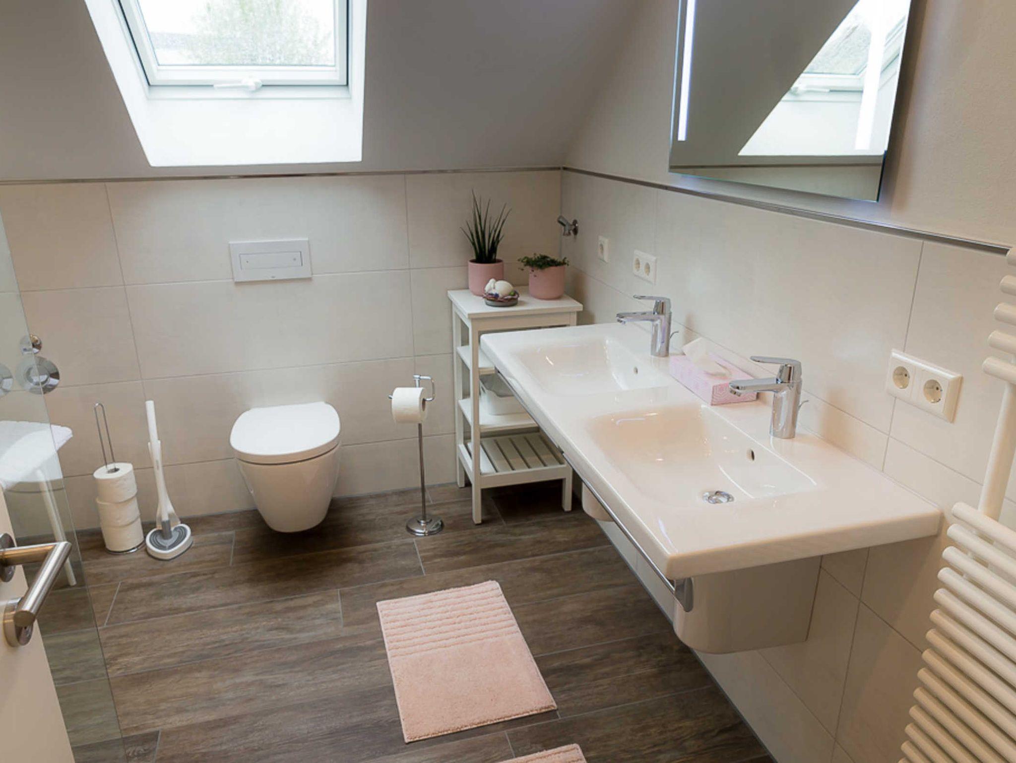 Die Wohnung in der oberen Etage ist großzügig gestaltet und der Jahreszeit entsprechend dekoriert. Die drei Schlafzimmer sind mit einem Doppelbett ausgestattet, ein Schlafzimmer hat zusätzlich ein Einzelbett und eine Schlafcouch. Die Küche ist mit Kühlschrank, Filterkaffeemaschine, Herd, Backofen, Mikrowelle, Toaster, Grill, Kochutensilien und Geschirr sehr gut ausgestattet. Der Esstisch ist ausreichend für 6 Personen. Das Bad ist neuwertig und mit einem Fön ausgestattet, Handtücher müssen mitgebracht werden, eine Waschmaschine gibt es nicht. Der Balkon bietet genügend Sitzmöglichkeiten. Kostenfreies WLAN und ein TV werden angeboten.