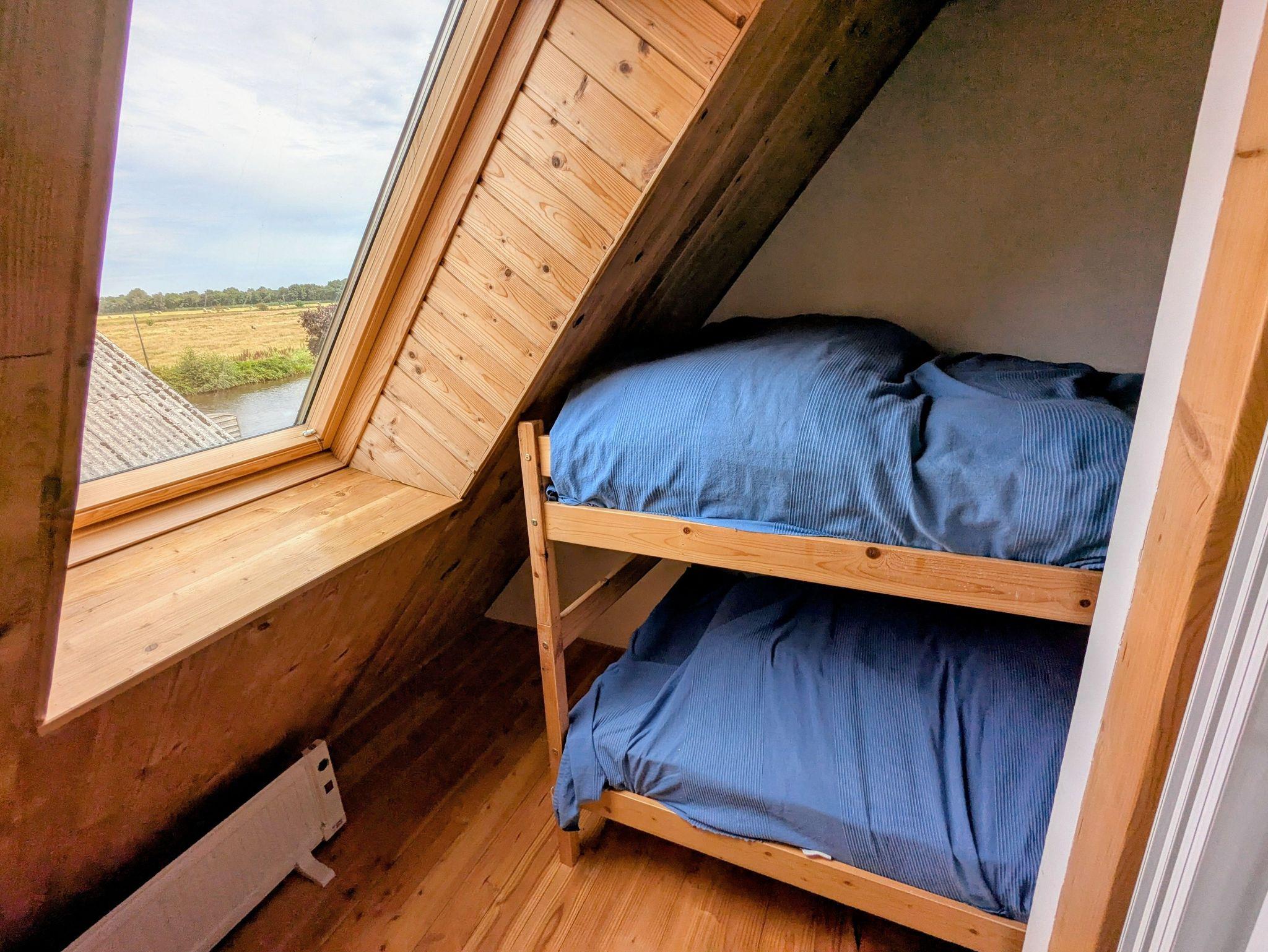 Im Obergeschoss befindet sich ein großer Schlafraum mit französischem Bett (1,60 Meter) und gemütlicher Sitzgruppe, ein weiteres Schlafzimmer mit Doppelbett (1,40 Meter) sowie ein Schlafraum mit Stockbett. Es gibt direkten Zugang zu zwei großen Balkonen mit herrlichem Blick über den Kanal und über die Meeden. Von den Balkonen aus können Sie im Sommer sowohl den Sonnenaufgang wie auch -Untergang genießen.