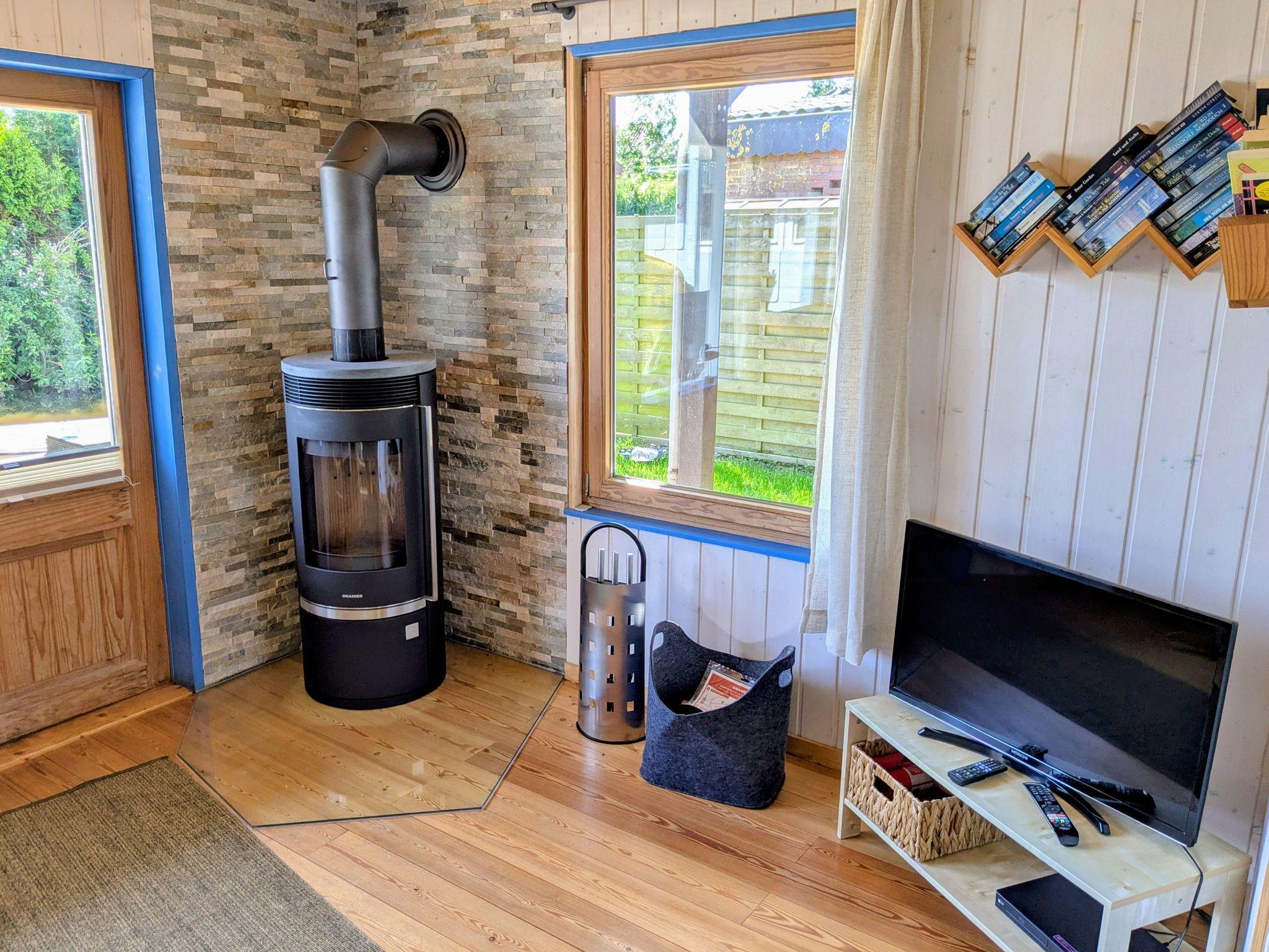 Im Untergeschoss geht die Wohnküche mit Leseecke direkt über ins Kaminzimmer gemütlicher Sitzgruppe und TV. Von hier treten Sie heraus auf eine Veranda, die in den Garten mit Bootssteg führt.