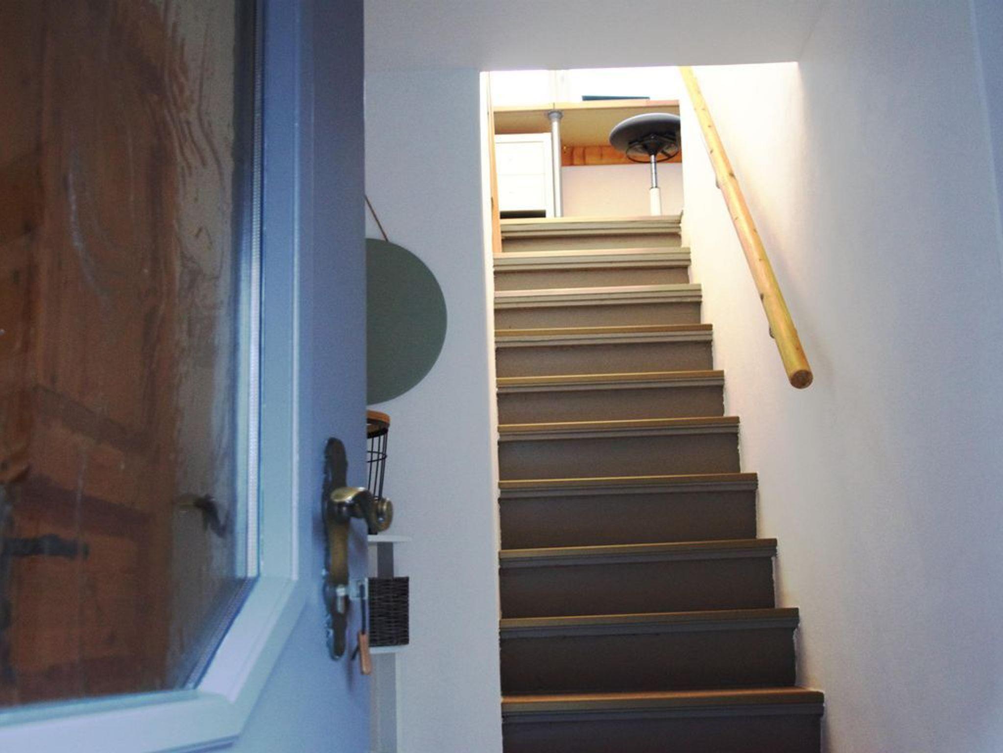 Im 1. Stock befindet sich ein fenstergelegener Schreibtisch, der eine angenehme Arbeitsmöglichkeit bietet. Rechts vom Flur liegt das Schlafzimmer mit einem komfortablen Doppelbett und Babyausstattung wie einem Gitterbett. Auf der anderen Seite finden Sie das Badezimmer mit einer Toilette und einer großräumigen Dusche.