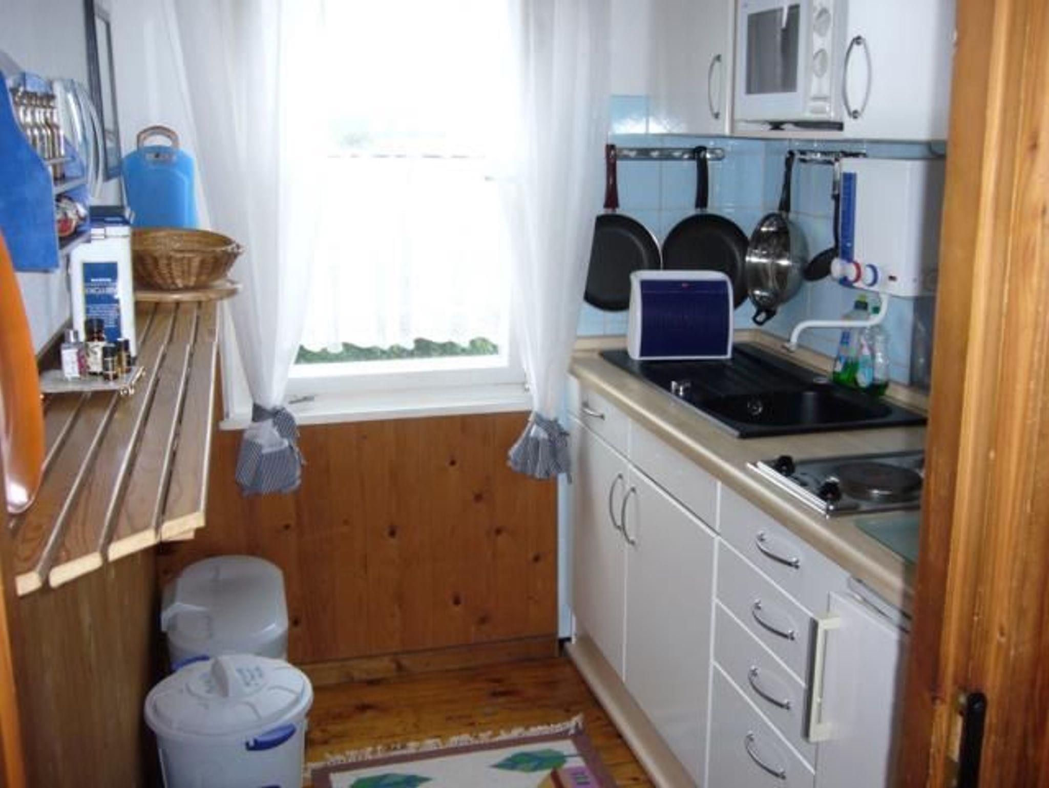 In der gut ausgestatteten Einbauküche finden Sie einen Elektroherd mit Backofen, eine Spüle, einen Kühlschrank sowie eine Kaffeemaschine, einen Wasserkocher und einen Toaster. Zudem sind alle notwendigen Küchenutensilien wie Töpfe, Pfannen, Geschirr, Gläser und Besteck vorhanden.