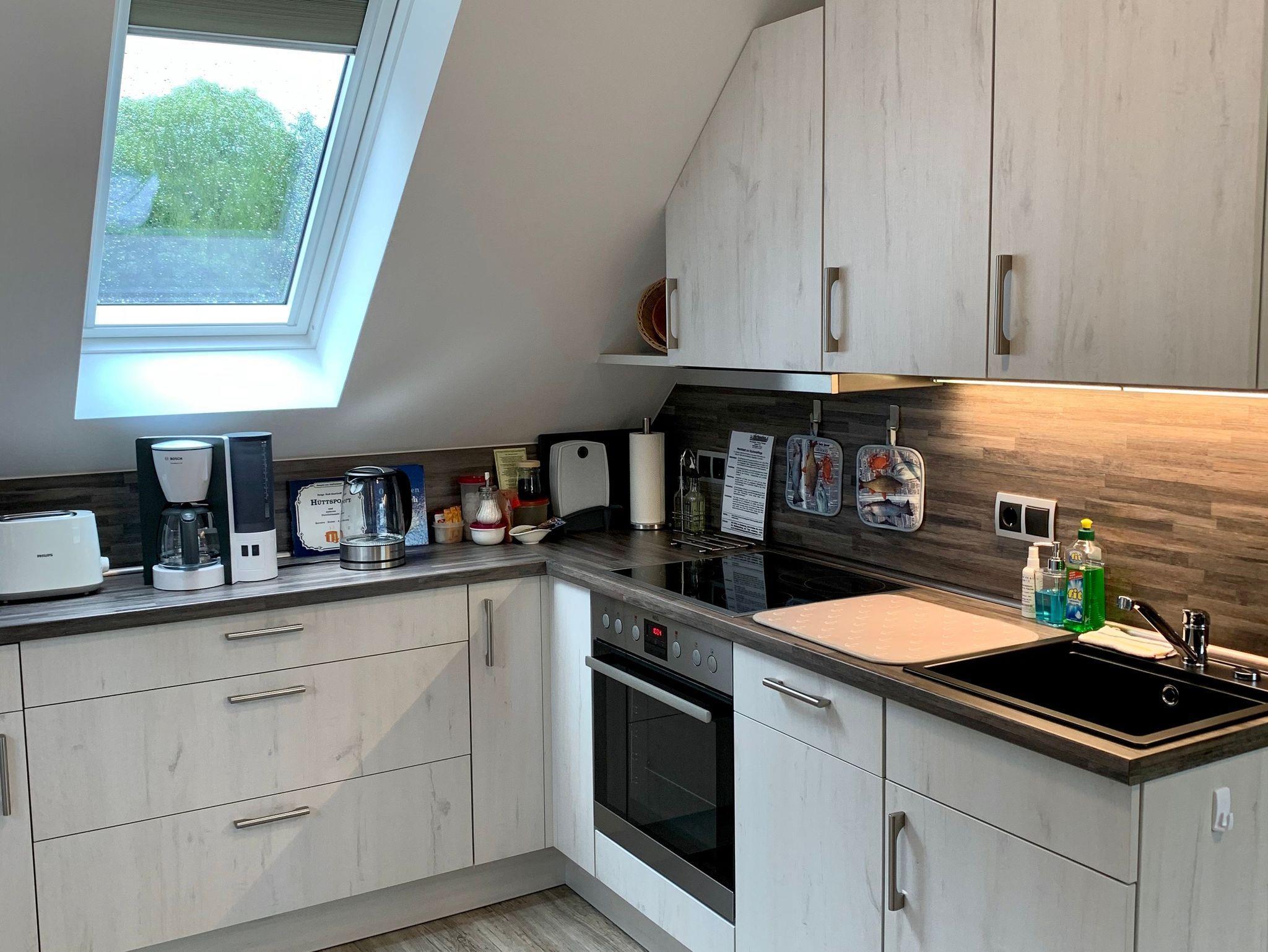 Unsere gut lichtdurchflutete Ferienwohnung in hochwertiger Ausstattung befindet sich im Obergeschoss und bietet genügend Platz für 2 - 3 Personen. Fußbodenerwärmung im Küchen-Wohnbereich und Windfang. Das Ambiente einer im Jahr 2020 fertiggestellten, zeitlich modernen Wohnung lässt keine Wünsche offen. Das 2700 m² große Grundstück bietet ausreichend Freiraum.