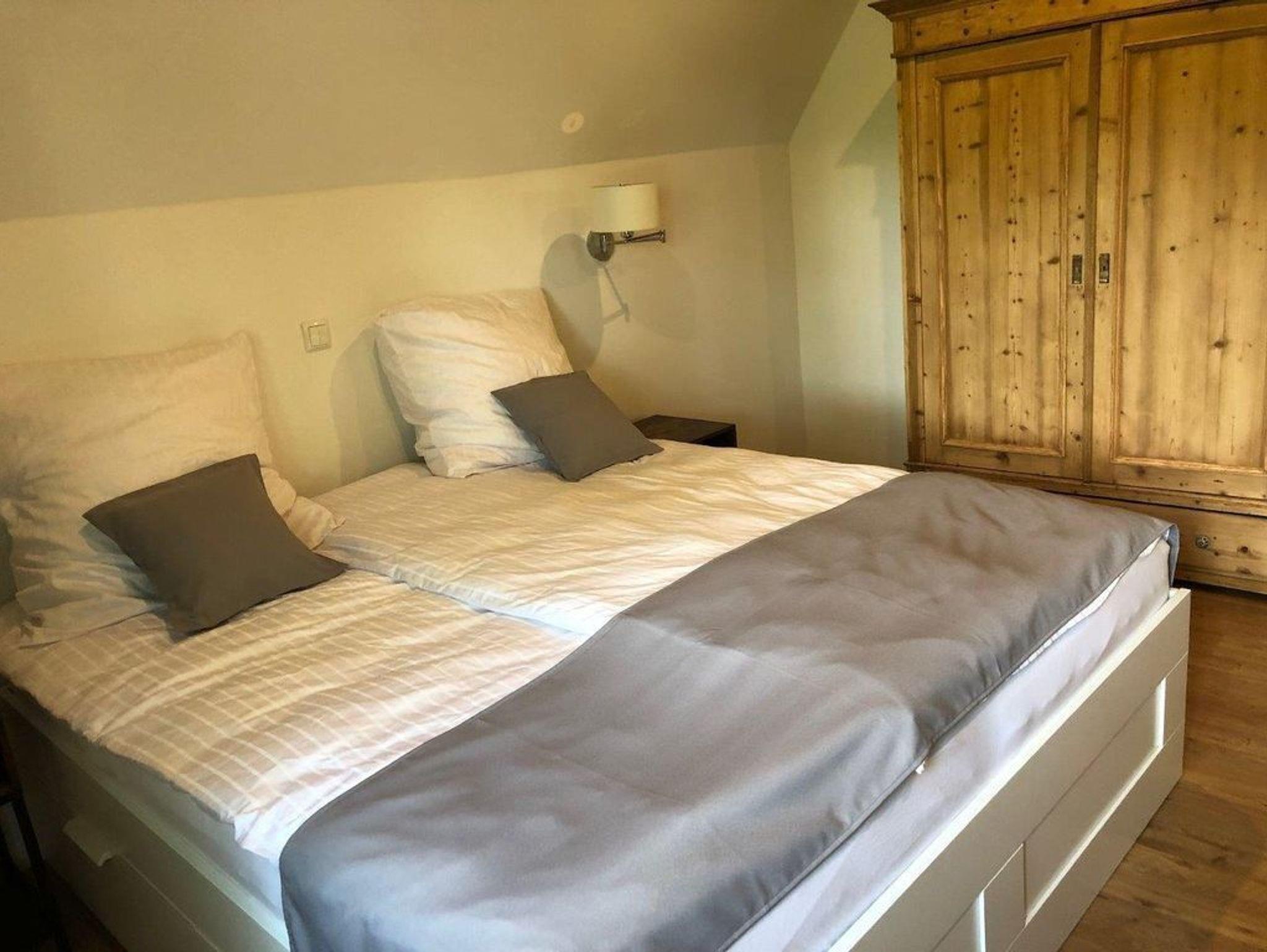 Das Ferienhaus bietet auf zwei Etagen eine umfassende Ausstattung für einen komfortablen Aufenthalt. Im Obergeschoss befinden sich drei Schlafzimmer mit unterschiedlichen Doppelbettgrößen (1,40 x 2,00 m, 1,60 x 2,00 m und 1,80 x 2,00 m), wobei Bettdecken, Bezüge und Handtücher im Preis inbegriffen sind. Das großzügige Badezimmer verfügt über eine große Badewanne, eine separate Regendusche, einen Waschtisch, eine Toilette und einen Haartrockner. Ein Balkonzimmer mit Schreibtisch und Balkon ergänzt das Angebot im Obergeschoss.