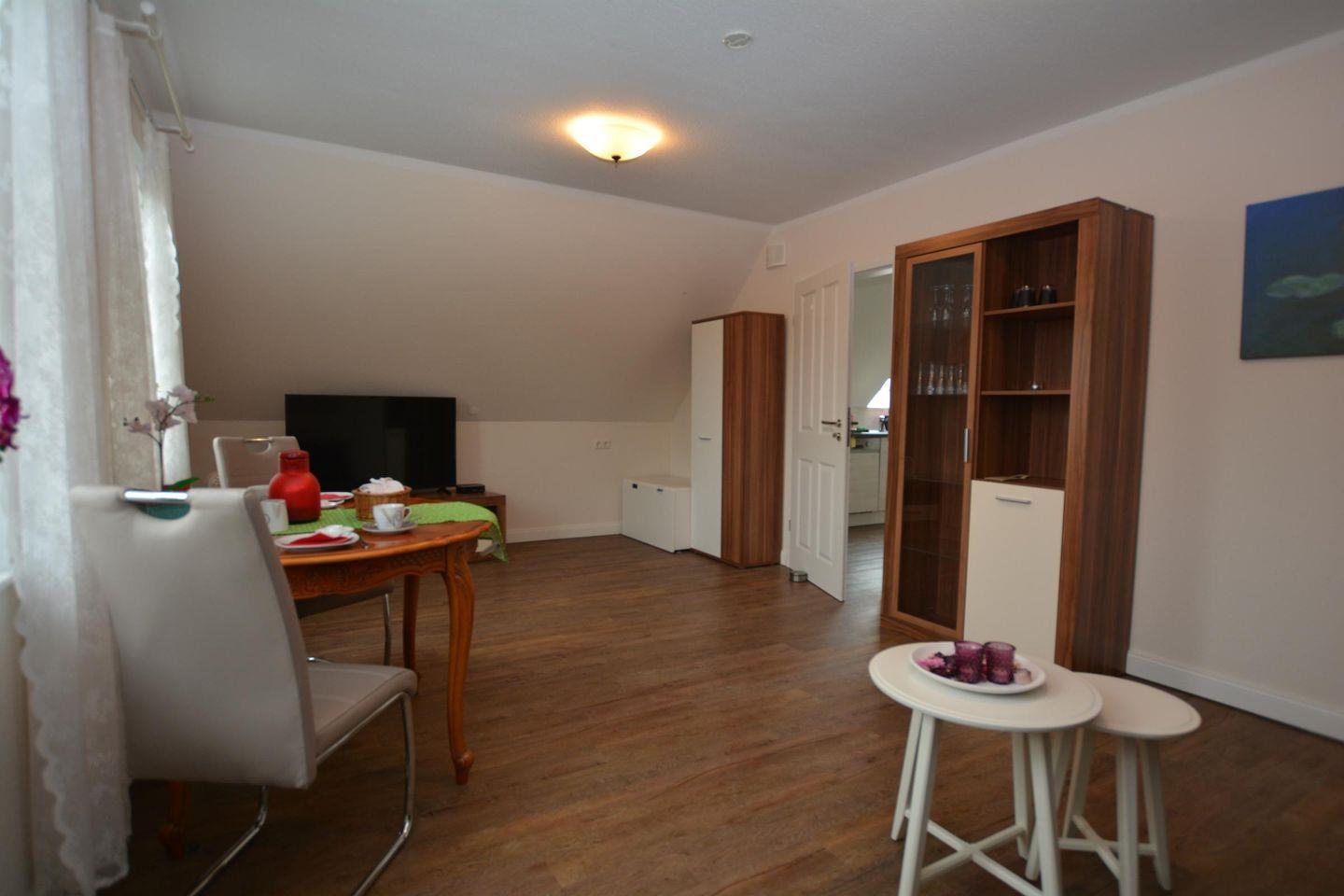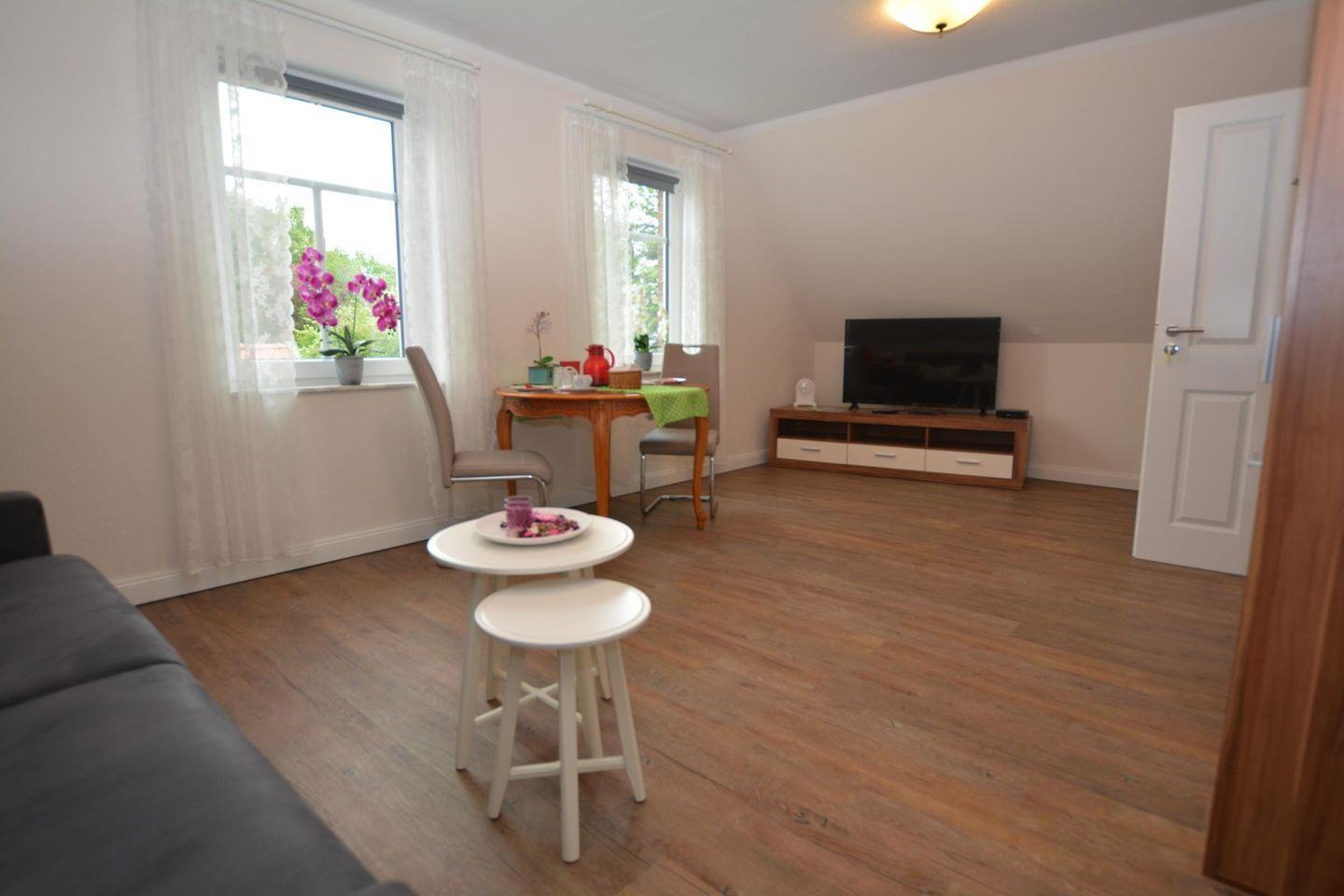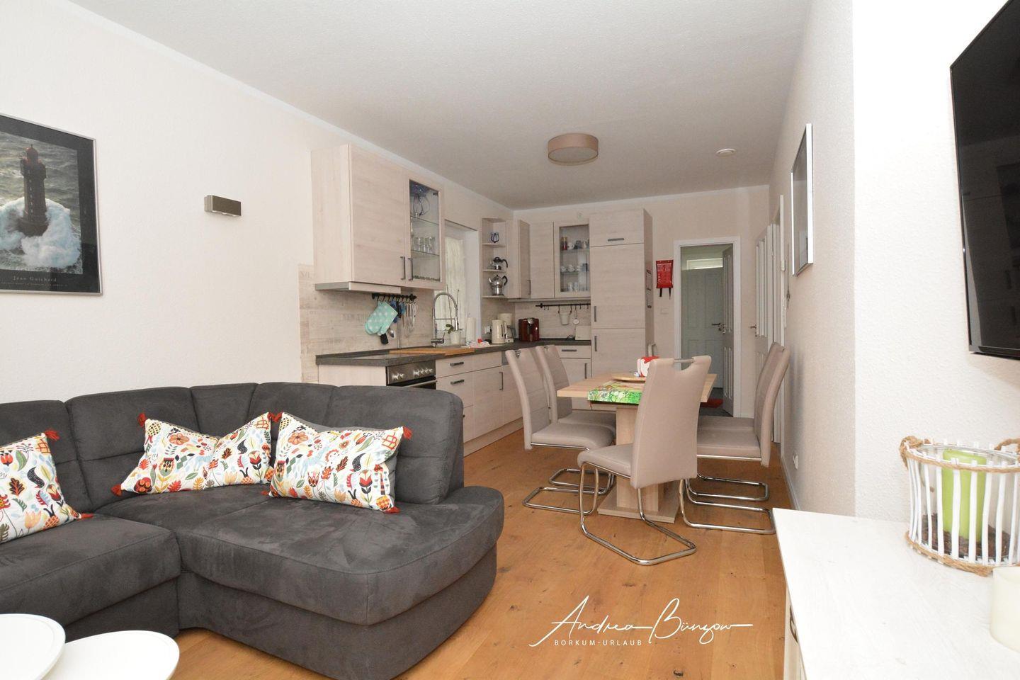 Im Erdgeschoss befindet sich die Wohnküche als Gemeinschaftsraum mit TV, Blue-Ray-Player und Stereoanlage.