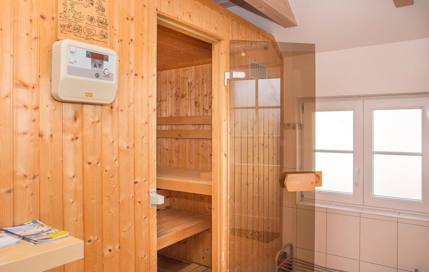 Die Wohnräume sind großzügig und komfortabel eingerichtet, inklusive einer modernen, komplett ausgestatteten Küchenzeile, die mit Geschirrspüler, Backofen, Ceranfeld und Mikrowelle keine Wünsche offenlässt. Alle Bäder sind mit Fußbodenheizung und Handtuchheizkörpern ausgestattet. Im Wohnzimmer tragen Fernseher, Telefon, Stereoanlage mit DVD-Player sowie ein Internet-Anschluss zur Unterhaltung bei. Es gibt ein bis zwei Schlafräume, sowohl mit Doppelbett als auch mit Einzelbetten. Auch Saunafreunde kommen nicht zu kurz: Die im Nebengebäude auf dem Grundstück befindliche Sauna ist ganzjährig für Sie betriebsbereit. Ebenfalls im Nebengebäude befinden sich eine Waschmaschine und ein Trockner.
