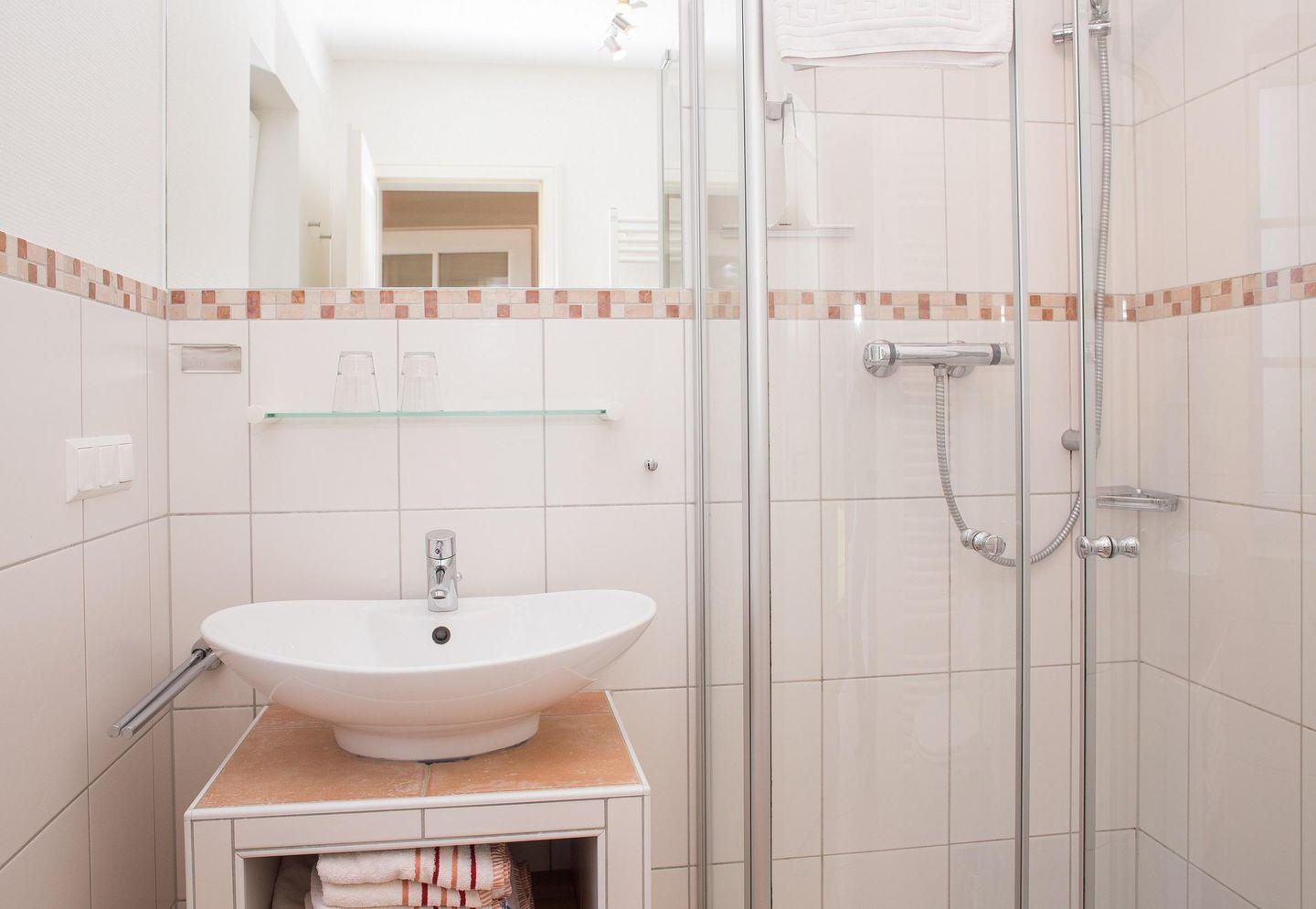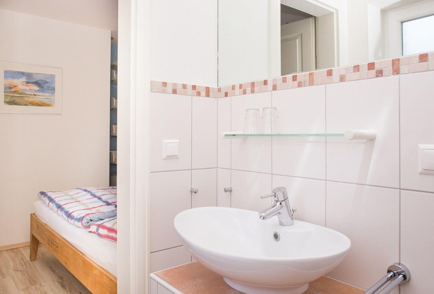Die Wohnung Ausguck befindet sich im Erdgeschoss in süd-westlicher Ausrichtung und ist für bis zu vier Personen geeignet. Die Wohnung verfügt über 50 m². Hinter der Wohnungseingangstür liegt ein kleiner Flur, von dem aus man den Essbereich und den Wohnbereich erreichen kann. Vom Wohnbereich aus gelangt man auf die direkt angrenzende Terrasse, die Ihnen mit Gartenmöbeln & Strandkorb & Strandkorb zur Verfügung steht. Die geräumige und komplett ausgestattete Küchenzeile ist in den Wohnbereich integriert und lässt mit Geschirrspüler, Backofen, Ceranfeld und Mikrowelle keine Wünsche offen. Auf der gleichen Ebene befinden sich ein Duschbad mit Fußbodenheizung und Handtuchheizkörper sowie zwei Schlafzimmer, eines mit einem Doppelbett und eines mit zwei Einzelbetten. Das Doppelbettschlafzimmer verfügt über ein eigenes, separates WC. In der Wohnung befinden sich ein Fernseher, ein Telefon, eine Stereoanlage mit DVD-Player sowie ein Internet-Anschluss. Auf Anfrage werden Babybett und Hochstuhl zugestellt.