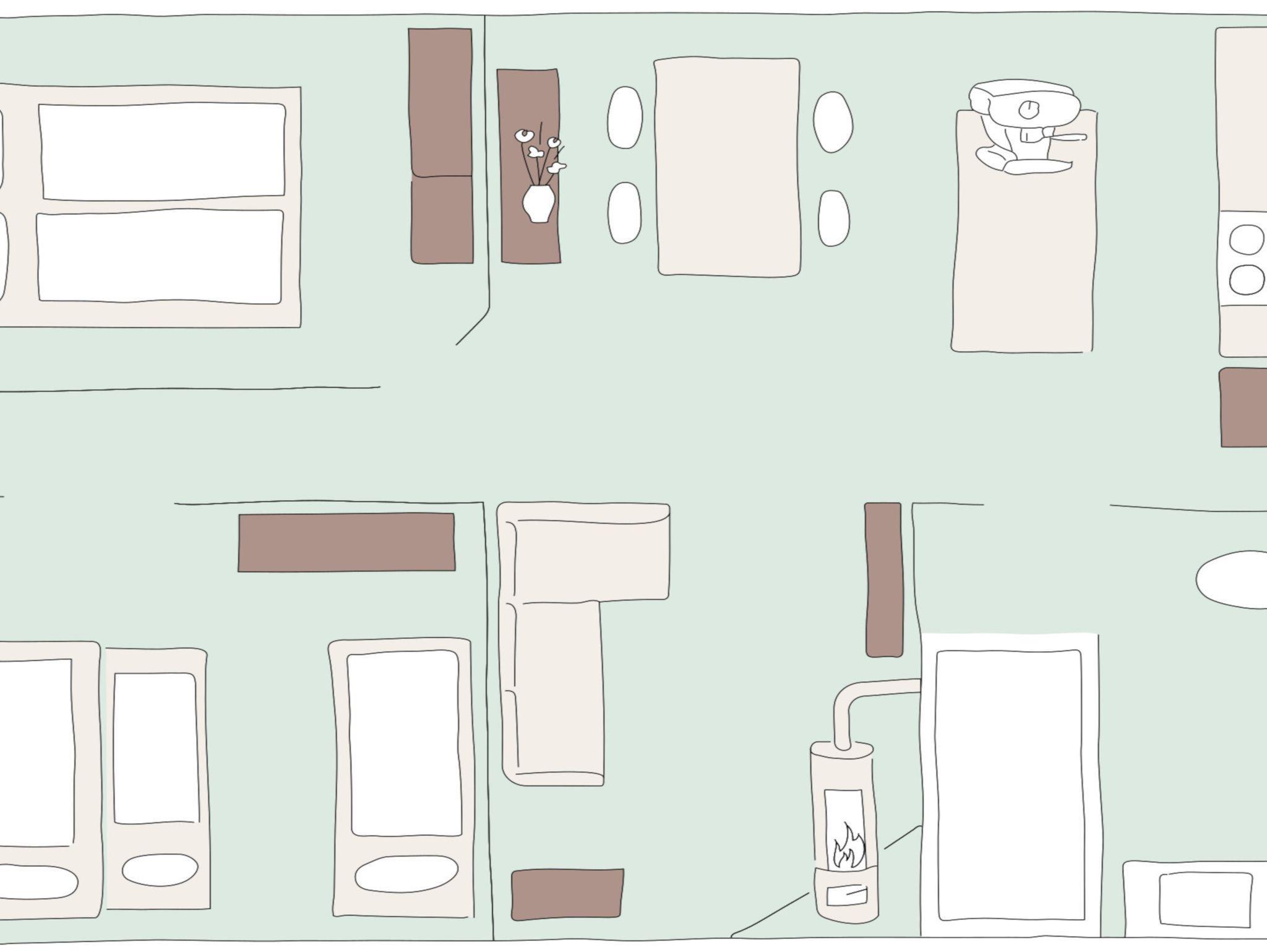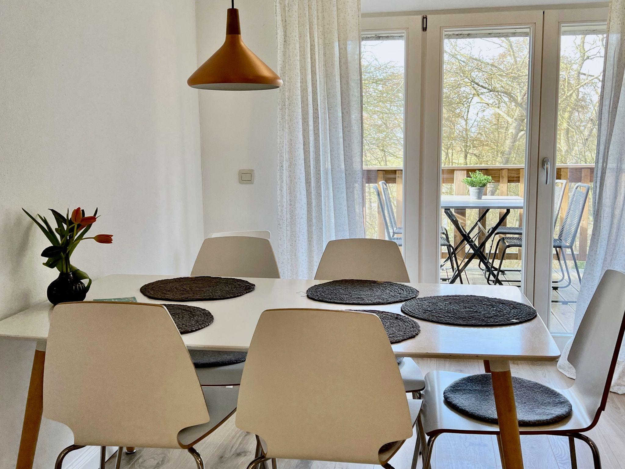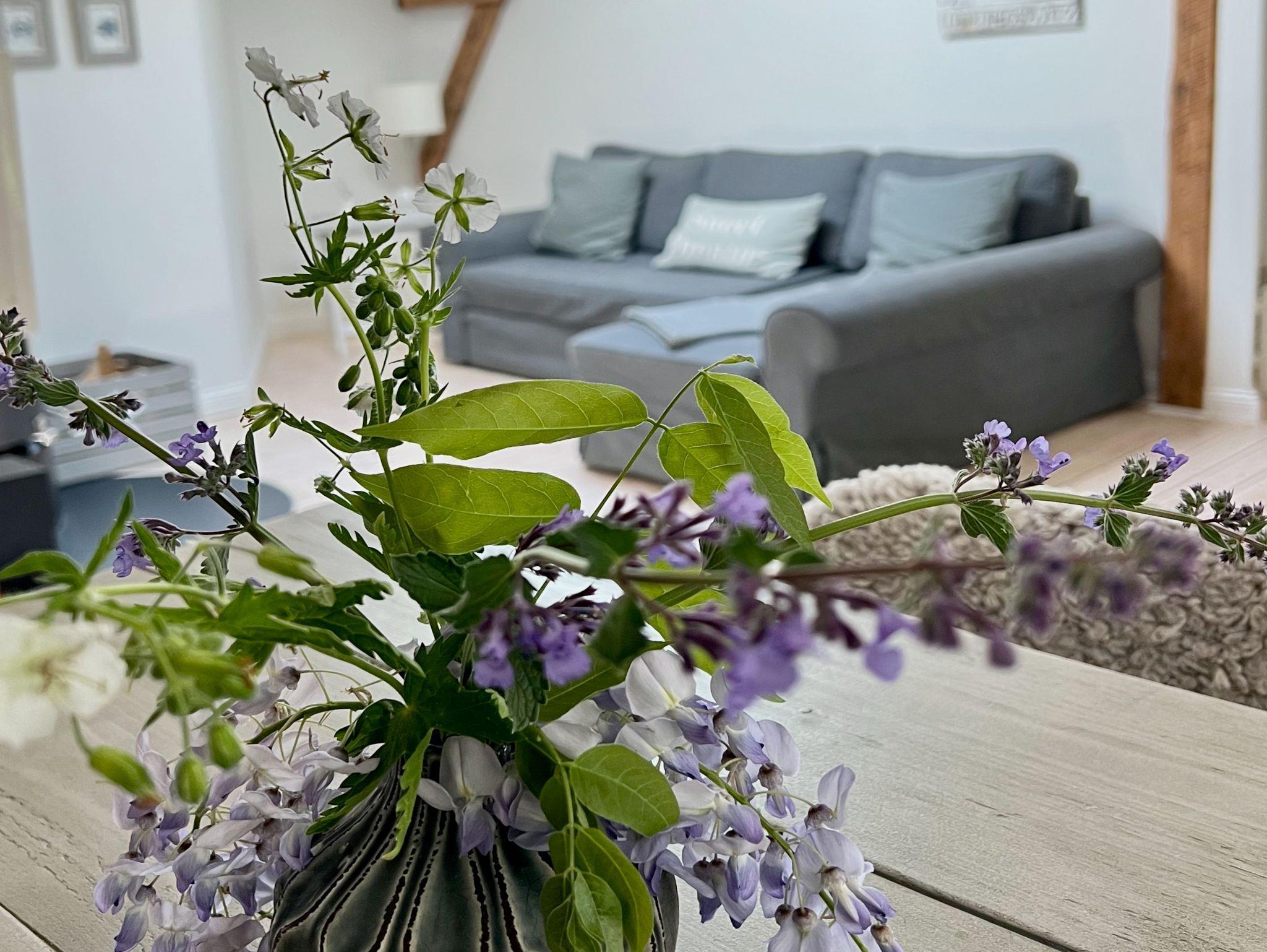 Die hell und freundlich im Beachstyle eingerichtete 65 qm große Wohnung ist für 4 bis maximal 5 Personen. Das Zentrum der Wohnküche bildet der Küchentresen, an dem man es sich mit einem Gläschen auf den Barhockern gemütlich machen kann. Ein Kamin sorgt im Wohnraum für Gemütlichkeit und Wärme und die freigelegten Holzbalken verleihen den gesamten Räumlichkeiten einen besonders gemütlichen Charme. Vom Kinderzimmer aus kann man den Hof überblicken, somit sind die Kinder immer nah am Geschehen. Das Elternschlafzimmer und der Wohn- Essraum liegen nach hinten heraus, mit dem Blick auf den Bauerngarten. In dem größzügig geschnittenen Badezimmer kann man sich unter der Regendusche entspannen.