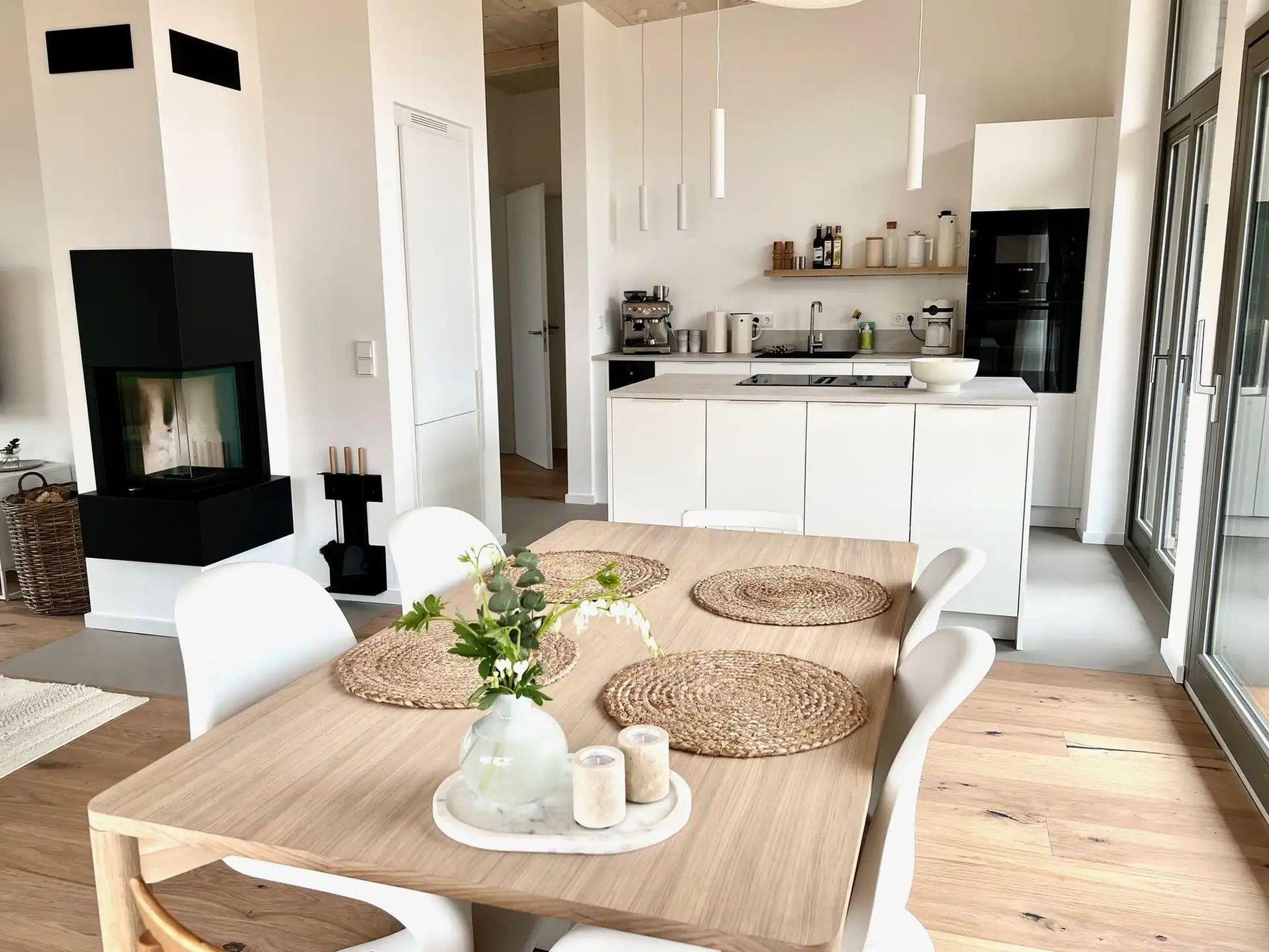 Moderne Architektur und Design trifft auf Natur Dieses exklusive Designhaus, nur 50 Meter vom Hof entfernt, wird Ostern 2025 fertiggestellt. Auf 100 m² Wohnfläche kombiniert es Komfort mit einem hellen, minimalistischen skandinavischen Wohnstil, der Leichtigkeit und Frische entstehen lässt. Zwei Schlafzimmer für 4-5 Personen, große Fenster mit Blick in die Natur und überdachte Terrassen schaffen einen idealen Rückzugsort für Familien und Freunde. Der großzügige Wohn- und Essbereich mit Kamin und die voll ausgestattete Küche mit Weinkühlschrank laden zum Genießen ein. Ein Wellnessbad mit freistehender Badewanne, Panoramablick und Sauna sowie ein Außenbereich mit Hot Tub und Außendusche runden das Wohlfühlerlebnis ab. Ein Ort, der Ruhe, Weite und Komfort vereint – Architektur zum Wohlfühlen!