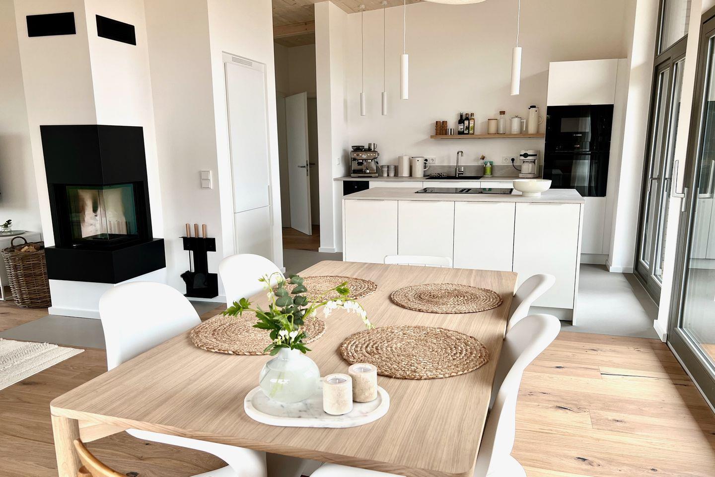Der helle, freundliche Einrichtungsstil schafft eine luftige Wohnraumgestaltung. Durch die hellen Farben entsteht Leichtigkeit und Frische, dies unterstützt den minimalistisch, skandinavischen Wohnstil. Von allen Zimmern aus hat man durch große Fenster einen Blick in die Weite. Großzügige überdachte Terrassen bieten Schutz vor Sonne und Regen. Diese luxuriöse Wohneinheit ist für 4-5 Personen geeignet. Moderner Komfort kann mit allen Annehmlichkeiten eines Bauernhofurlaubes verbunden werden.