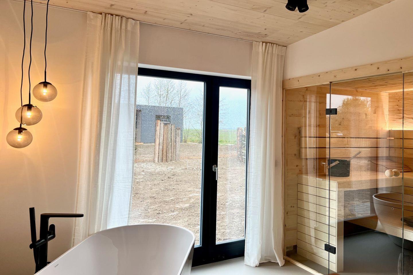 Die schwarz-weiße gewählte Einrichtung in Kombination mit der schlichten Schönheit des Natürlichen, verleiht diesem Designhaus mit eigenem Strand einen besonderen Charme von Entspannung und Leichtigkeit. Von allen Zimmern aus hat man durch große Fenster einen Blick in die Weite. Großzügige überdachte Terrassen bieten Schutz vor Sonne und Regen. Diese luxoriöse Wohneinheit ist für 4 - 5 Personen geeignet. Moderner Komfort kann mit allen Annehmlichkeiten eines Bauernhofurlaubes verbunden werden.