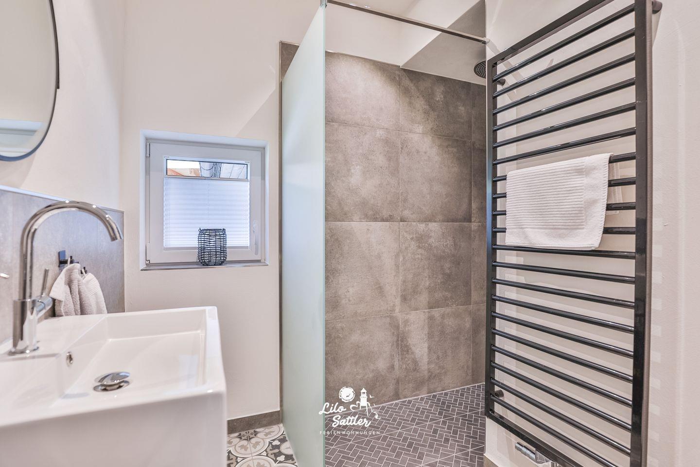 große begehbare Dusche, WC, Waschbecken mit Spiegel, Handtuchtrockner, Fenster mit Plissee
