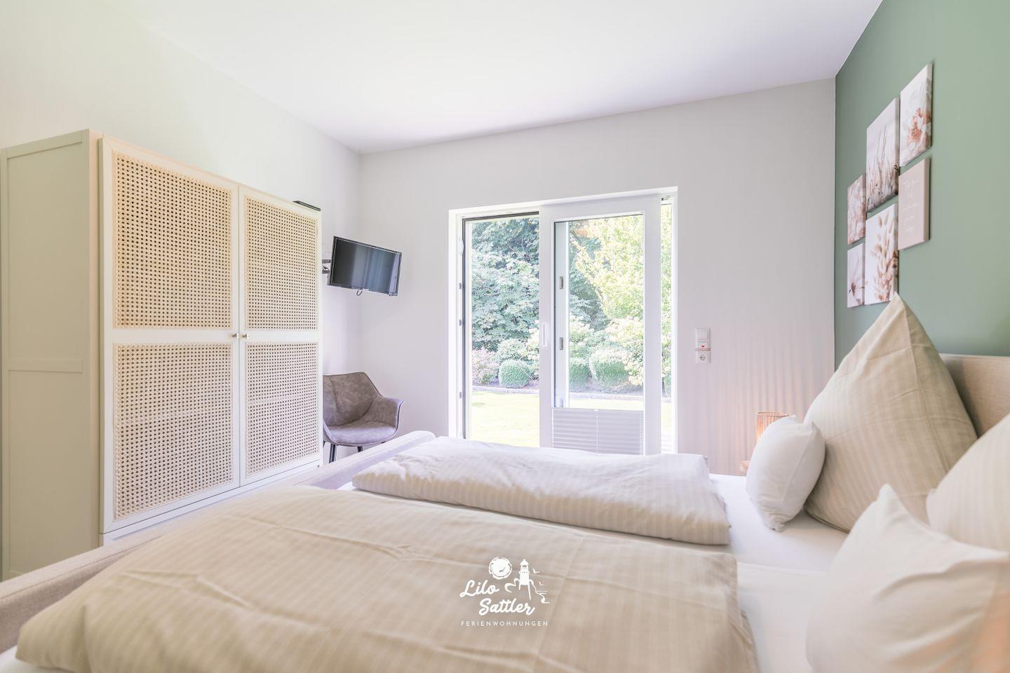 Doppelbett (200 x 180 cm) mit getrennten Matratzen, Lattenrost Kopf- und Fußteil verstellbar, Kleiderschrank 2-türig, Kommode, Ganzkörperspiegel, Sessel, TV, Fenster mit Verdunkelungsplissees, Zugang zum Garten