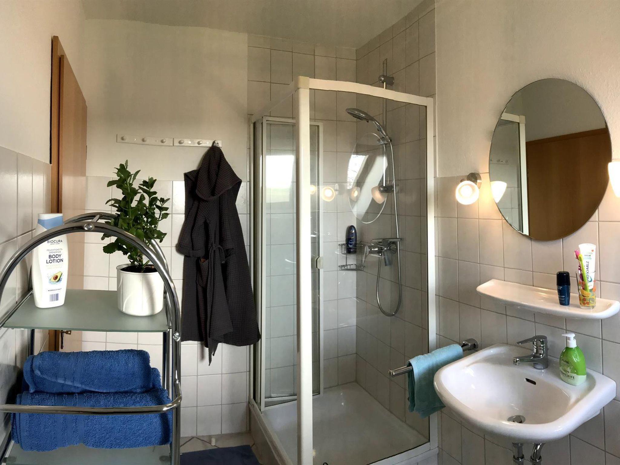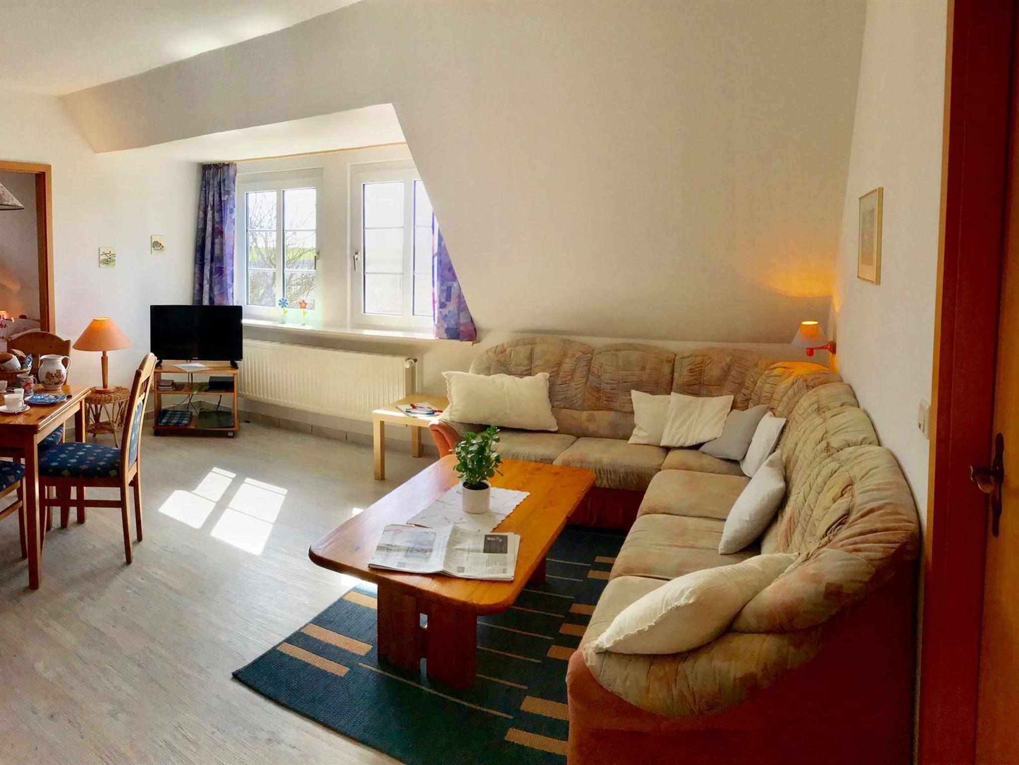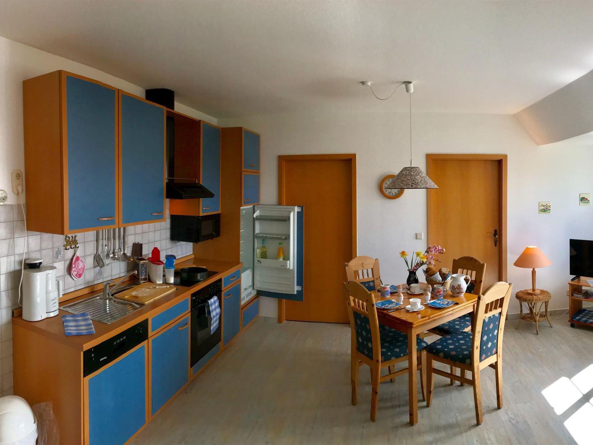 Die Ferienwohnung bietet 2 Schlafzimmer auf 50 qm, ein Duschbad und ein Großzügigen Wohn-, Koch- und Essbereich. Kinderbetten oder Zustellbetten lassen sich zusätzlich unterbringen. Die Küchenzeile ist komplett ausgestattet (Kühlschrank,Herd, Microwelle, Geschirrspühler, etc.). Sat-TV ist vorhanden.Waschmaschine und Wäschetrockner stehen bei Bedarf zur Verfügung.