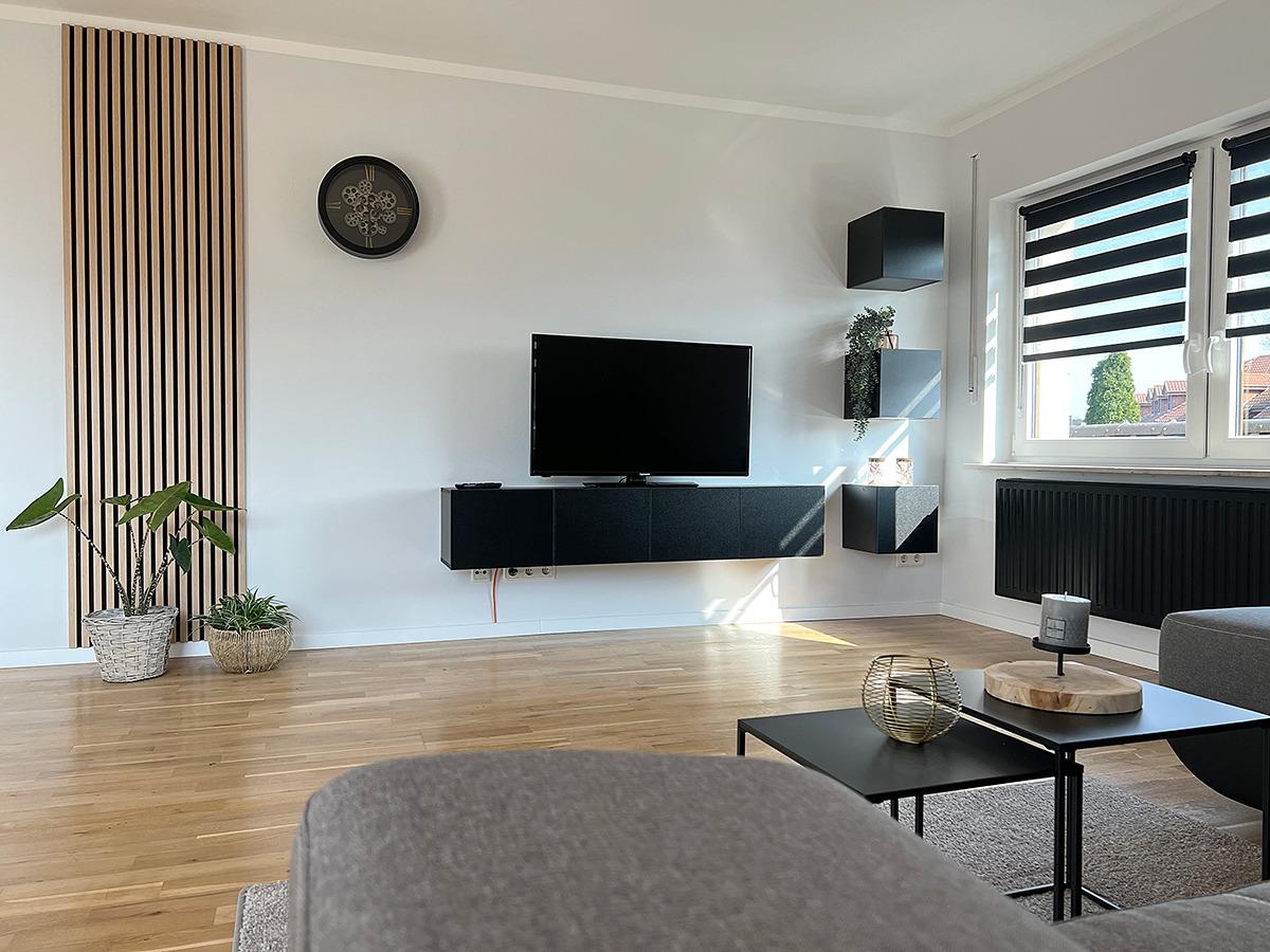 Unsere Ferienwohnung verfügt über ein großes Wohnzimmer. Eine Küche mit großem Essbereich, Bad mit WC und Dusche, drei getrennte Schlafzimmer (eins davon mit zusätzlichen Smart-TV), Hauswirtschaftsraum mit Waschmaschine und Gefriertruhe, eigenem Garten und einer gemütlichen Hütte zum sitzen. Ein Grill steht selbstverständlich zur Verfügung.