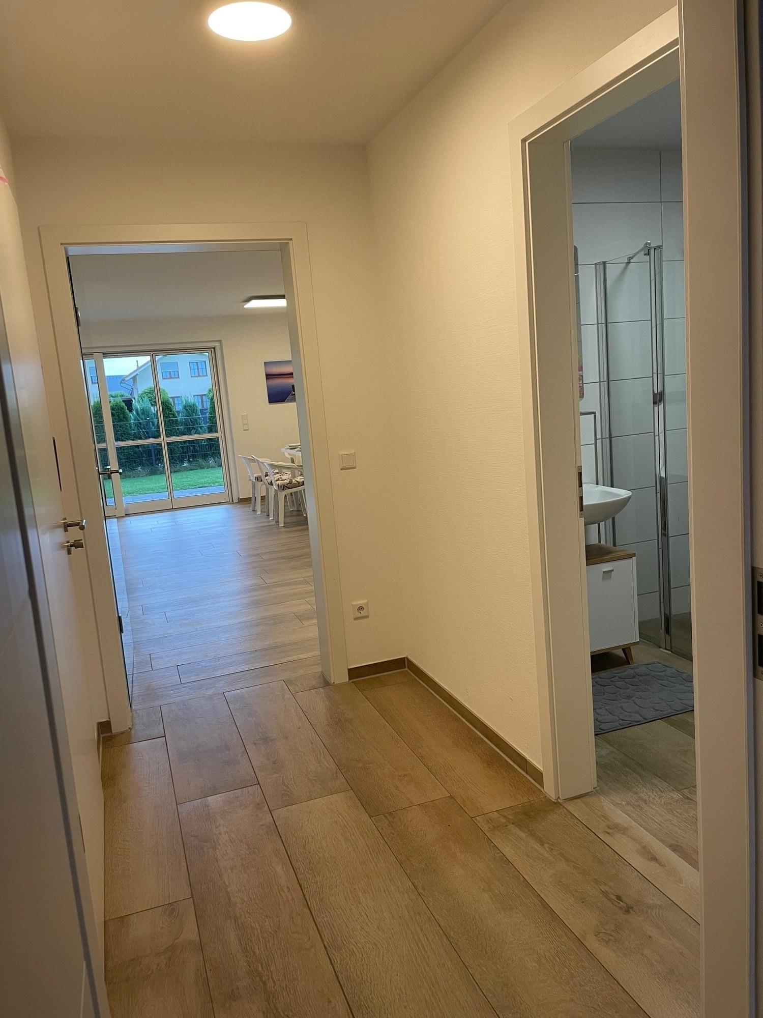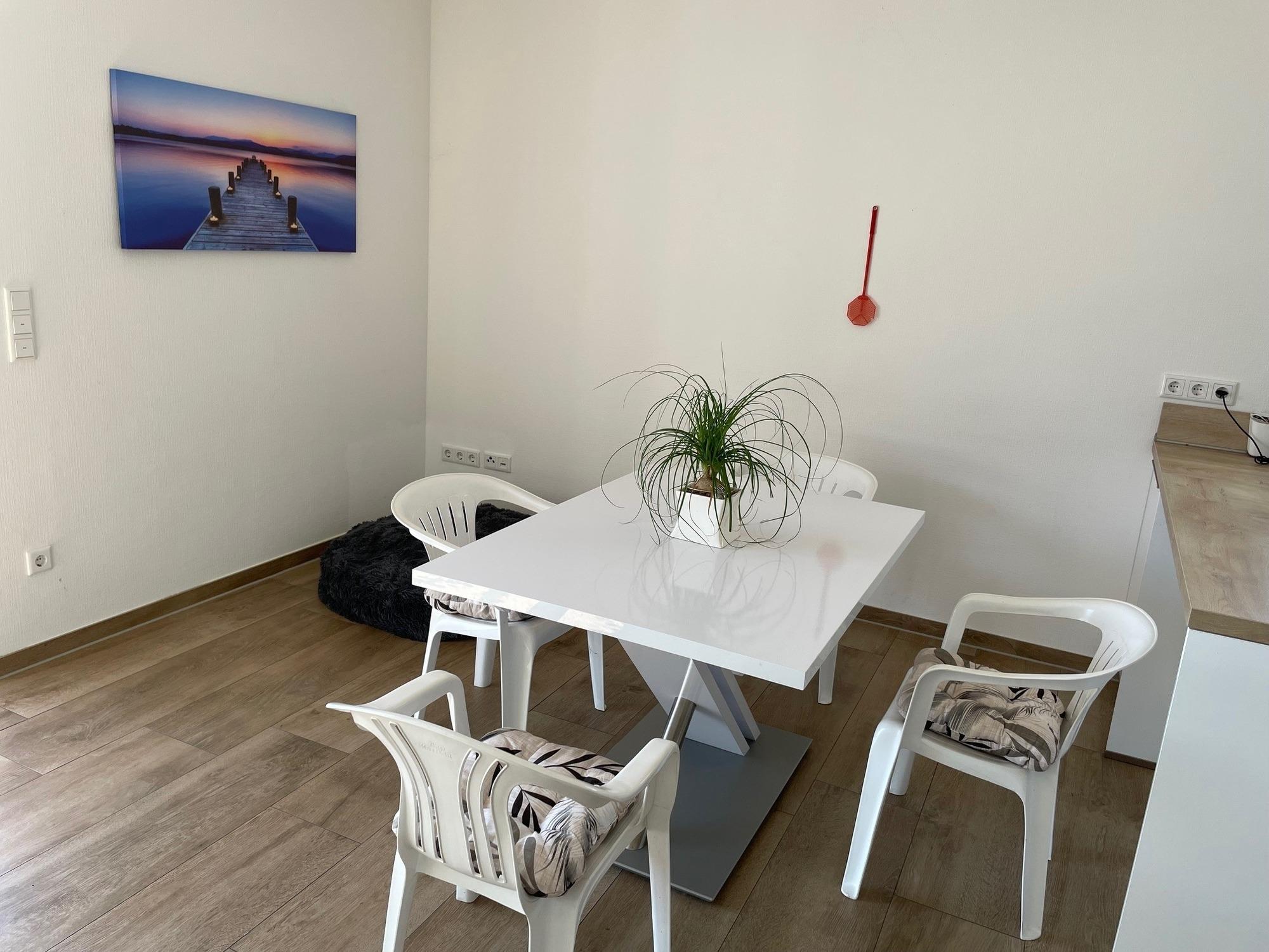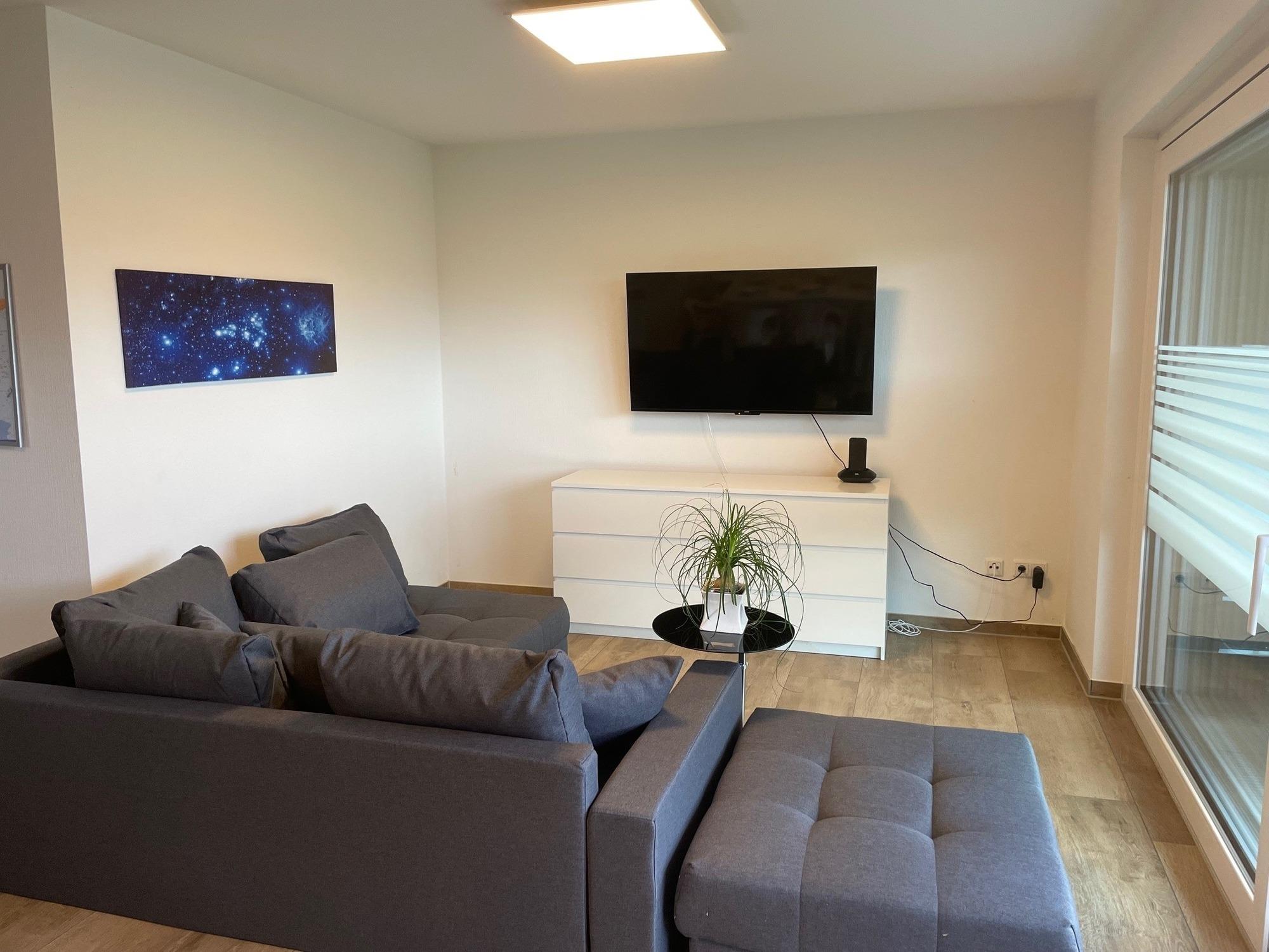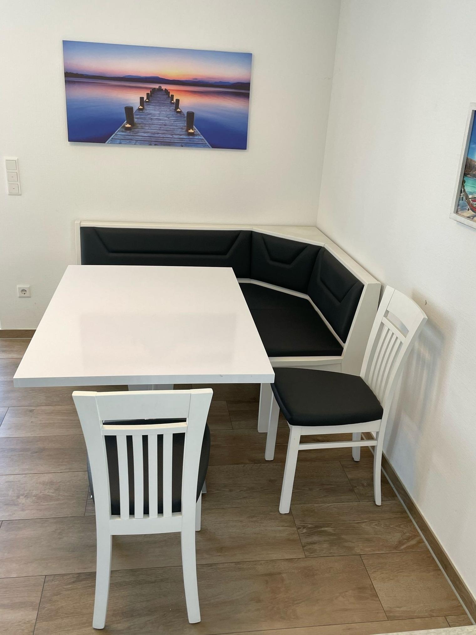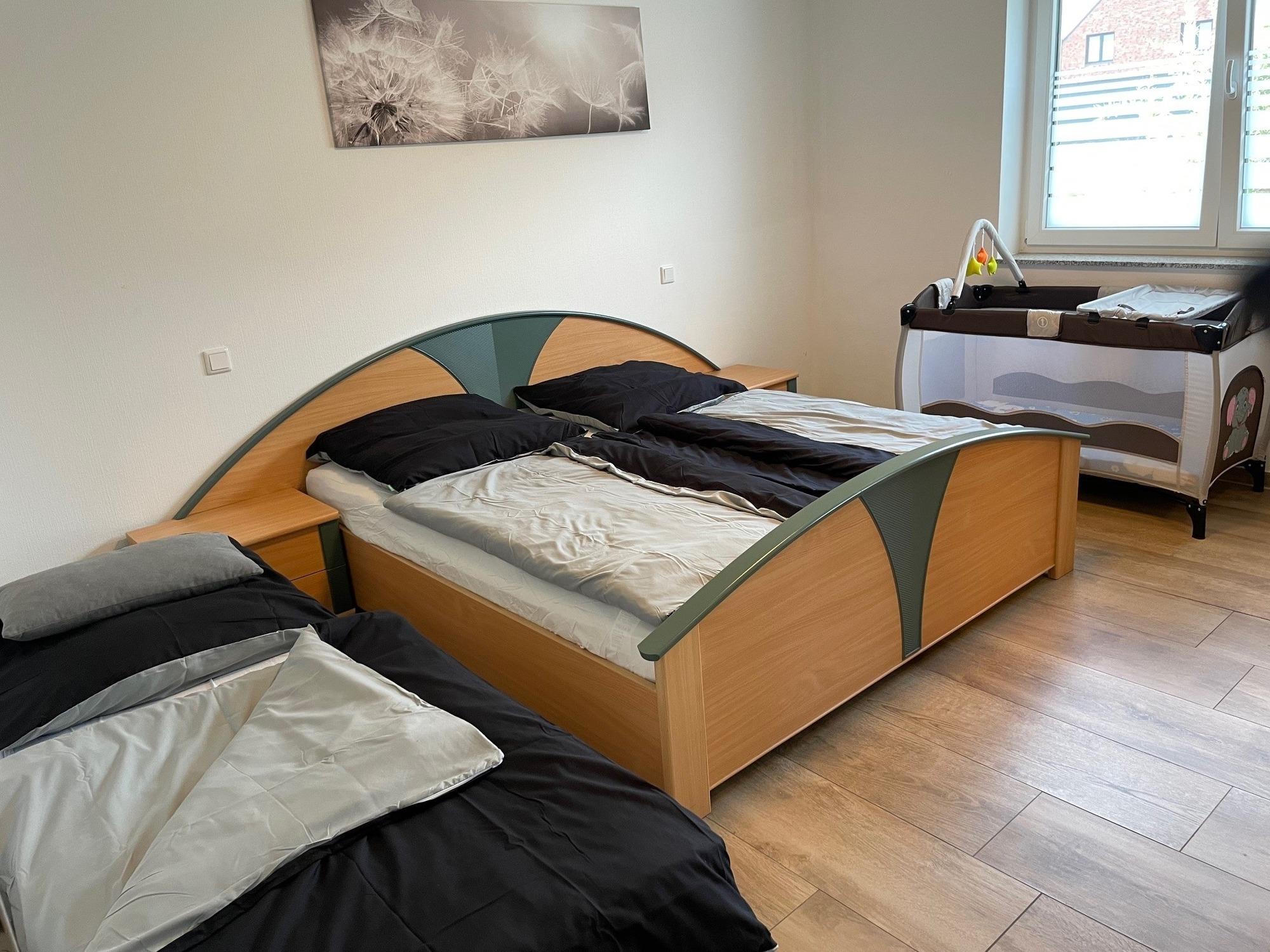 Wohnungsgröße: circa 70qm, 1 Schlafzimmer mit Doppelbett und geräumigem Kleiderschrank und Stellfläche für Ein-Personen-Zustellbett, Wohn-Esszimmer-Küche mit Einbauküche einer Eckbank mit 2 dazu passenden Stühlen und einem Ausziehtisch und in der Küche die wichtigsten Koch-Utensilien, Geschirr, Gläser und Besteck. WLAN & TV-Gerät. Couch-Schlaflandschaft für 2-3 Personen, Bad/WC/Dusche ebenerdig & barrierefrei
