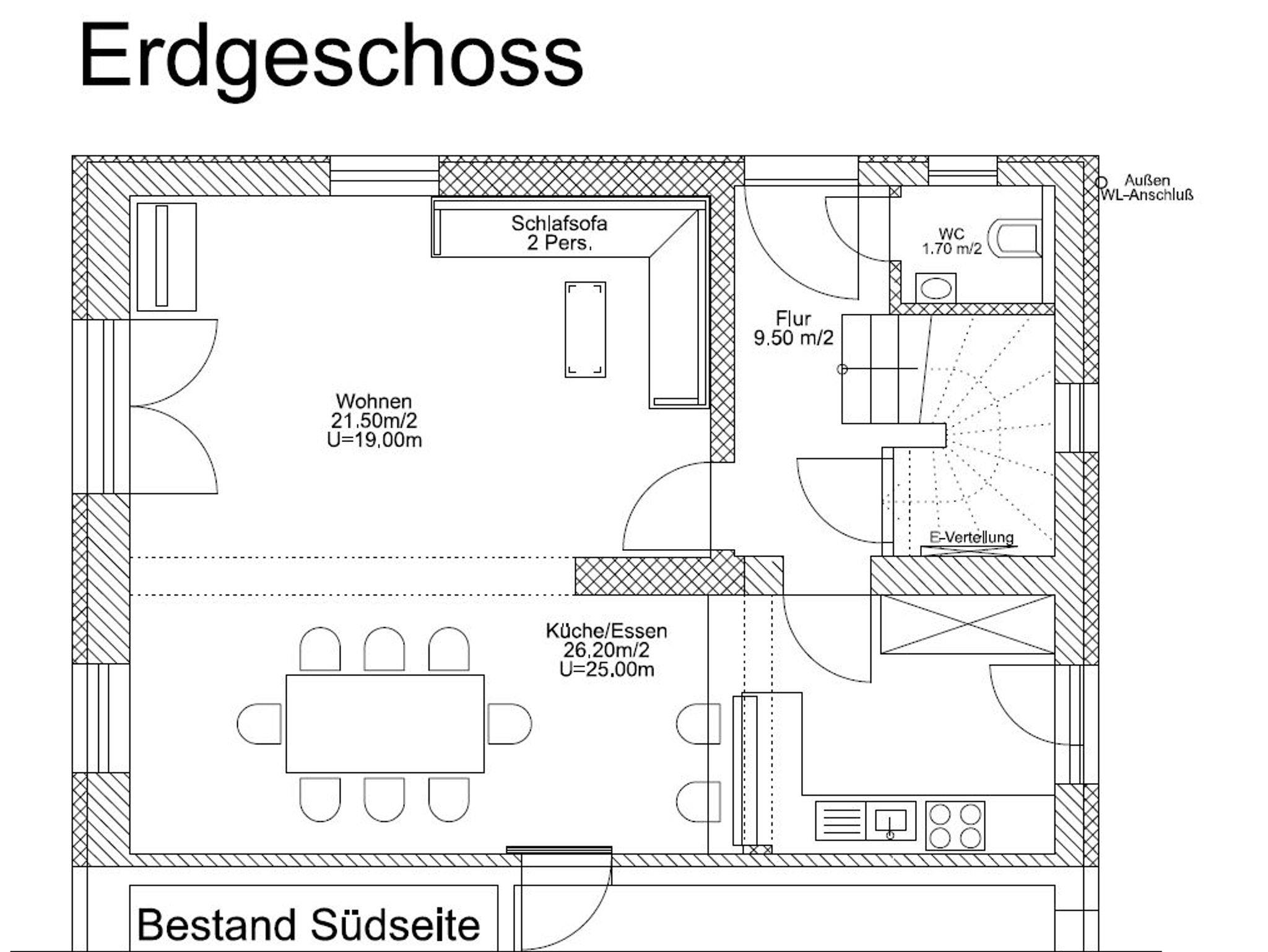 2 Schlafzimmer im OG, 1 Schlafzimmer im DG mit Bad en Suite und können noch zwei Personen im Wohnzimmer EG (Schlafsofa) schlafen.1 Bad mit Dusche und Toilette im OG. 1 Toilette im EG. Komplett möbliert und mit einer offenen Küche ausgestattet. Weitere Ausstattungsmerkmale: Fußbodenheizung, begehbare Dusche, Badewanne, Bad eu Suite, Waschmaschine, Wäscheständer, W-Lan, Flat-TV 50 Zoll, Raum für Fahrräder, 2-3 Fahrräder zur freien Benutzung. Mit zwei Terrassen (Ost-/Westseite) und teilüberdachter Sitzfläche mit Grillplatz.Ferienhaus für 8 Personen möglich.