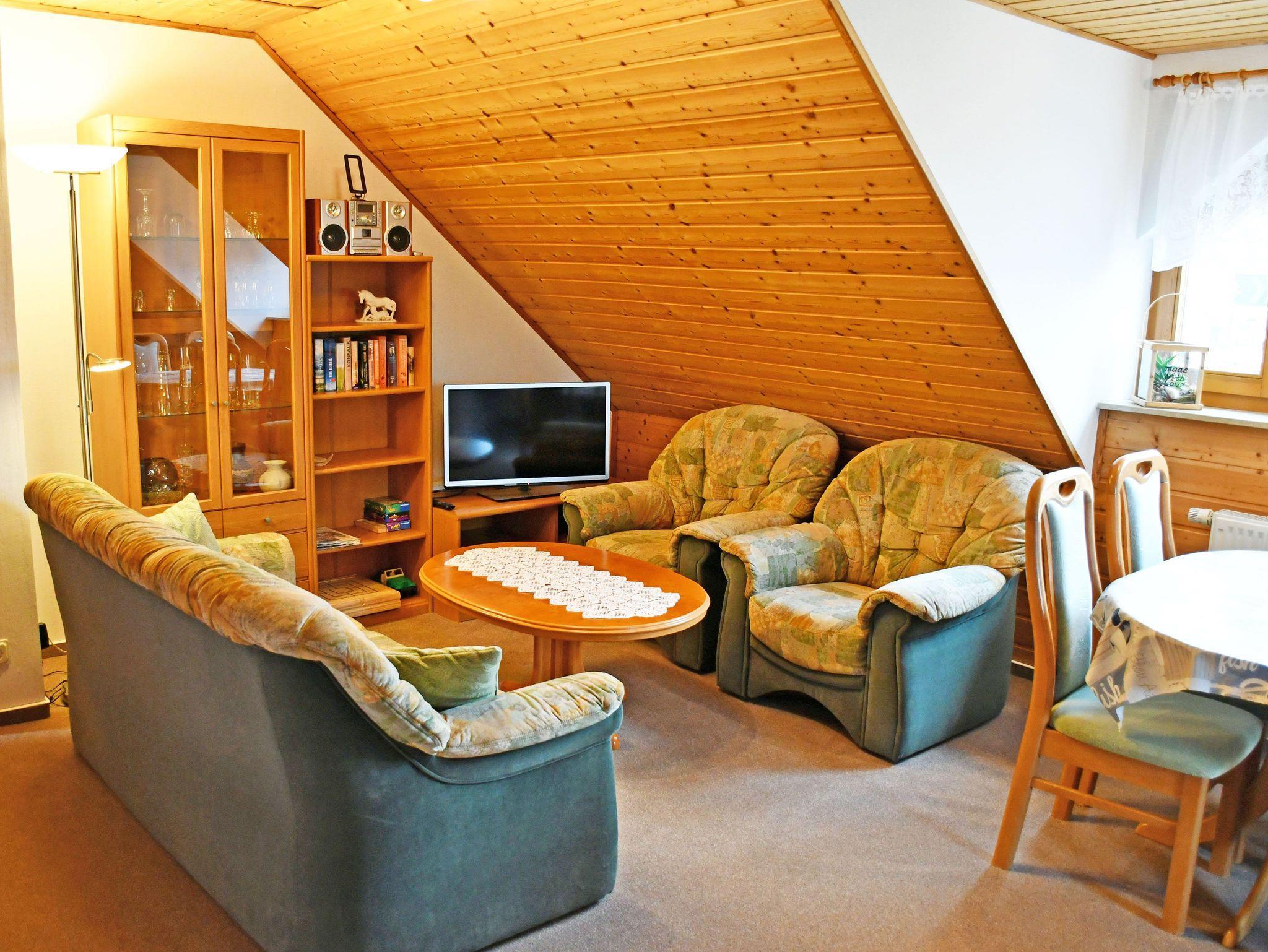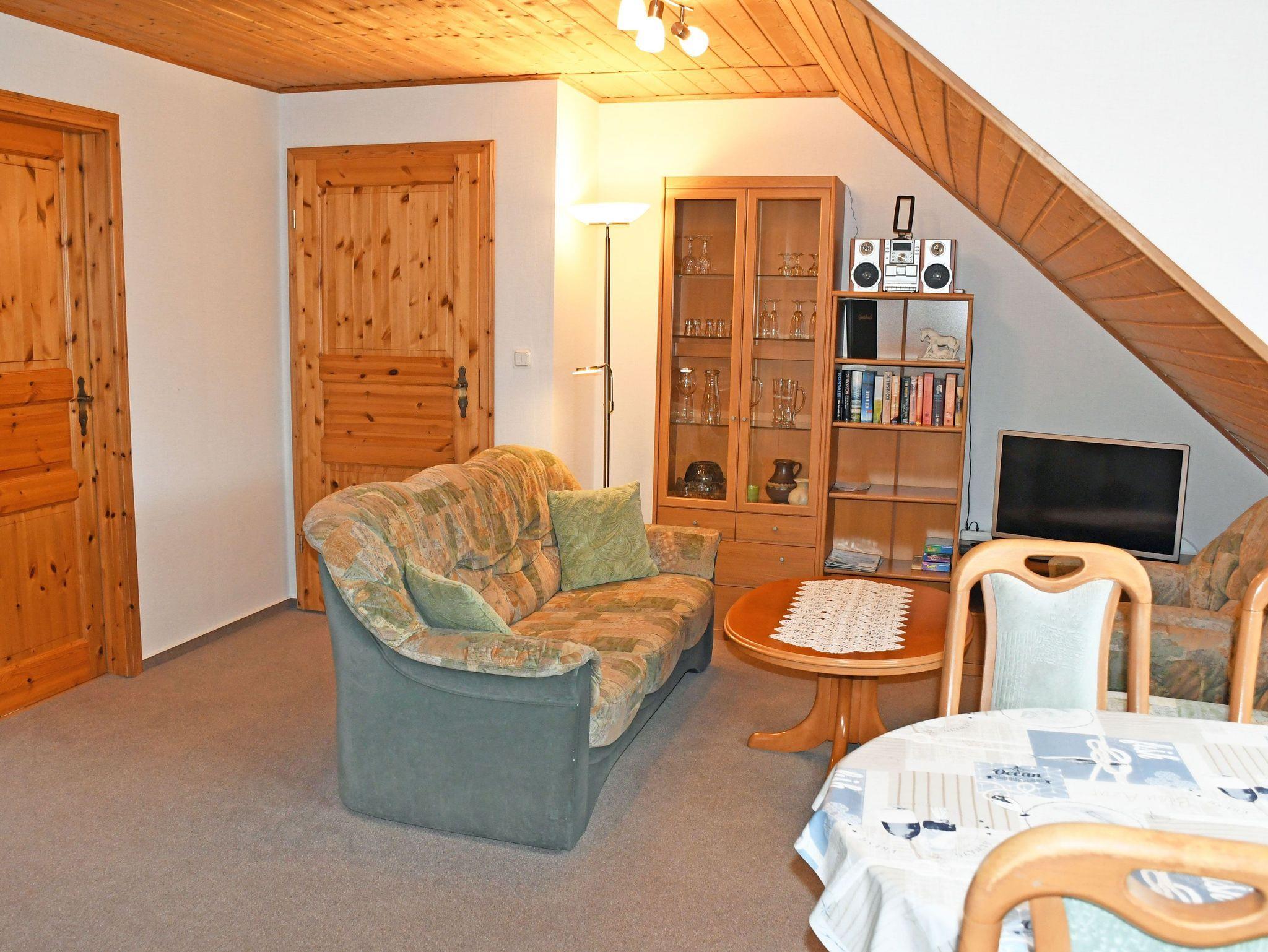 Im Wohnraum befinden sich eine bequeme Sitzcouch mit Tisch und ein modernes Flachbild-TV-Gerät sowie einem CD-Player. Hier steht für Sie auch ein Esstisch mit Sitzgelegenheiten.