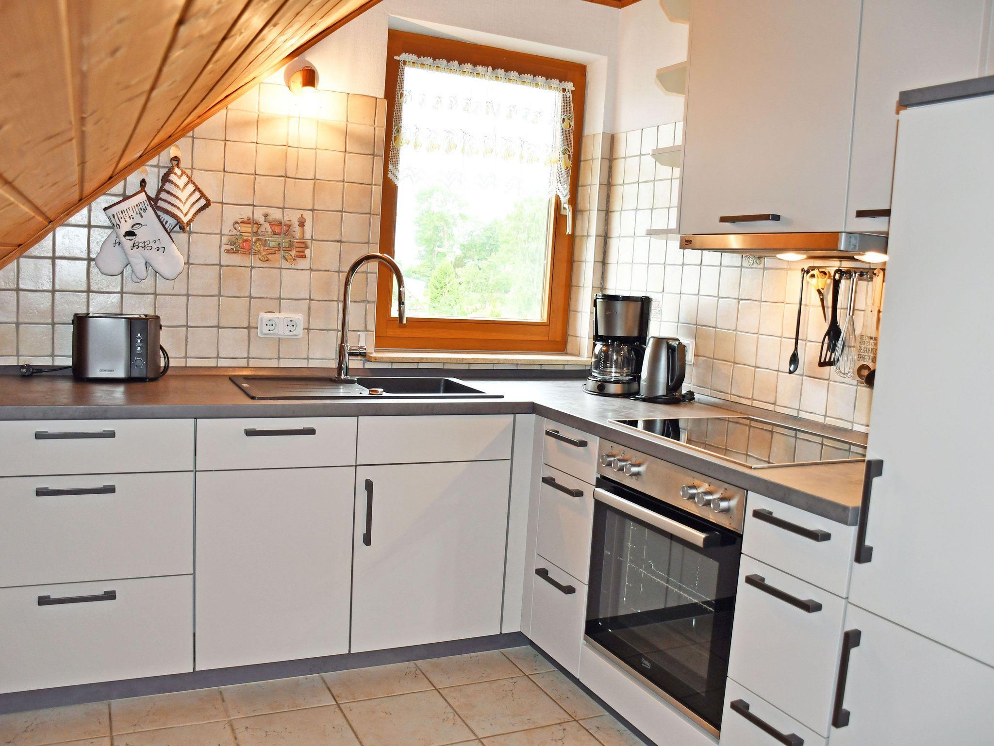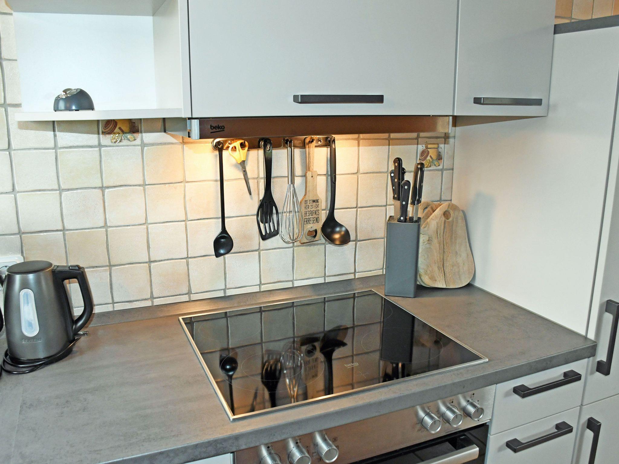 Die moderne Küchenzeile ist mit einem Herd, Abzugshaube, Spülmaschine, Backofen, Wasserkocher, Kaffeemaschine, Toaster und Kühlschrank komplett ausgestattet.
