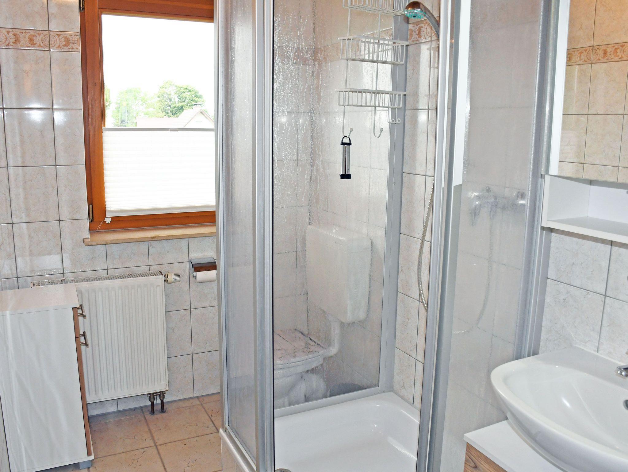 Das moderne Bad ist mit Dusche, WC und Waschtisch ausgestattet und verfügt über Tageslicht.