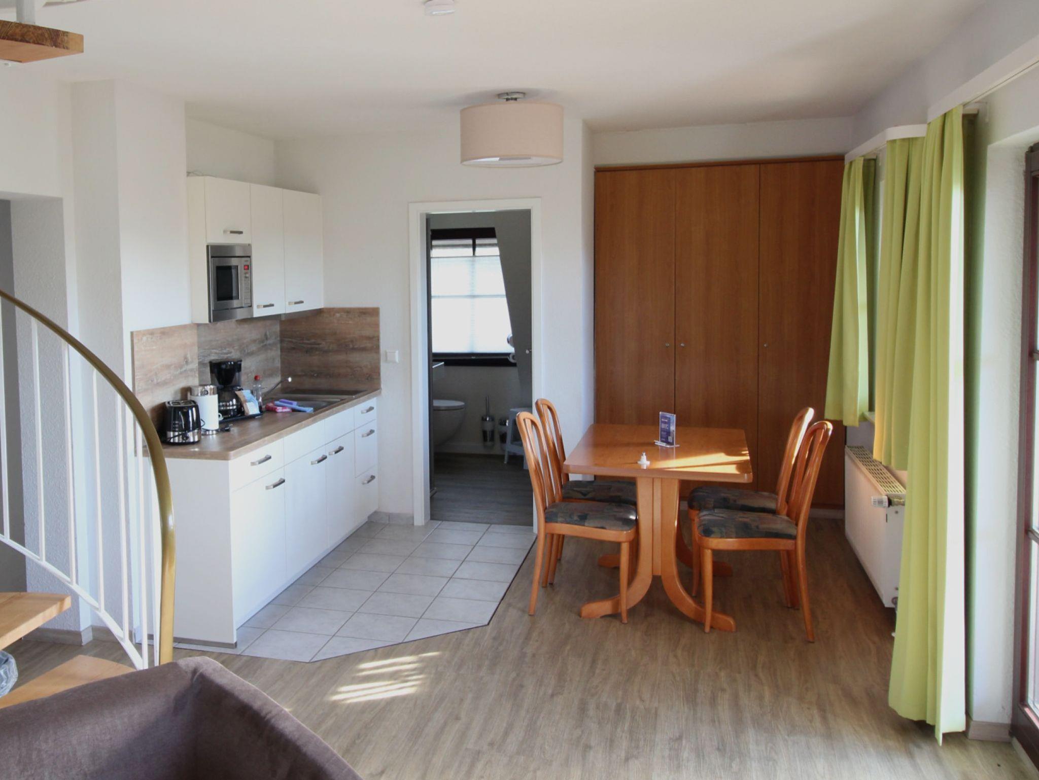 Das 2-Raum Appartement ist komfortabel ausgestattet mit 1 Wohnraum mit Sitzecke (ausziehbare Couch für eine Pers.), Sat.-TV und Telefon, 1 Schlafraum mit Doppelbett, Küchenzeile, Dusche/WC. Lage: Erdgeschoss / Obergeschoss mit Terrasse bzw. Balkon. Darüber hinaus gehört zu jeder Wohnung ein Pkw-Stellplatz. Alle Appartements inklusive Energiekosten, Wasser, Bettwäsche / Handtücher und Endreinigung Babybett und Hochstuhl kostenlos.