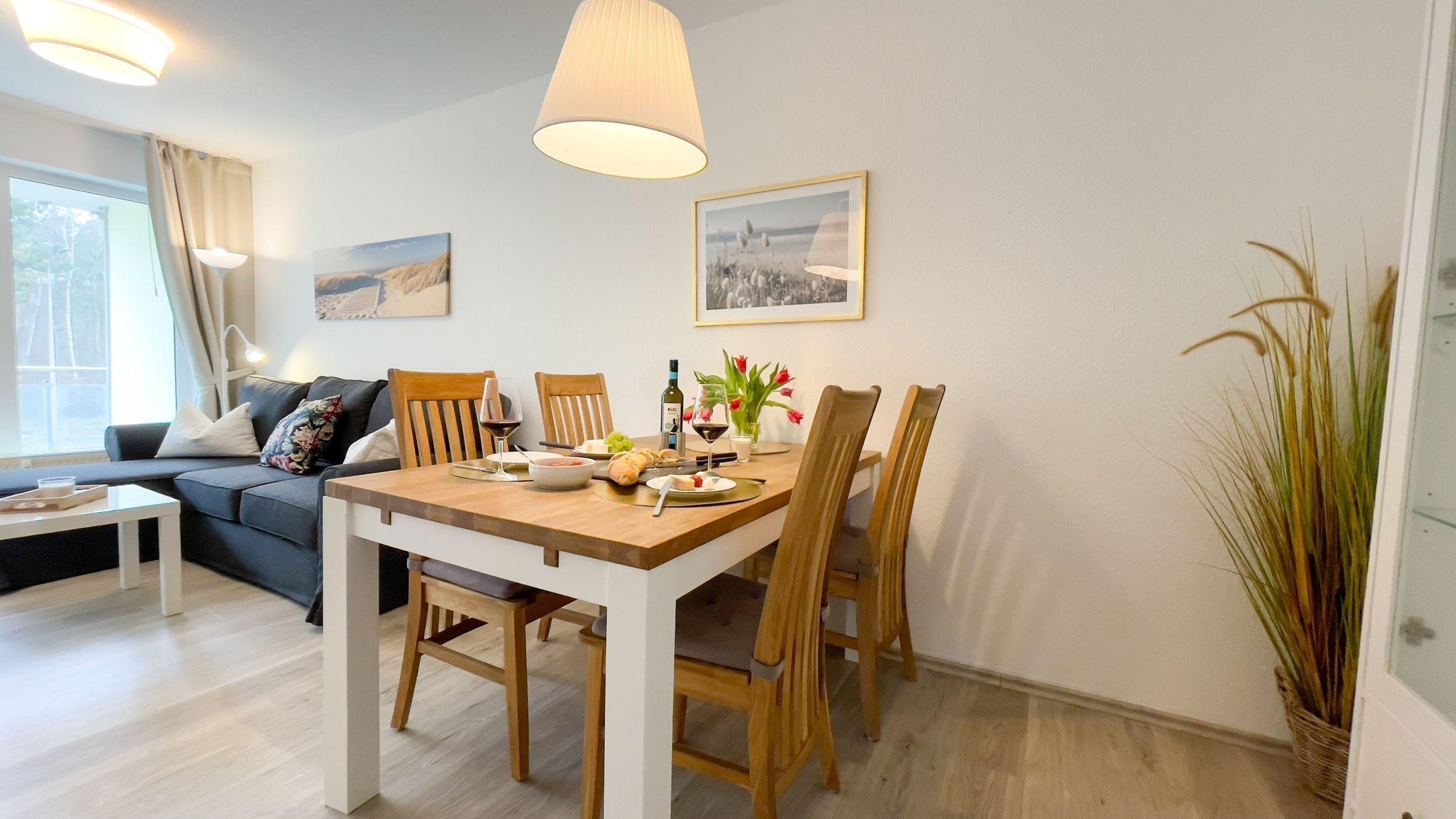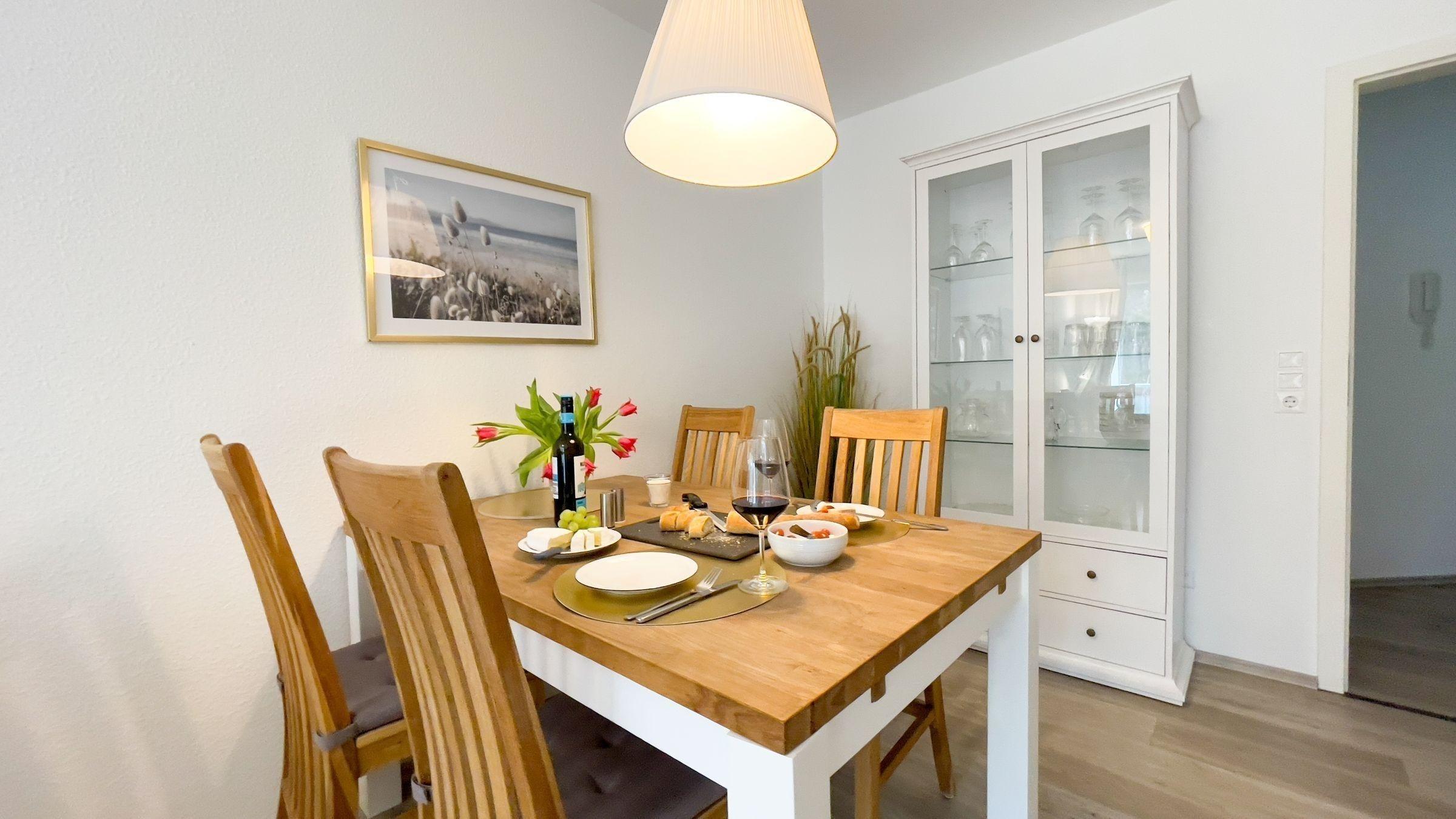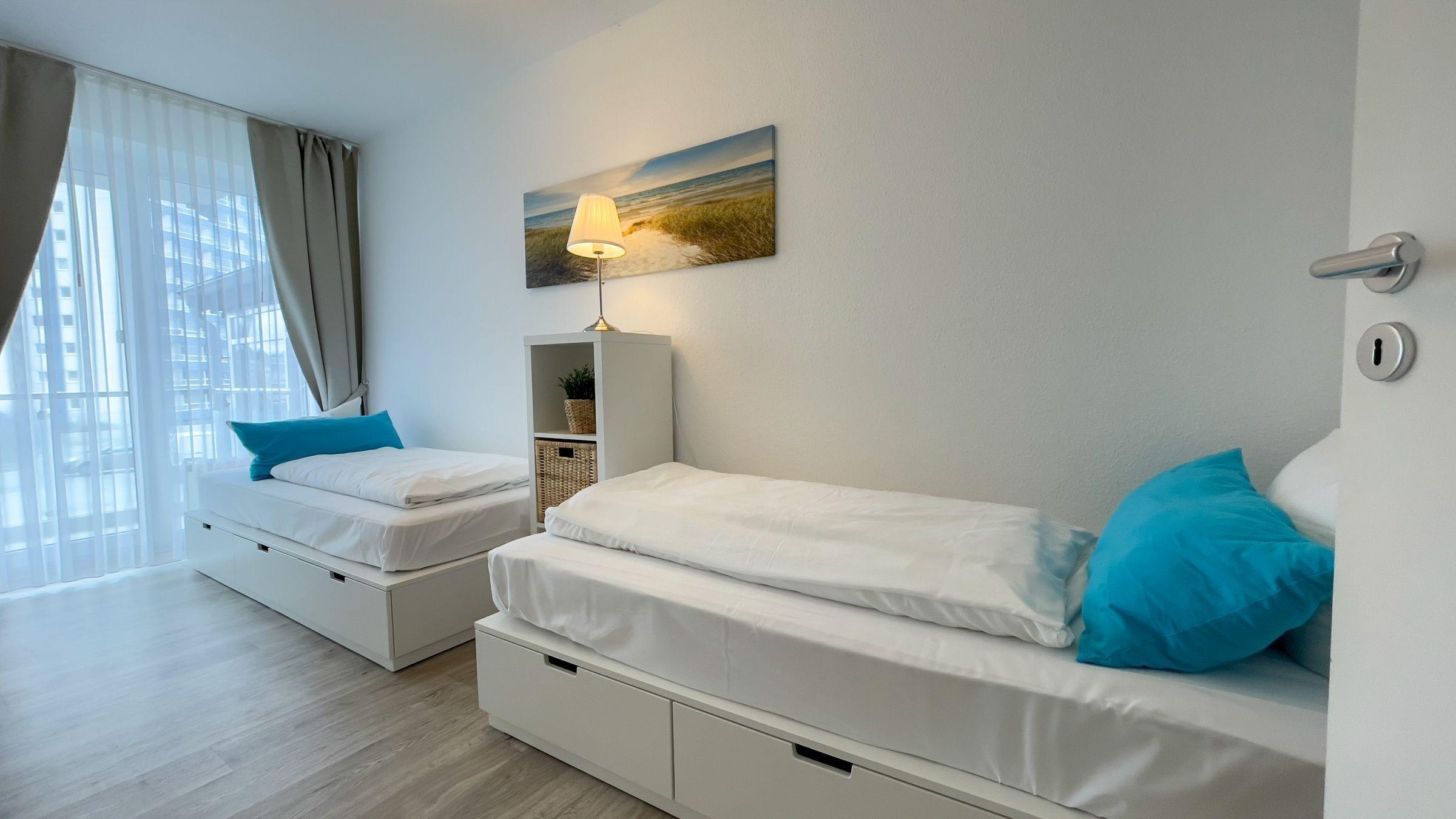 Die gemütliche Ferienwohnung im ersten Stock bietet Platz für bis zu 6 Personen und ist haustierfreundlich. Mit einem Fahrstuhl erreichbar, verfügt die Wohnung über zwei separate Schlafräume: einen mit einem Doppelbett und einen weiteren mit zwei Einzelbetten. Der Wohn-/Schlafraum bietet ein Schlafsofa für zusätzliche Schlafmöglichkeiten sowie eine Essecke. Die separate, voll ausgestattete Küche mit Geschirrspüler lädt zum gemeinsamen Kochen ein. Das renovierte Badezimmer ist mit einer ebenerdigen Dusche ausgestattet und sorgt für Komfort. Zusätzlich steht eine Waschmaschinen-/Trocknerkombination zur Alleinnutzung in der Wohnung zur Verfügung. Fahrräder können im gesicherten Fahrradkeller abgestellt werden. Zwei Balkone bieten wunderschöne Ausblicke, darunter einen seitlichen Meerblick. Die Ferienwohnung befindet sich nur ca. 200 Meter vom Strand entfernt.
