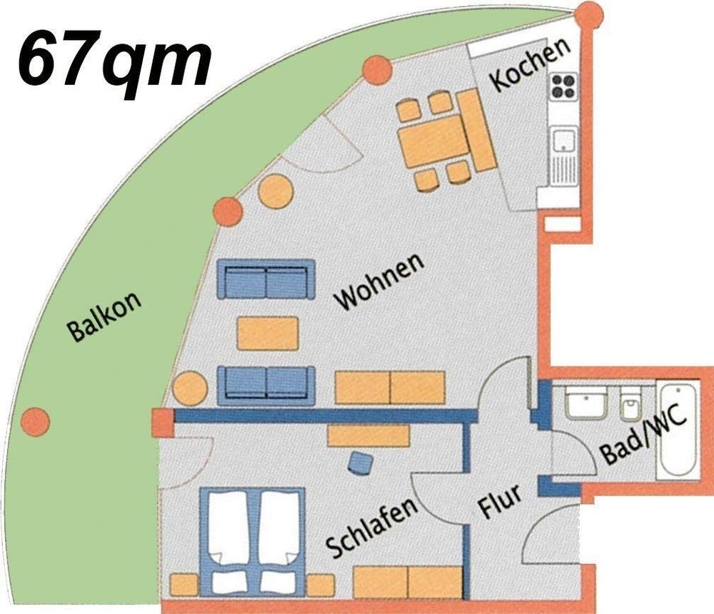 Die exklusive Ferienwohnung in Cuxhaven-Sahlenburg bietet auf 67 qm eine komfortable Unterkunft für bis zu 4 Personen. Die barrierefreie Wohnung befindet sich in der 2. Etage und ist bequem mit einem Fahrstuhl erreichbar. Sie verfügt über ein Schlafzimmer mit einem Doppelbett, ein Wohn-/Schlafzimmer sowie eine vollausgestattete Küchenzeile, die die Zubereitung von Mahlzeiten erleichtert. Das modern gestaltete Badezimmer ist mit einer ebenerdigen Dusche ausgestattet. Ein Höhepunkt der Wohnung ist der große möblierte Rundbalkon, der zum Entspannen einlädt. Für aktive Urlauber steht ein Fahrradkeller zur Verfügung, um Fahrräder sicher abzustellen. Zudem sind im Keller Münz-Waschmaschinen und Trockner vorhanden, die gemeinschaftlich genutzt werden können. Der Strand ist nur 200 m entfernt, was die Lage der Ferienwohnung besonders attraktiv macht.