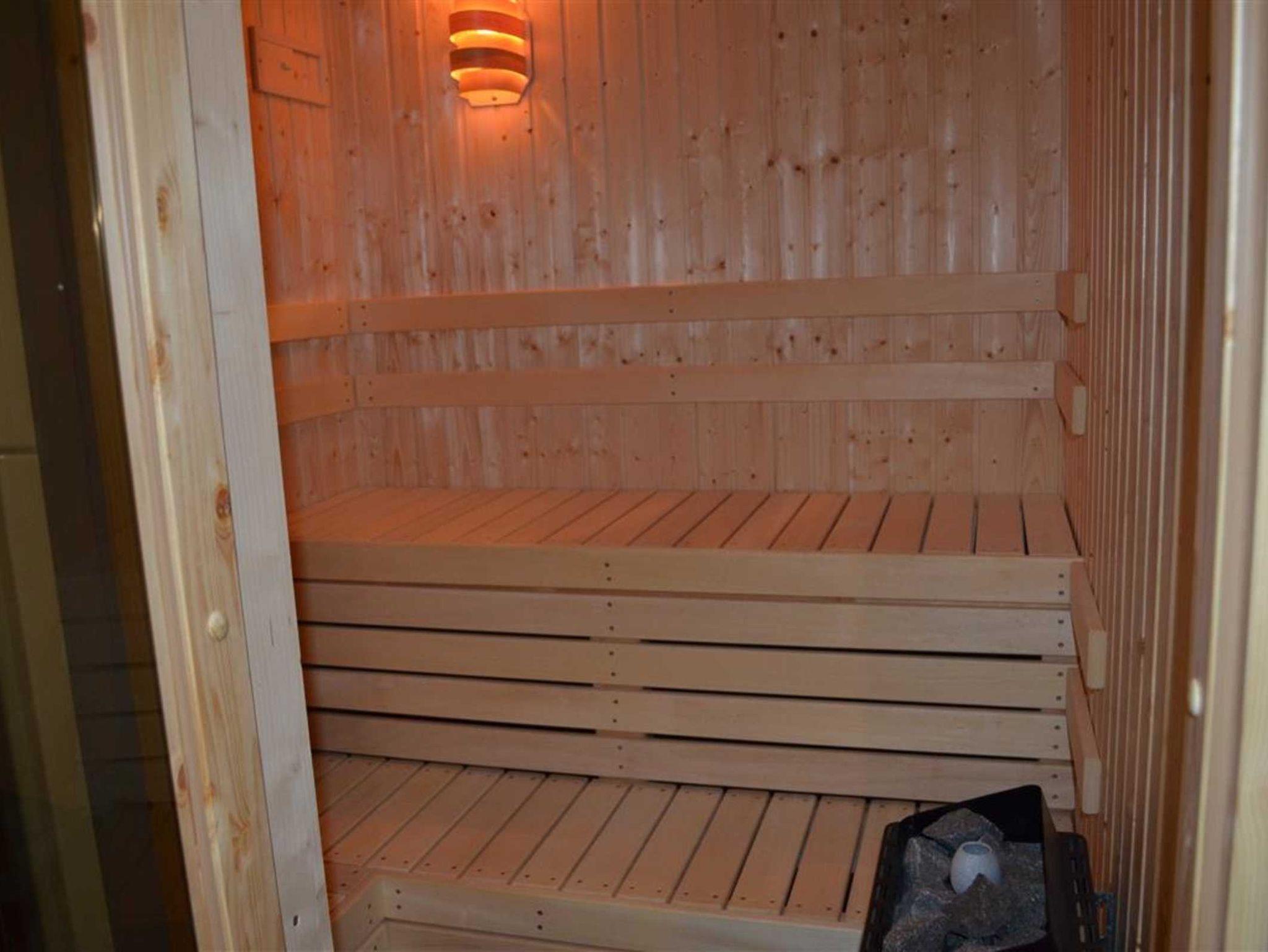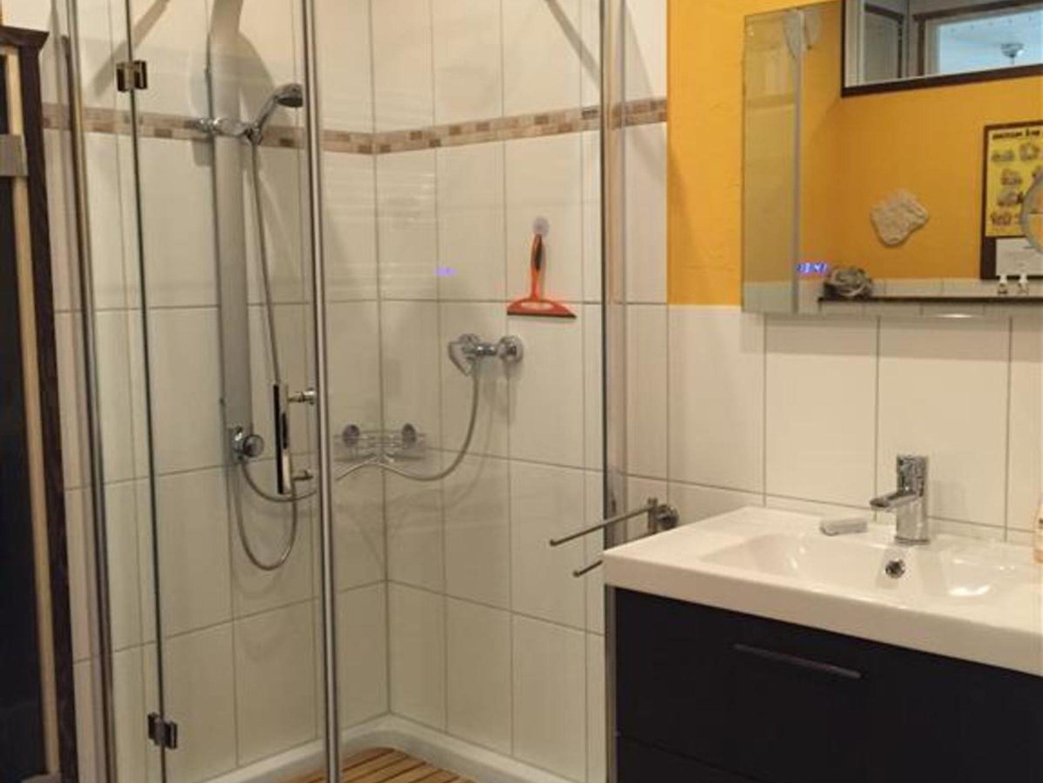 Das Bad ist eingerichtet mit Regenschauer-Dusche, einem Waschtisch mit Unterschrank und Fön, Wand-WC, Spiegel mit Beleuchtung, Uhr und Kosmetikspiegel, Radio. Die Sauna grenzt an das Bad.