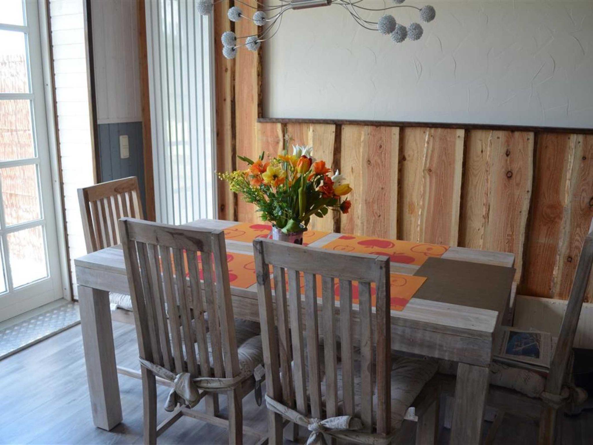 Der rustikal-moderne Wohn- und Essbereich besteht aus Esstisch mit Stühlen und Bank und einem gemütlichen Ecksofa mit Couchtisch und Kaminofen.