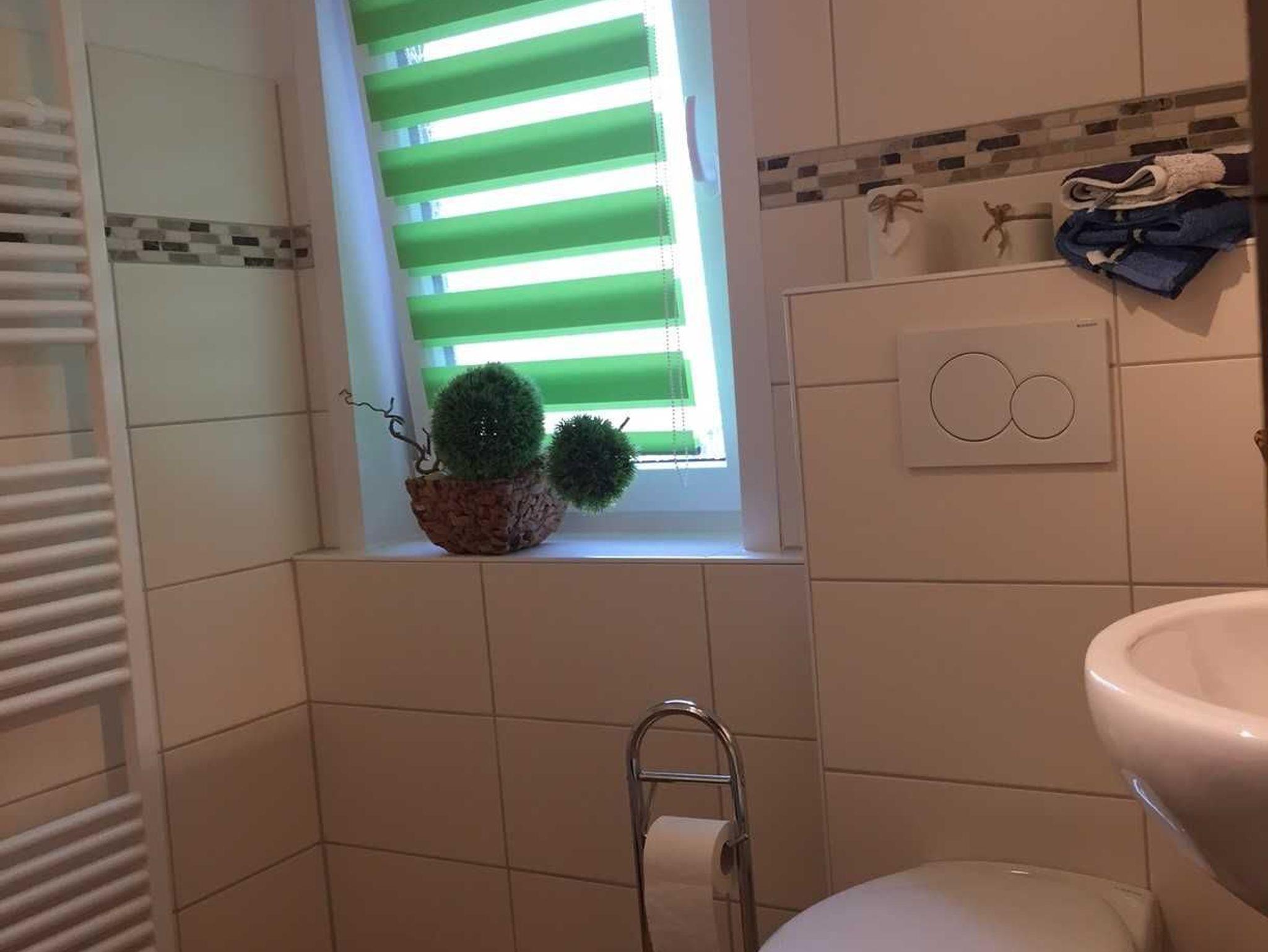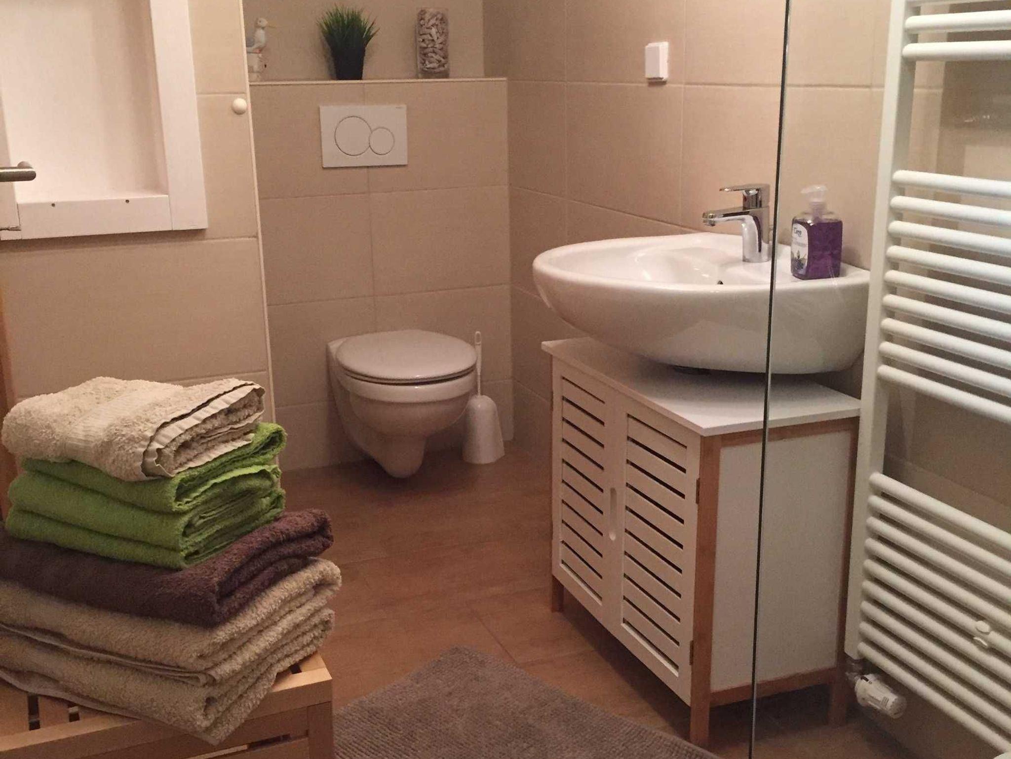 Im Erdgeschoss befindet sich auch das größere der 2 modernen Bäder. Auch dieses Bad ist mit Dusche (ebenerdig begehbar!), Waschplatz und WC ausgestattet.