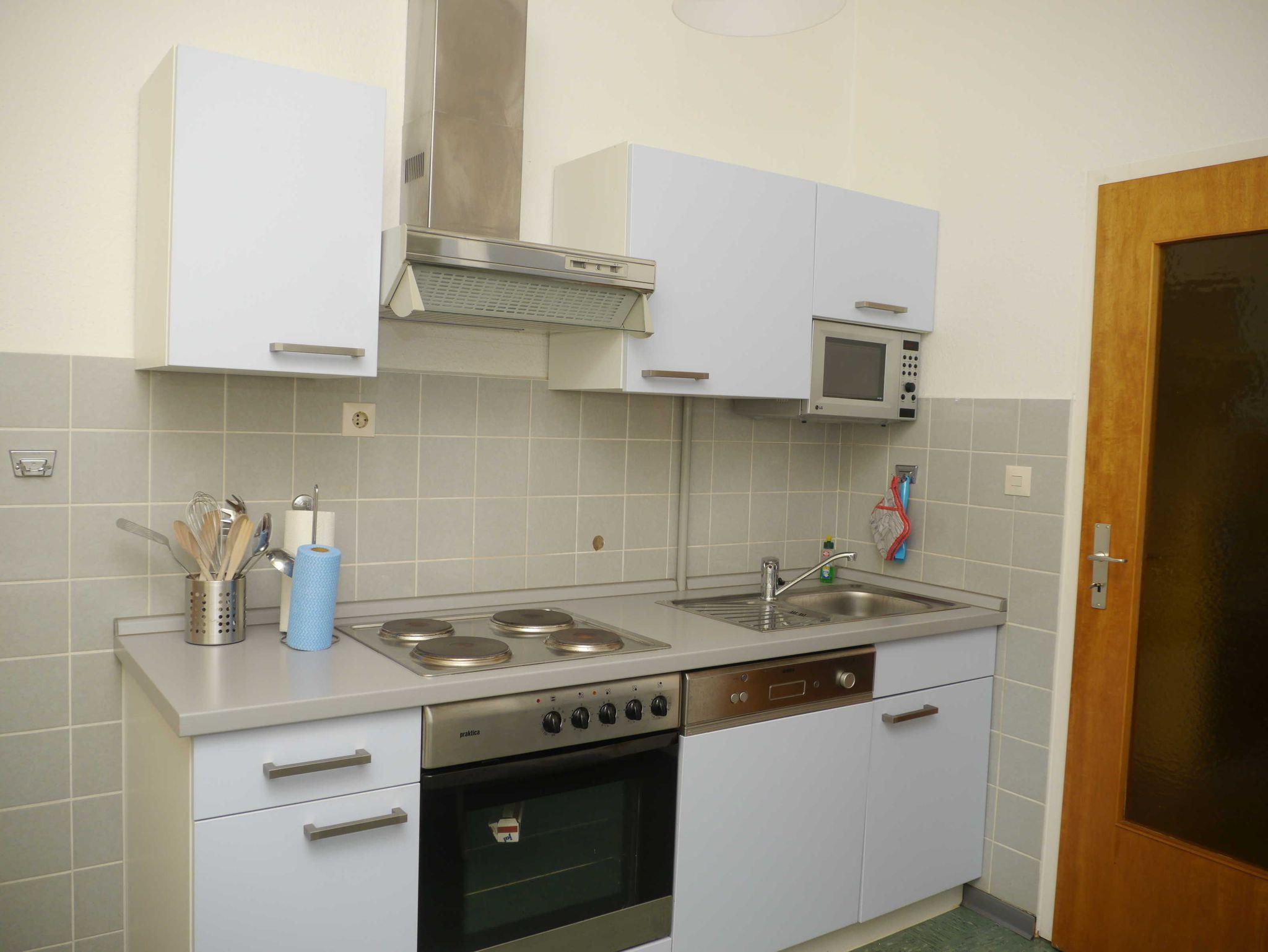 Das Wohnzimmer hat eine Fläche von ca. 25 m². Ein moderner Flachbild-TV und ein DVD-Player sind vorhanden. Die kleine Küche ist voll ausgestattet mit E-Herd, Backofen, Geschirrspüler, Kühlschrank, Kaffeemaschine, Wasserkocher, Toaster, allerlei Küchenhelfern und Utensilien.