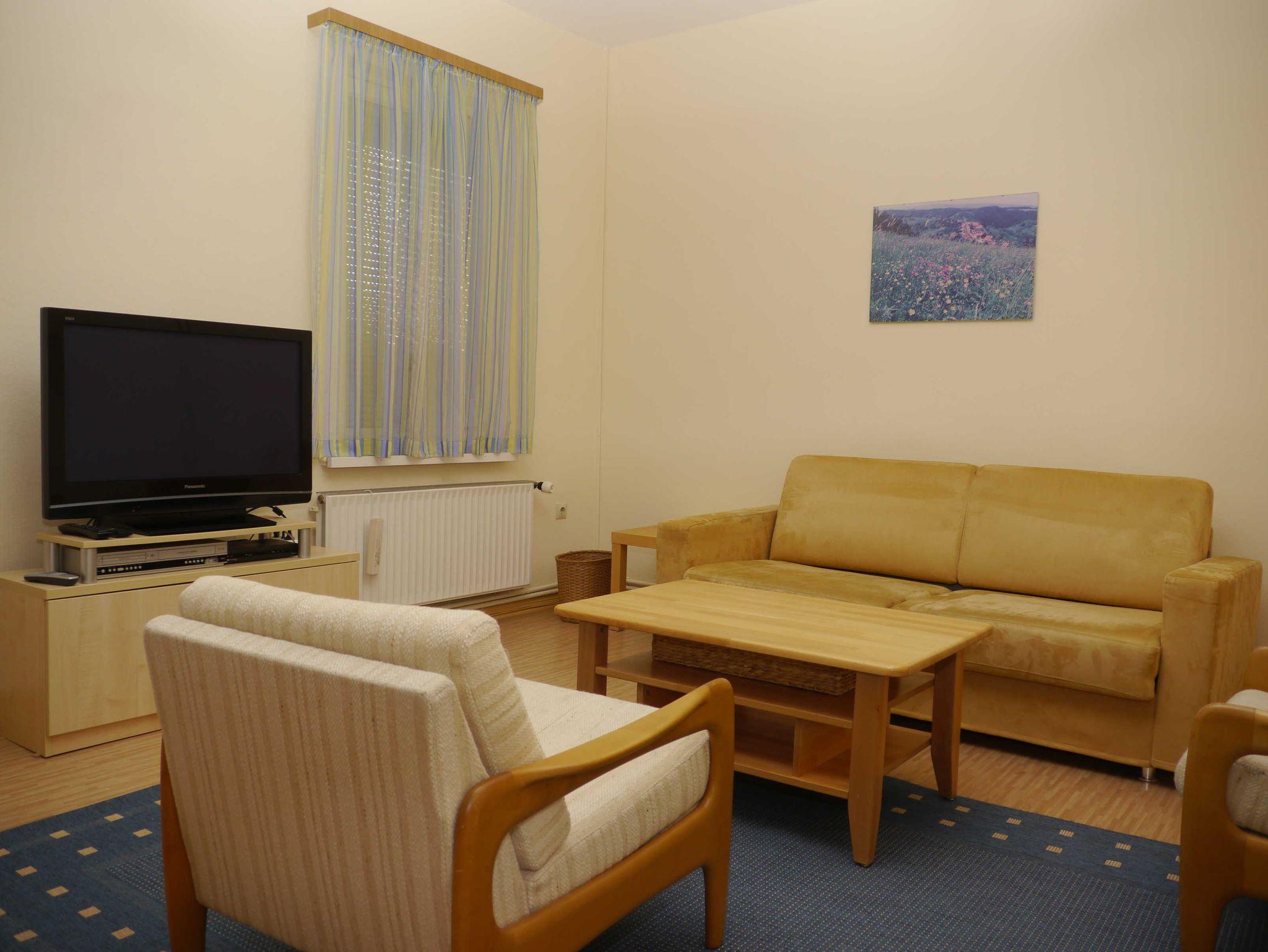 Das Wohnzimmer hat eine Fläche von ca. 26 qm und bietet mit einer Sitzgarnitur und einer Essecke mit ausziehbarem Esstisch genügend Raum für 4 Personen. Kabelfernsehen, Radio, Video- und DVD-Player sind vorhanden.